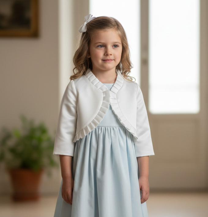 Il bolerino mostrato nell'immagine è un elegante coprispalle cerimoniale, ideale per occasioni formali come matrimoni o prime comunioni. Di color bianco candido in tessuto raso. Le maniche hanno il taglio a tre quarti, che conferisce un aspetto raffinato e moderno. Il dettaglio più distintivo è la bordatura a plissé che corre lungo tutta l'apertura frontale e il girocollo, creando un effetto a balze molto delicato. Aperto sul davanti (senza bottoni), progettato per essere indossato sopra un abito senza nasconderne i dettagli del corpetto. Corta alla vita (stile "cropped"), tipica del bolero, per slanciare la figura e dare risalto alla gonna dell'abito sottostante.