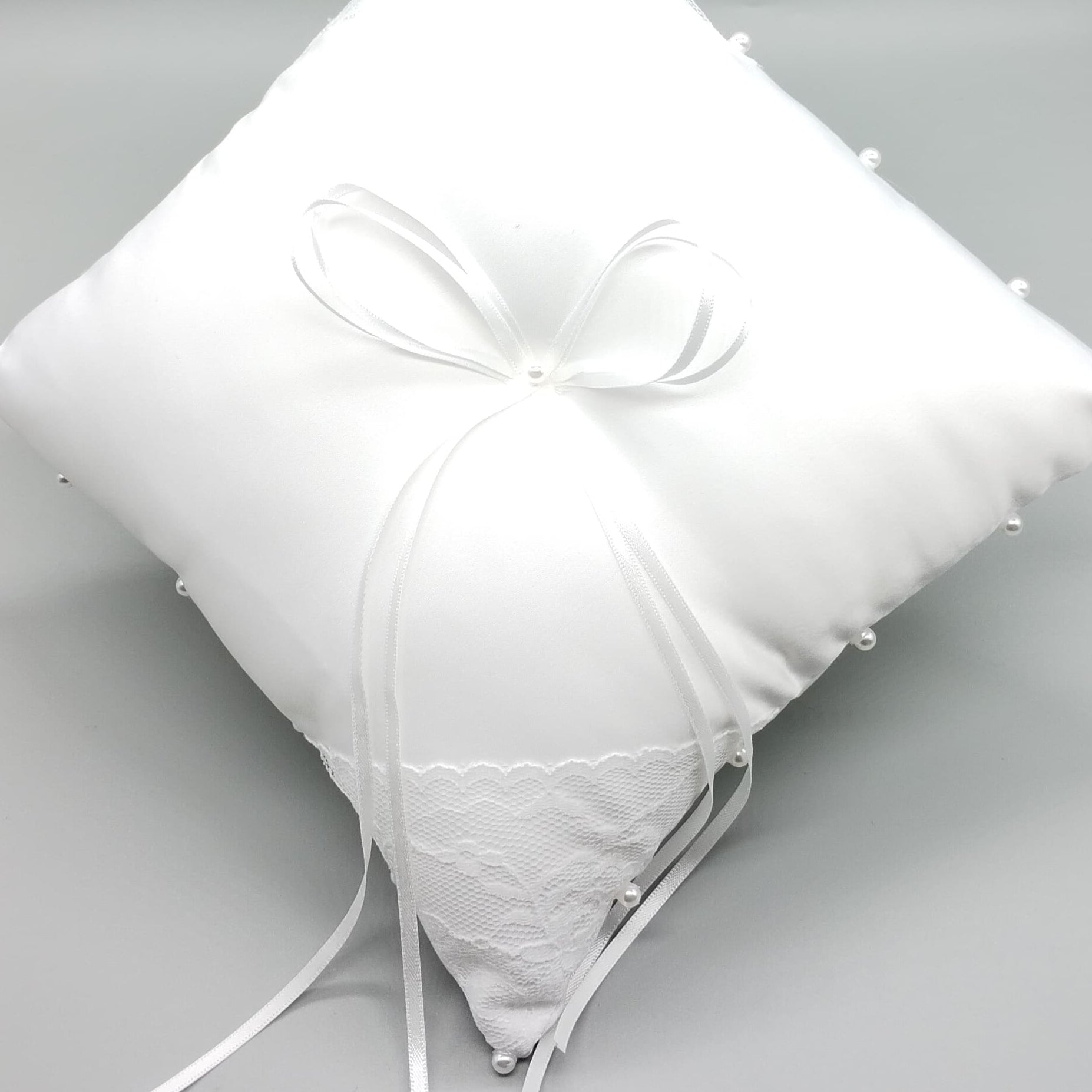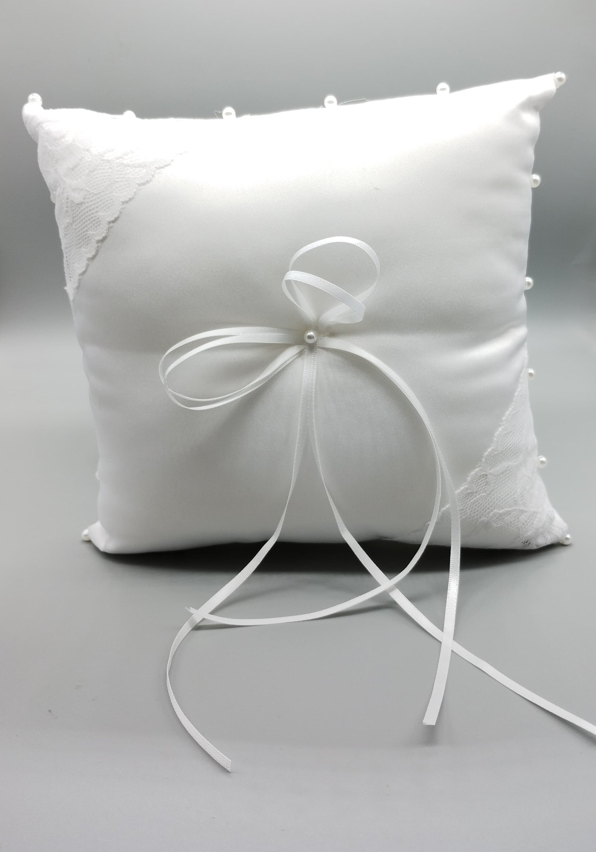 Cuscino porta fedi in tessuto raso color bianco, decorazioni in pizzo su due angoli, perle sui lati e piccolo fiocco centrale