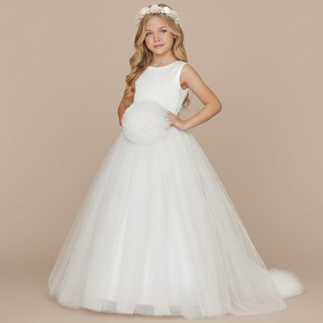 L'abito color bianco delicato presenta un corpetto in tessuto raso liscio e lucido senza maniche contrasta con la gonna molto voluminosa, in stile principessa, realizzata con diversi strati di tulle leggero, che le conferisce un aspetto etereo e un grande volume. Il vestito ha un grande dettaglio in vita. Si tratta di un'applicazione floreale molto grande e tridimensionale, dello stesso colore rosa della gonna, che funge da cintura o fascia decorativa. È un abito lungo adatto per damigella o cerimonie