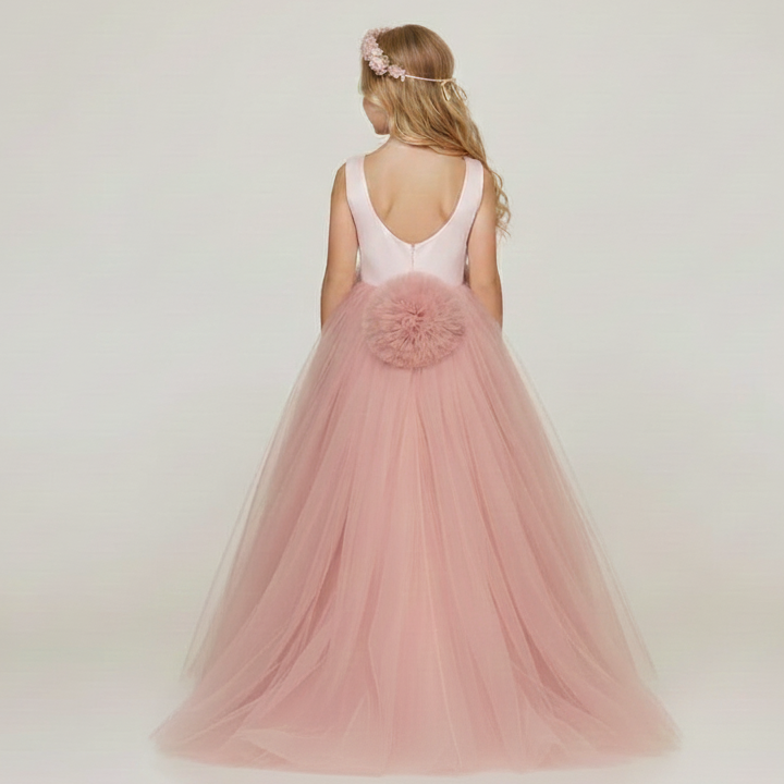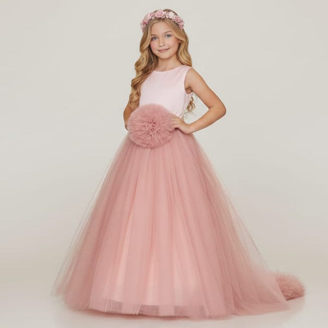 L'abito è di un bellissimo rosa cipria un tono delicato e sofisticato. Il corpetto in tessuto raso liscio e lucido senza maniche contrasta con la gonna molto voluminosa, in stile principessa, realizzata con diversi strati di tulle leggero, che le conferisce un aspetto etereo e un grande volume. Il vestito ha un grande dettaglio in vita. Si tratta di un'applicazione floreale molto grande e tridimensionale, dello stesso colore rosa della gonna, che funge da cintura o fascia decorativa. È un abito lungo adatto per damigella e cerimonie