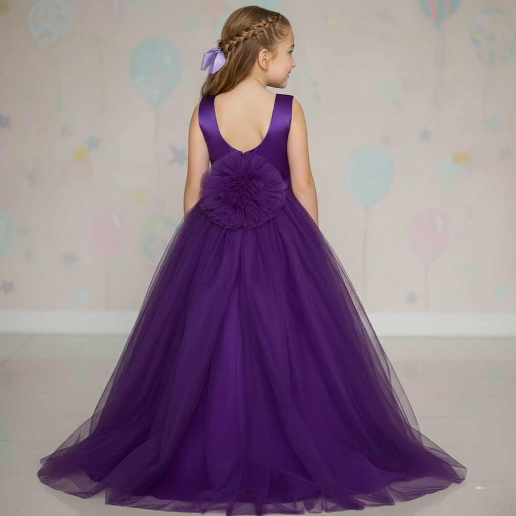 L'abito color viola acceso presenta un corpetto in tessuto raso liscio e lucido senza maniche contrasta con la gonna molto voluminosa, in stile principessa, realizzata con diversi strati di tulle leggero, che le conferisce un aspetto etereo e un grande volume. Il vestito ha un grande dettaglio in vita. Si tratta di un'applicazione floreale molto grande e tridimensionale, dello stesso colore rosa della gonna, che funge da cintura o fascia decorativa. È un abito lungo adatto per eventi formali, feste o cerimonie