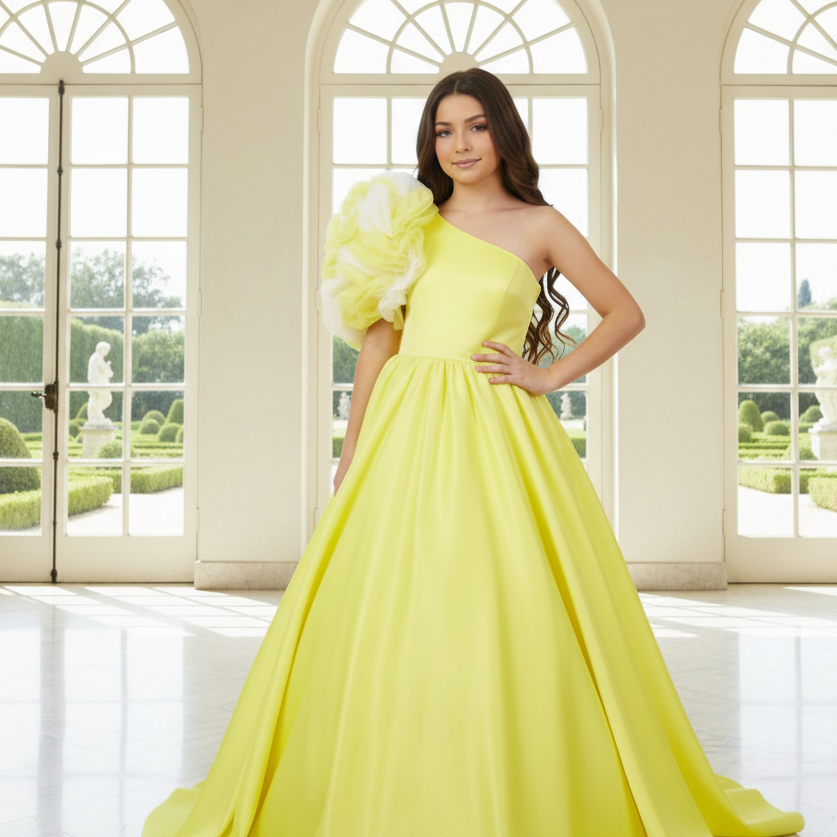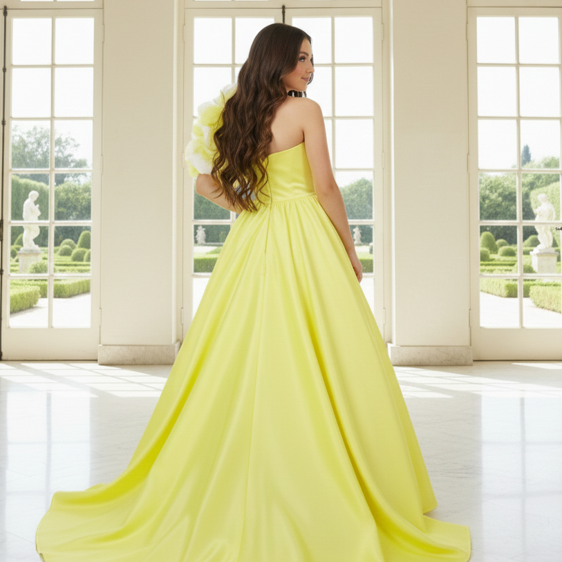 L'abito di colore giallo è un modello da cerimonia o da damigella d'onore con un taglio classico e principesco. Corpetto semplice e sartoriale, con un tessuto raso liscio, presenta un design a girocollo e senza maniche. Sulla spalla destra è applicato un piccolo e delicato ornamento che aggiunge un tocco di eleganza e morbidezza. In vita una piccola decorazione con cristalli impreziosisce e rende l'abito elegante. La gonna è molto voluminosa e lunga fino a terra in perfetto stile principessa ed è realizzata con strati di tulle che creano un effetto vaporoso. L'abito comunica un'atmosfera fiabesca e sofisticata, ideale per un evento formale o per essere indossato in cerimonie come comunioni o cresime.