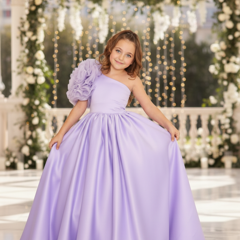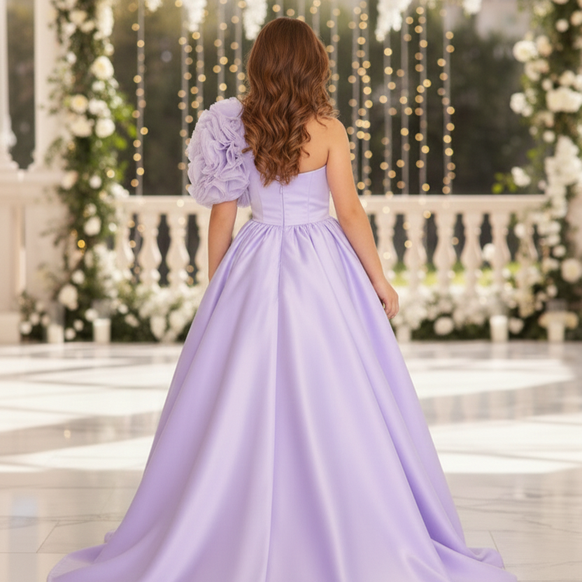 L'abito di colore lavanda/lilla è un modello da cerimonia o da damigella d'onore con un taglio classico e principesco. Corpetto semplice e sartoriale, con un tessuto raso liscio, presenta un design a girocollo e senza maniche. Sulla spalla destra è applicato un piccolo e delicato ornamento che aggiunge un tocco di eleganza e morbidezza. In vita una piccola decorazione con cristalli impreziosisce e rende l'abito elegante. La gonna è molto voluminosa e lunga fino a terra in perfetto stile principessa ed è realizzata con strati di tulle che creano un effetto vaporoso. L'abito comunica un'atmosfera fiabesca e sofisticata, ideale per un evento formale o per essere indossato in cerimonie come comunioni o cresime.