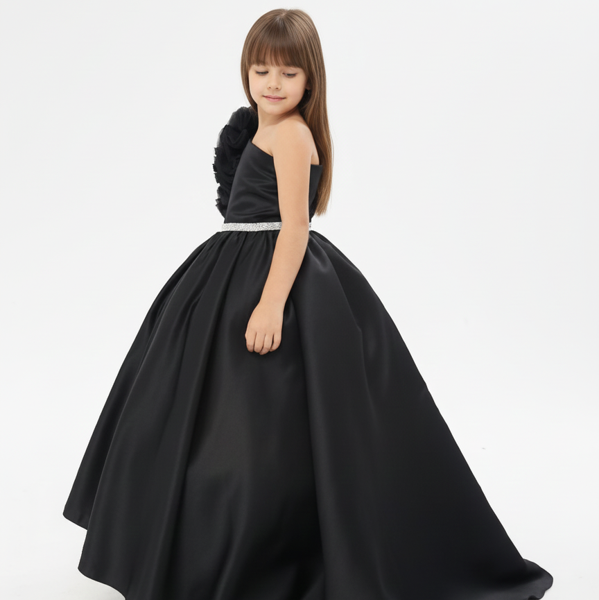L'abito di colore nero è un modello da cerimonia o da damigella d'onore con un taglio classico e principesco. Corpetto semplice e sartoriale, con un tessuto raso liscio, presenta un design a girocollo e senza maniche. Sulla spalla destra è applicato un piccolo e delicato ornamento che aggiunge un tocco di eleganza e morbidezza. In vita una piccola decorazione con cristalli impreziosisce e rende l'abito elegante. La gonna è molto voluminosa e lunga fino a terra in perfetto stile principessa ed è realizzata con strati di tulle che creano un effetto vaporoso. L'abito comunica un'atmosfera fiabesca e sofisticata, ideale per un evento formale o per essere indossato in cerimonie.