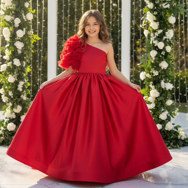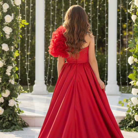 L'abito di colore rosso è un modello da cerimonia o da damigella d'onore con un taglio classico e principesco. Corpetto semplice e sartoriale, con un tessuto raso liscio, presenta un design a girocollo e senza maniche. Sulla spalla destra è applicato un piccolo e delicato ornamento che aggiunge un tocco di eleganza e morbidezza. In vita una piccola decorazione con cristalli impreziosisce e rende l'abito elegante. La gonna è molto voluminosa e lunga fino a terra in perfetto stile principessa ed è realizzata con strati di tulle che creano un effetto vaporoso. L'abito comunica un'atmosfera fiabesca e sofisticata, ideale per un evento formale o per essere indossato in cerimonie.