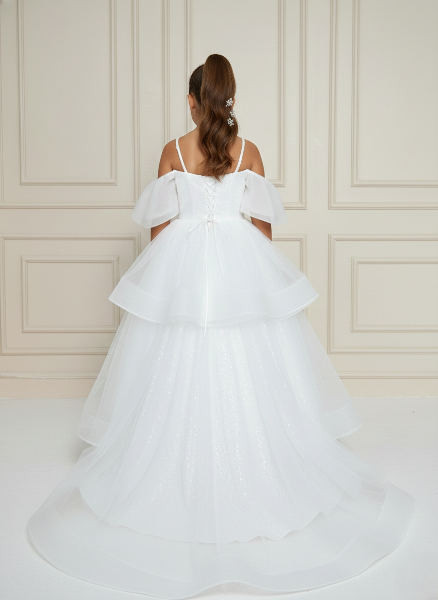 L'abito di colore bianco ha il corpetto in tulle leggero che crea delle balze donando movimento, le spalline sono sottili creando una scollatura a barchetta. La caratteristica distintiva sono le maniche a sbuffo realizzate in un tessuto di organza che un tocco romantico e fiabesco all'abito. La gonna è molto ampia e voluminosa (a balze), in stile principessa.È composta da diversi strati: Lo strato superiore è di tulle leggero, lo strato sottostante è realizzato con un tessuto ricco di glitter e paillettes bianche che conferiscono una notevole brillantezza. L'abito include un piccolo strascico in tulle leggero sul retro, che contribuisce ulteriormente all'effetto regale. Adatto per eventi formali, cerimonie, comunioni o cresime.