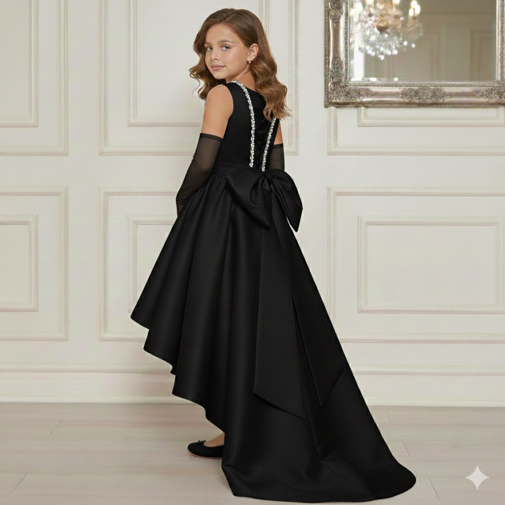 L'abito elegante e formale, di colore nero ha uno scollo rotondo, impreziosito da una una passamaneria brillante con strass. La parte superiore è aderente e senza maniche. La gonna è molto ampia e presenta un design asimmetrico (high-low), più corta sul davanti e si allunga con uno strascico sul retro. Tessuto lucido e strutturato in mikado, che conferisce volume e un drappeggio importante alla gonna. Sul retro, all'altezza della vita, è presente un grande e voluminoso fiocco. La bambina indossa anche guanti lunghi di tulle trasparente di colore nero.