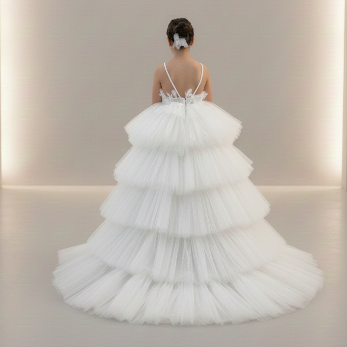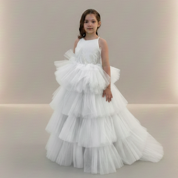 L'abito è un vestito da cerimonia lungo per bambina, caratterizzato da un voluminoso design a balze in tulle, di un colore bianco candido. Il corpetto in tessuto leggermente plissettato. Con scollo alto che si allaccia dietro il collo, lasciando le spalle e la schiena scoperte. Nella parte della vita troviamo applicazioni bianche che ricordano delle piume. La caratteristica principale è la gonna a tutto volume, composta da numerosi strati e balze di tulle che creano un effetto vaporoso. Le balze si sovrappongono e si estendono fino a terra, con un accenno di strascico sul retro. Lo stile è molto elegante e festivo, perfetto per eventi speciali come matrimoni, prime comunioni o cerimonie.