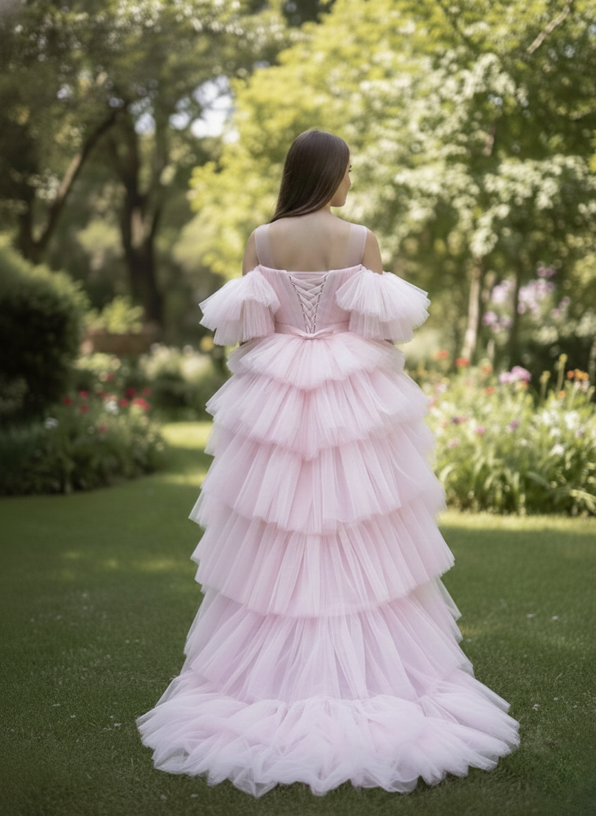L'abito di color rosa chiaro presenta uno scollo delicato in tulle trasparente sul décolleté. Maniche corte che lasciano scoperete le spalle sono voluminose e con balze in tulle che richiamano il vestito, corto sul davanti con una lunga coda dietro per eventi raffinati o cerimonie.