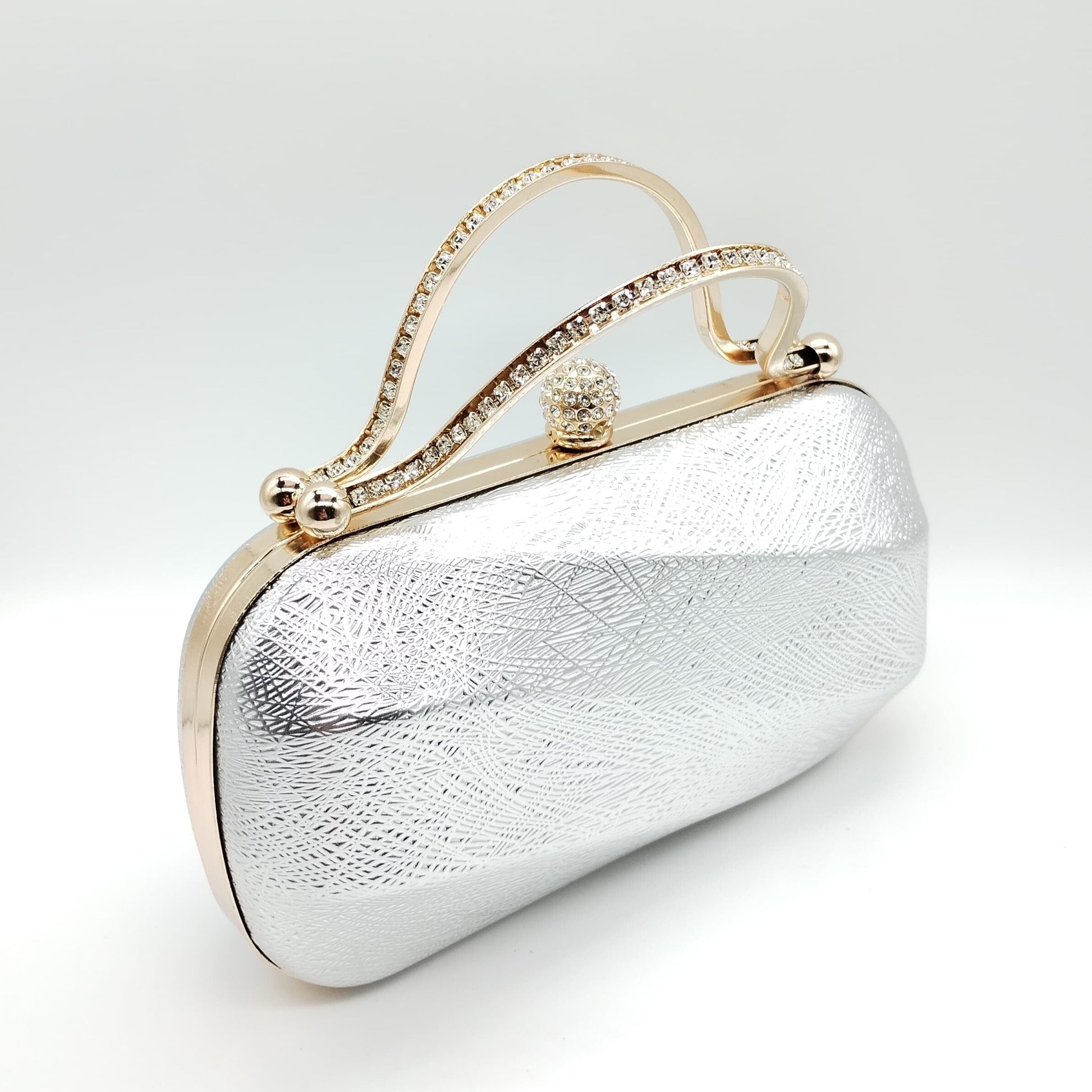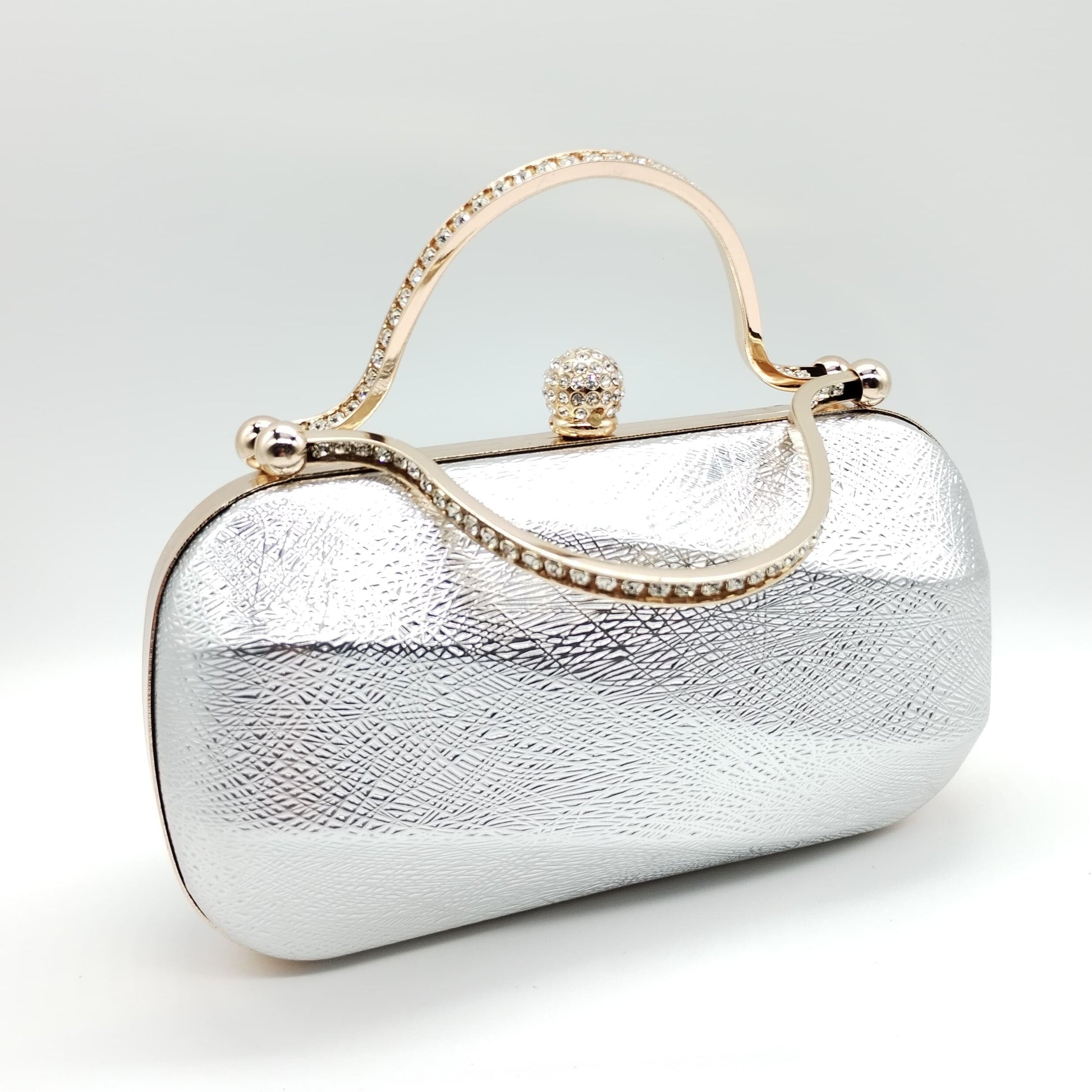 Borsetta da cerimonia rigida in tessuto color argento, manichetto esterno color oro con strass e tracolla interna e removibile