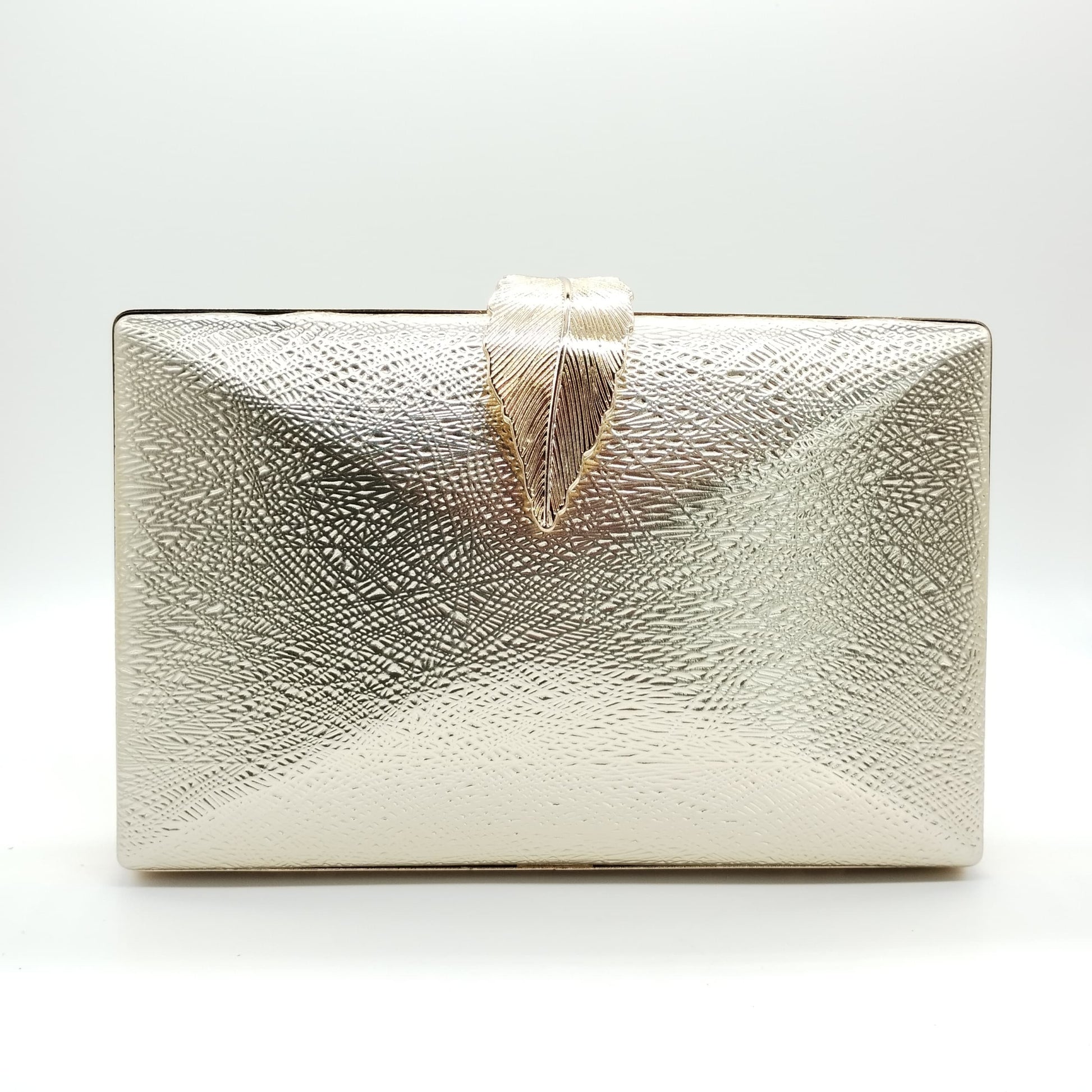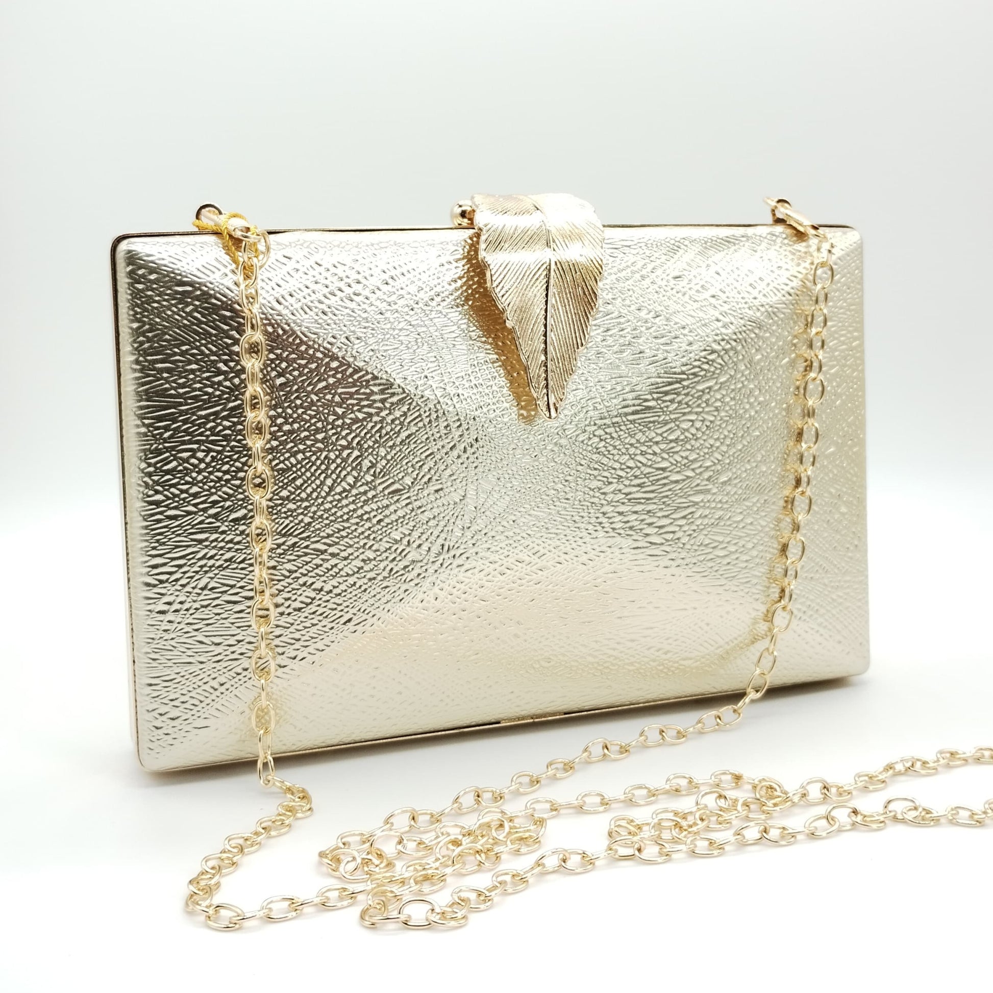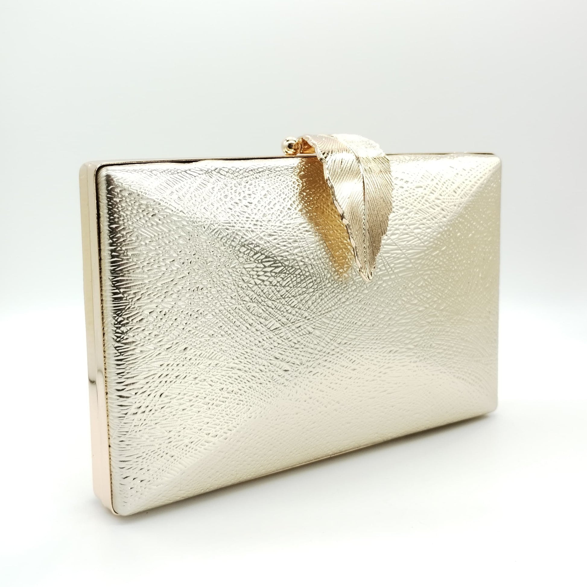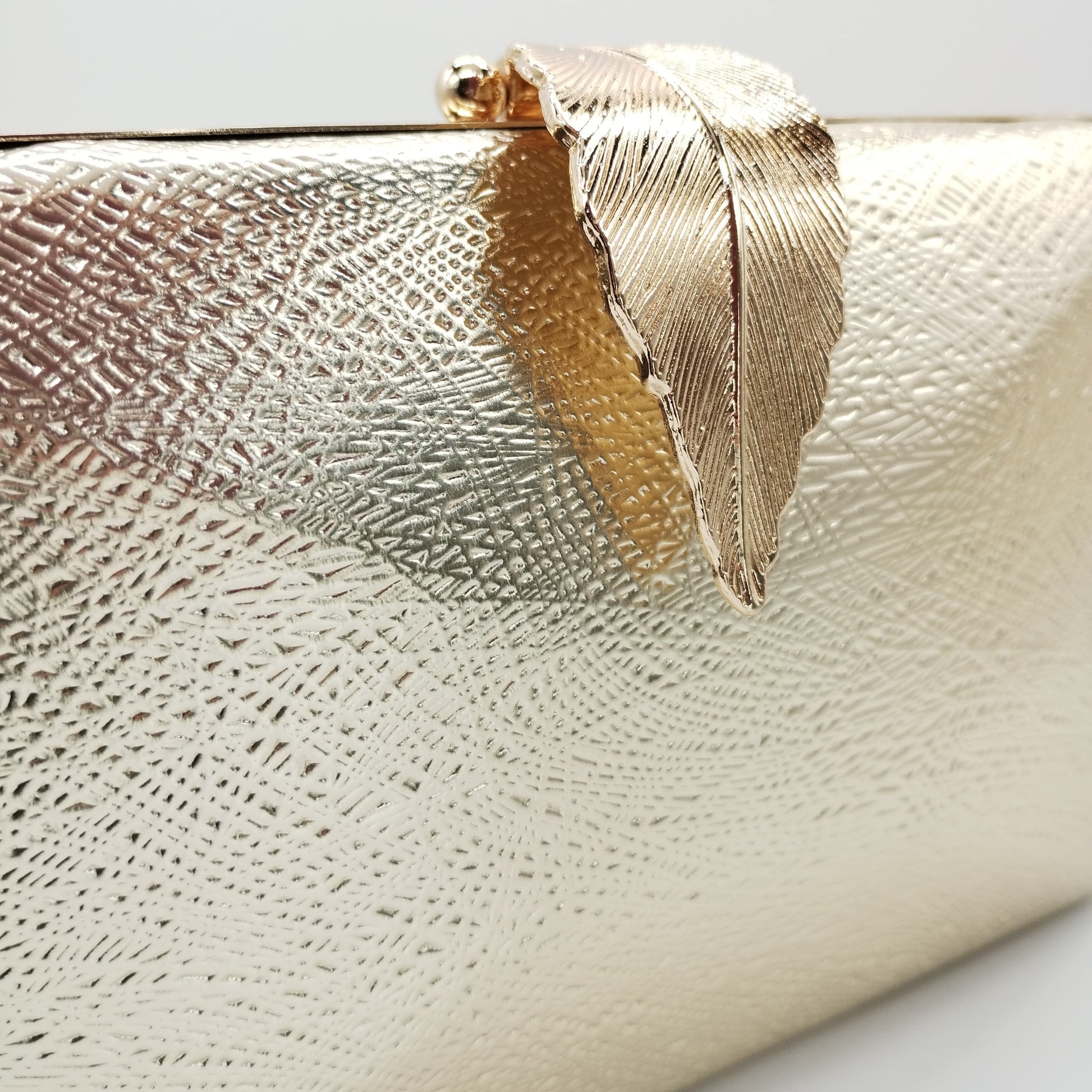 Borsetta da cerimonia rigida color oro con chiusura foglia in oro e tracolla interna e removibile