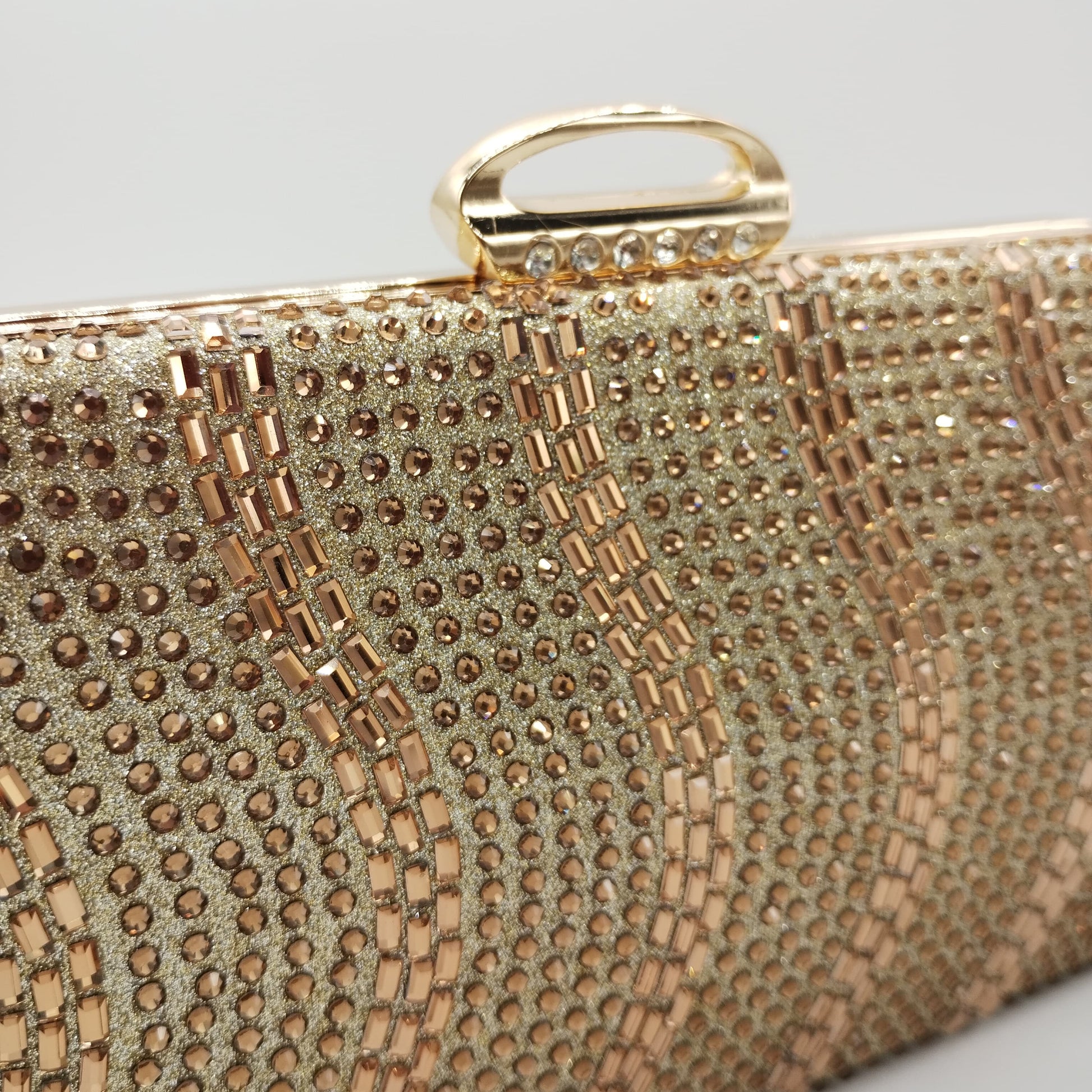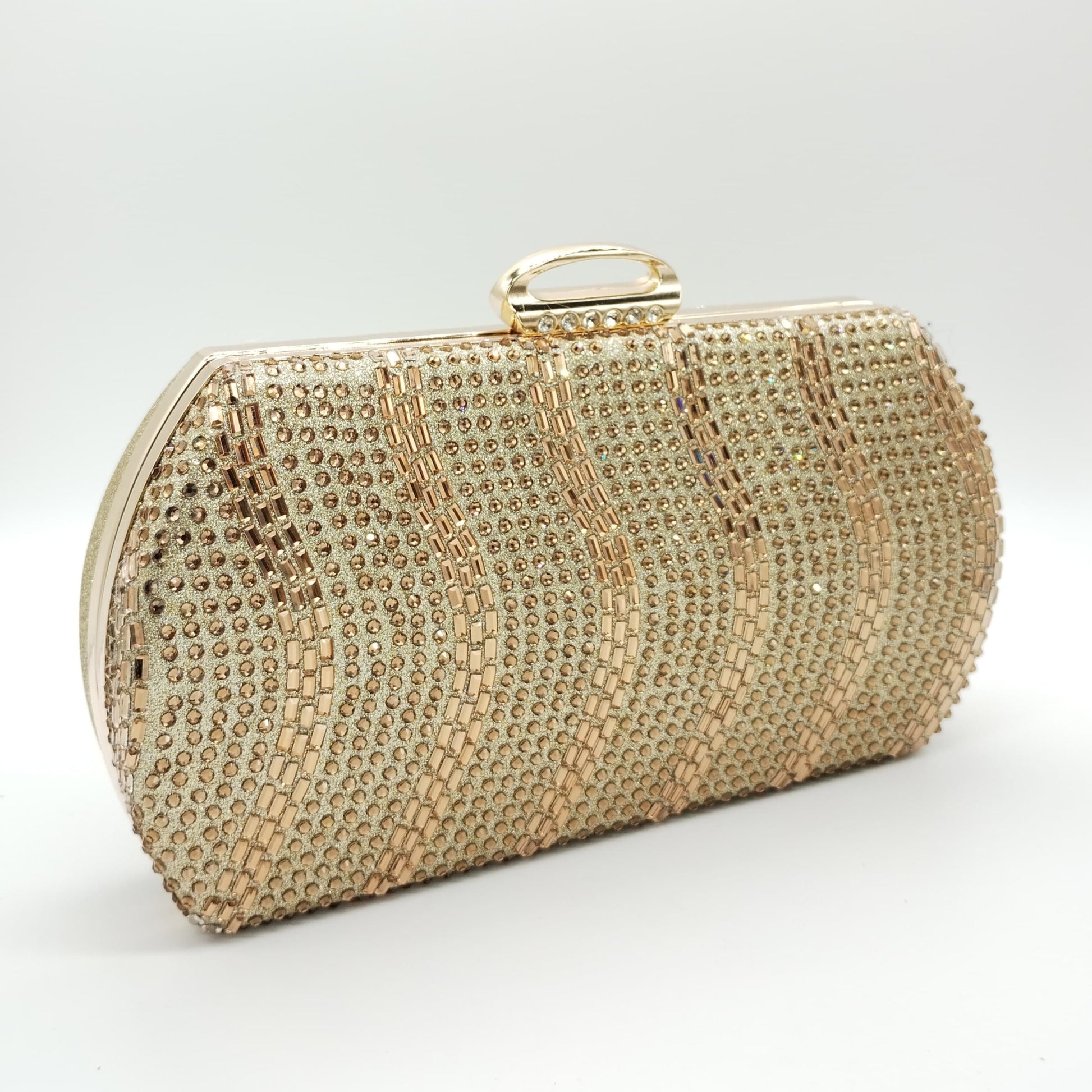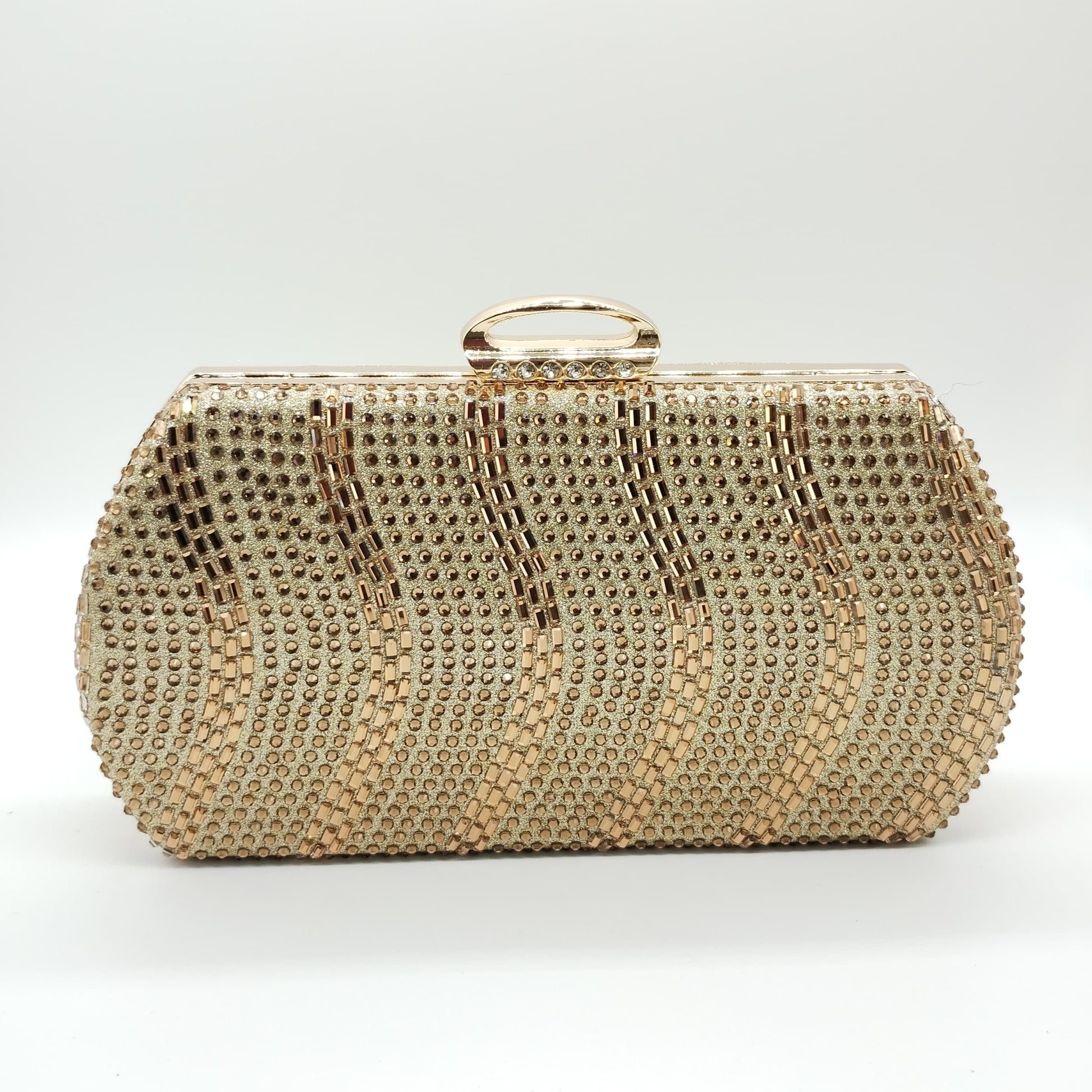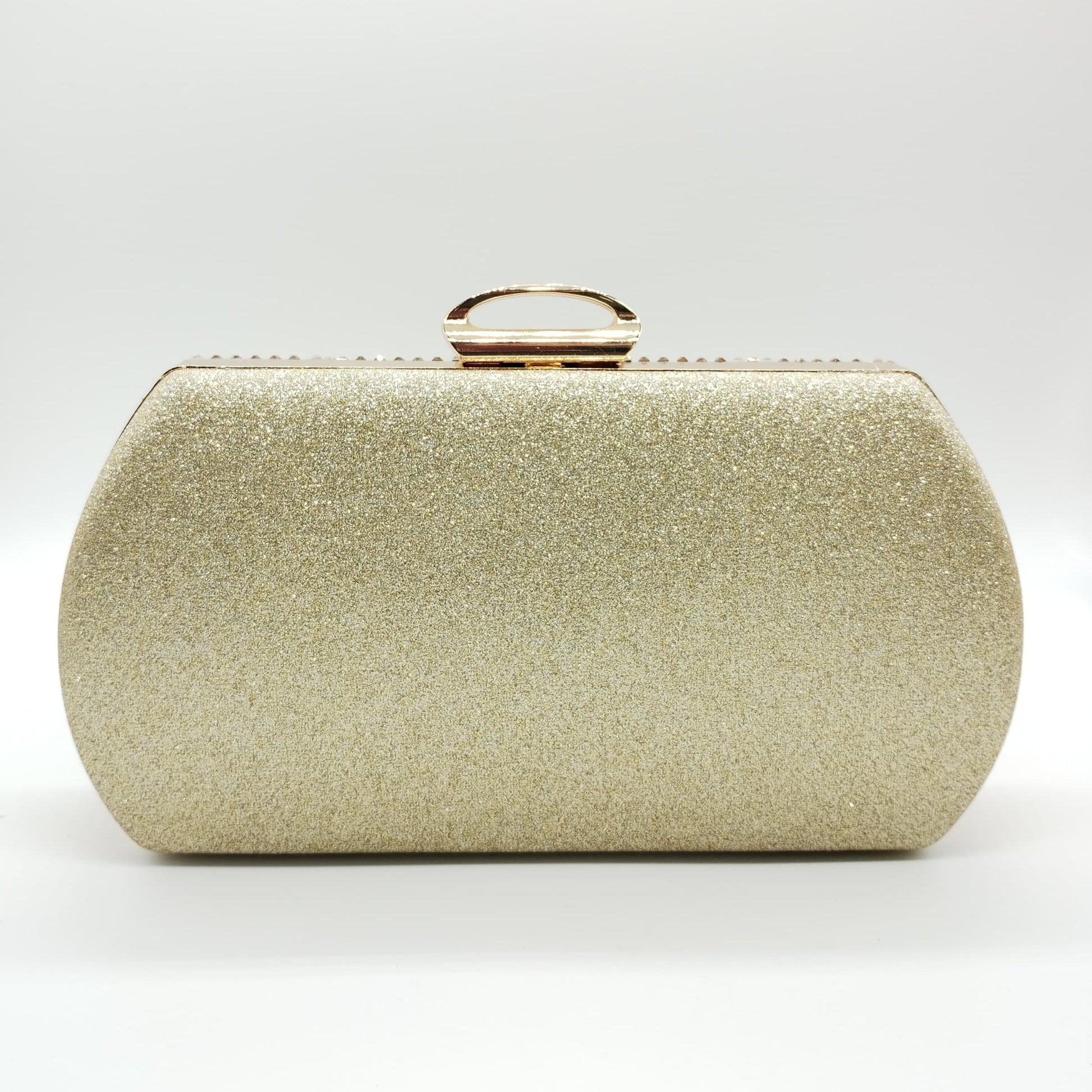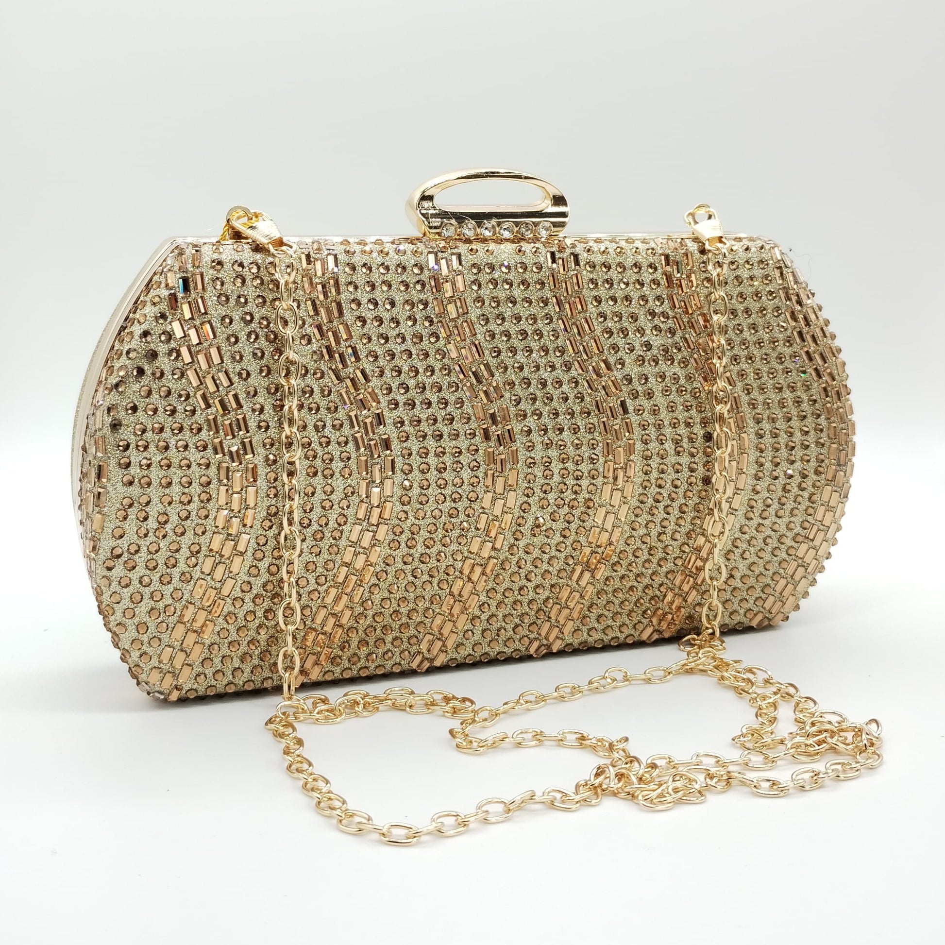 Borsetta da cerimonia rigida in tessuto brillante color oro strass in tinta e tracolla interna e removibile
