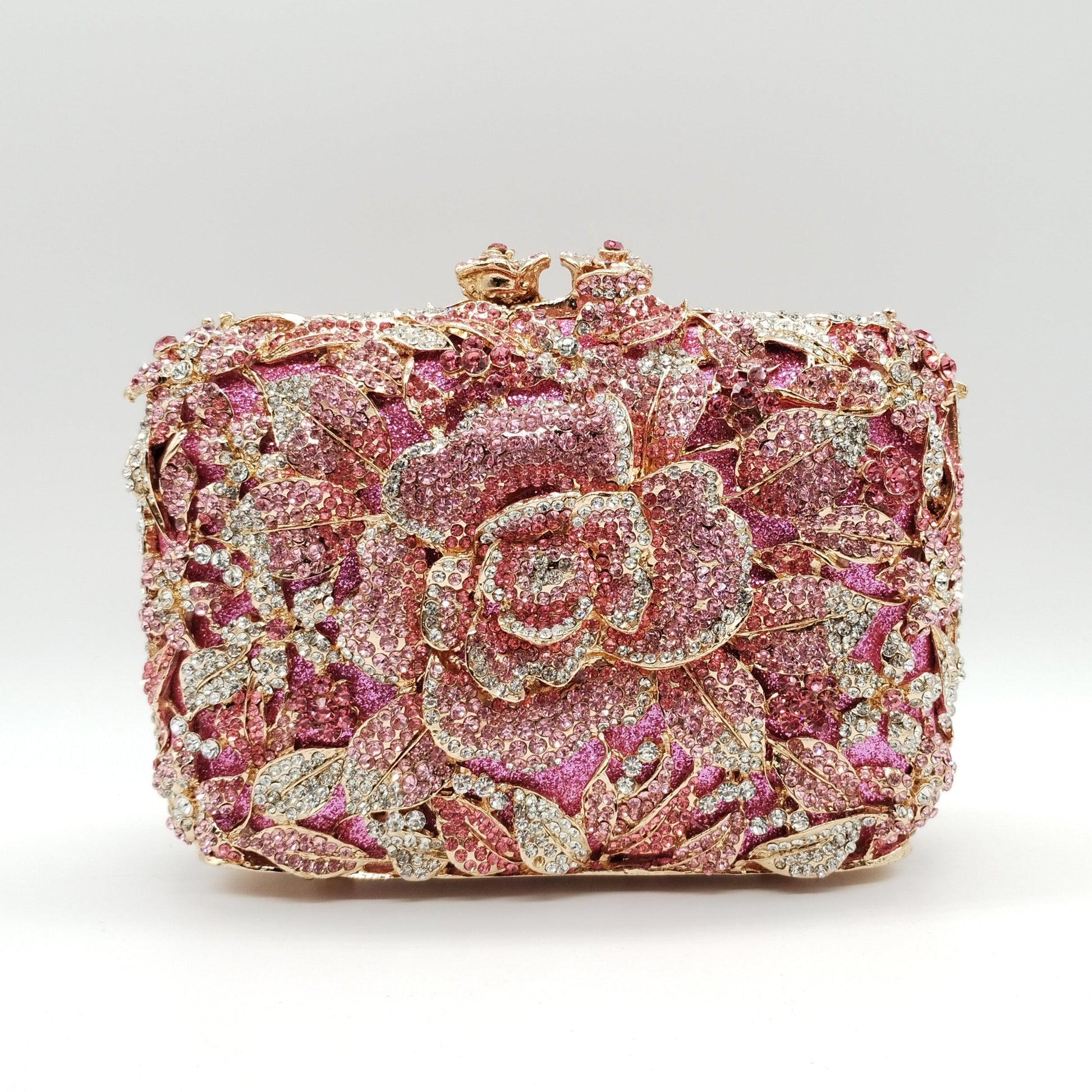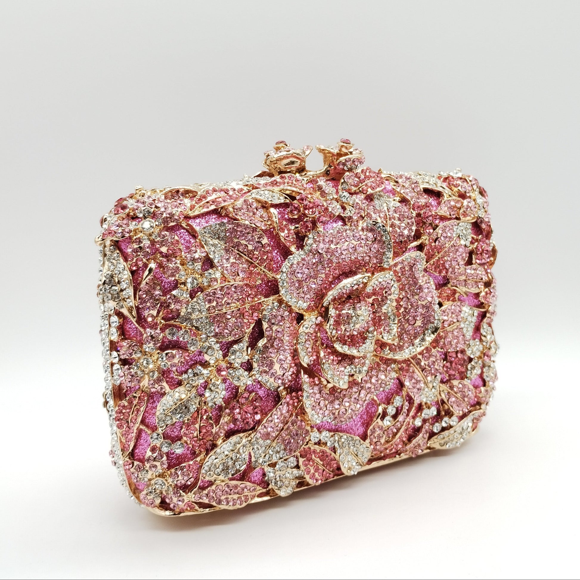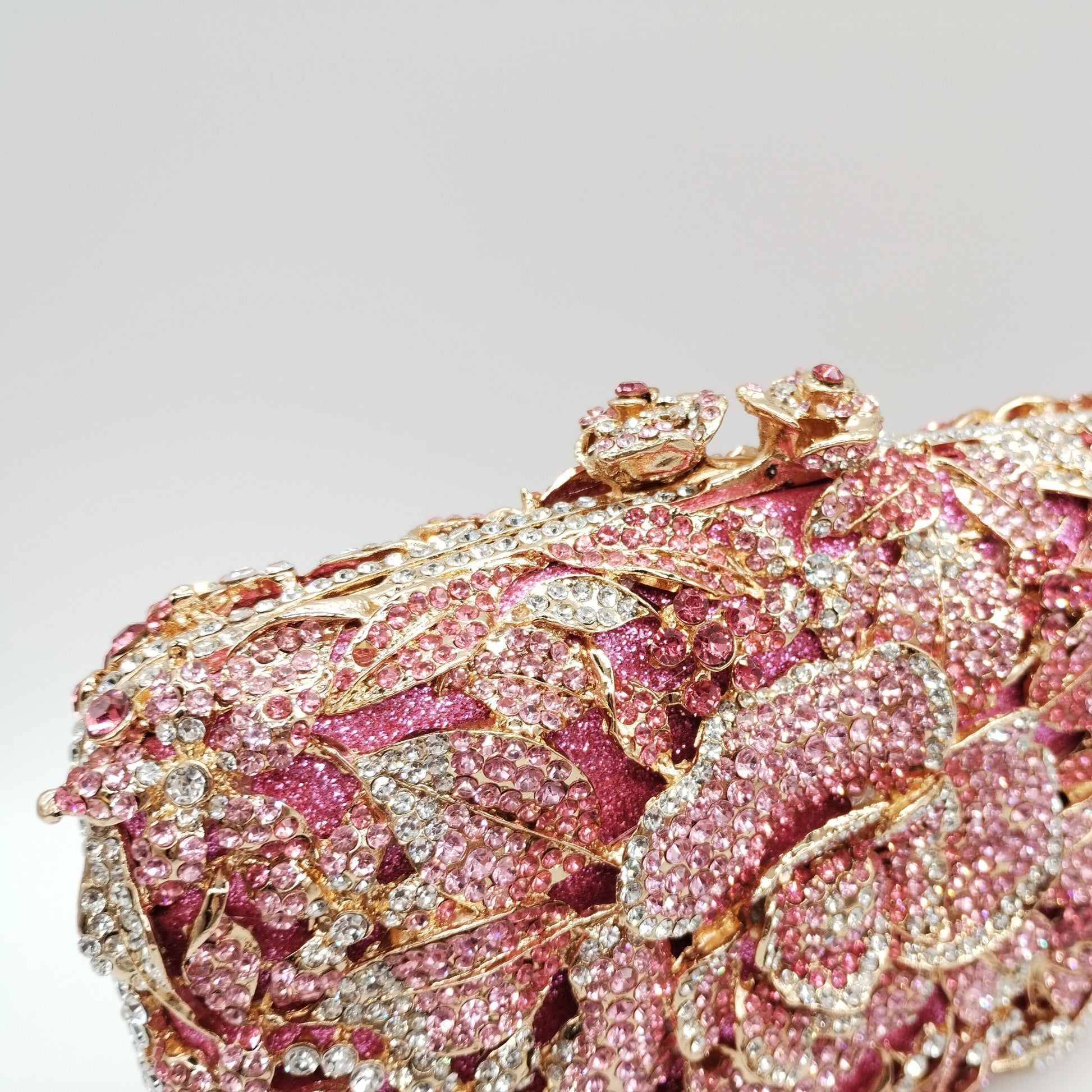 Borsetta gioiello in oro e tessuto brillante fucsia con decorazioni cristalli e strass color rosa e crystal. Tracolla interna removibile.