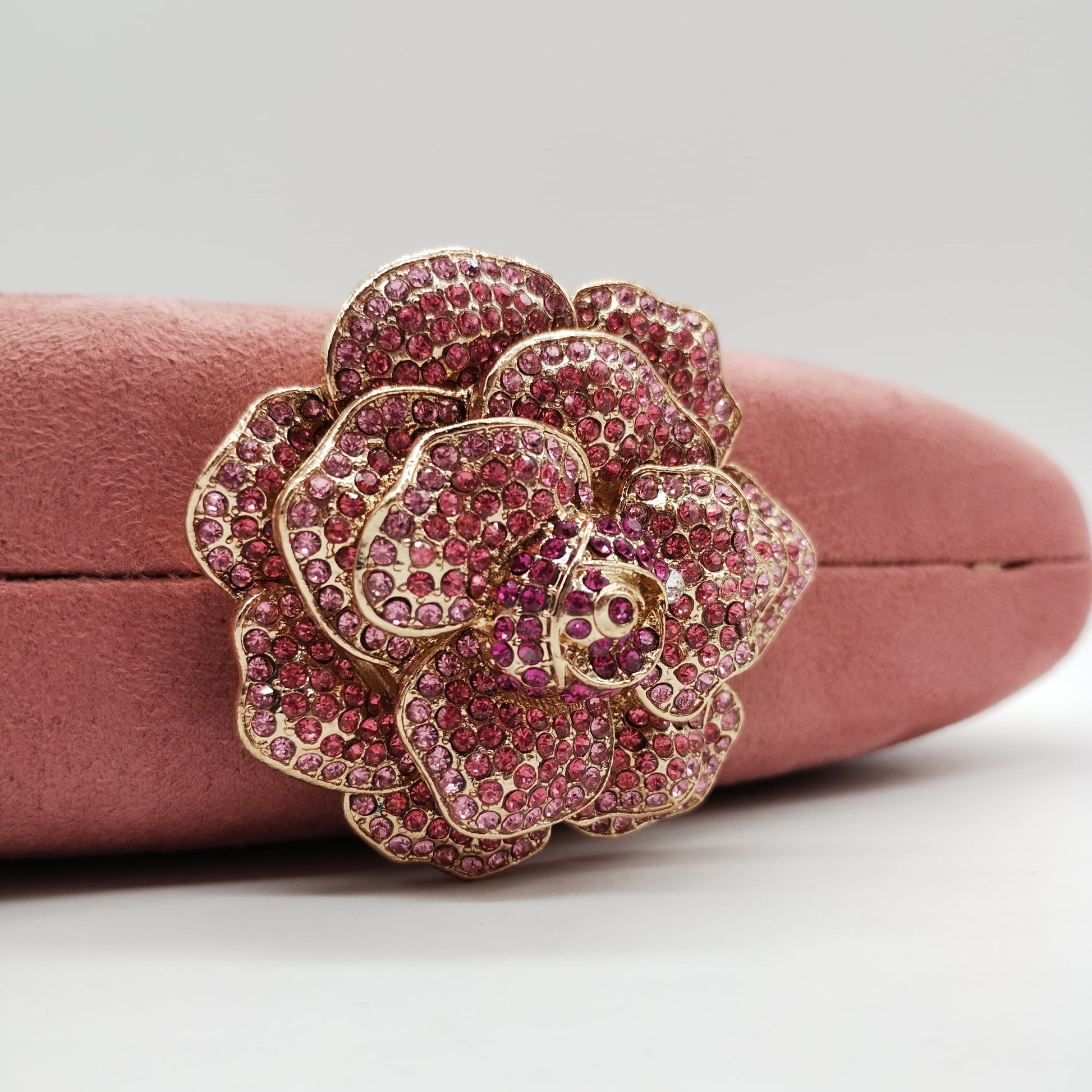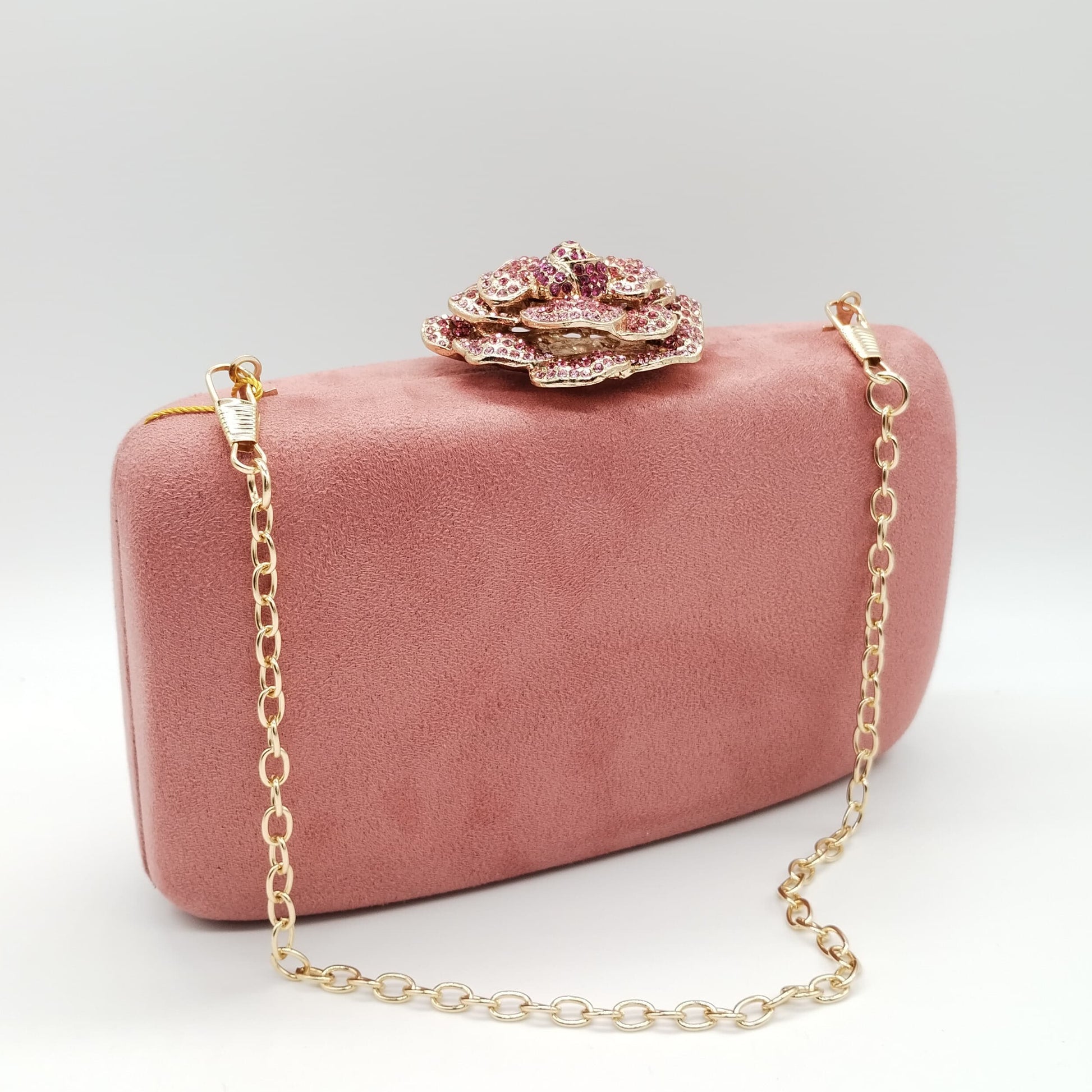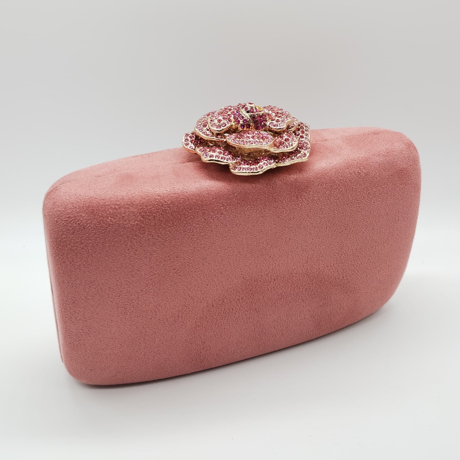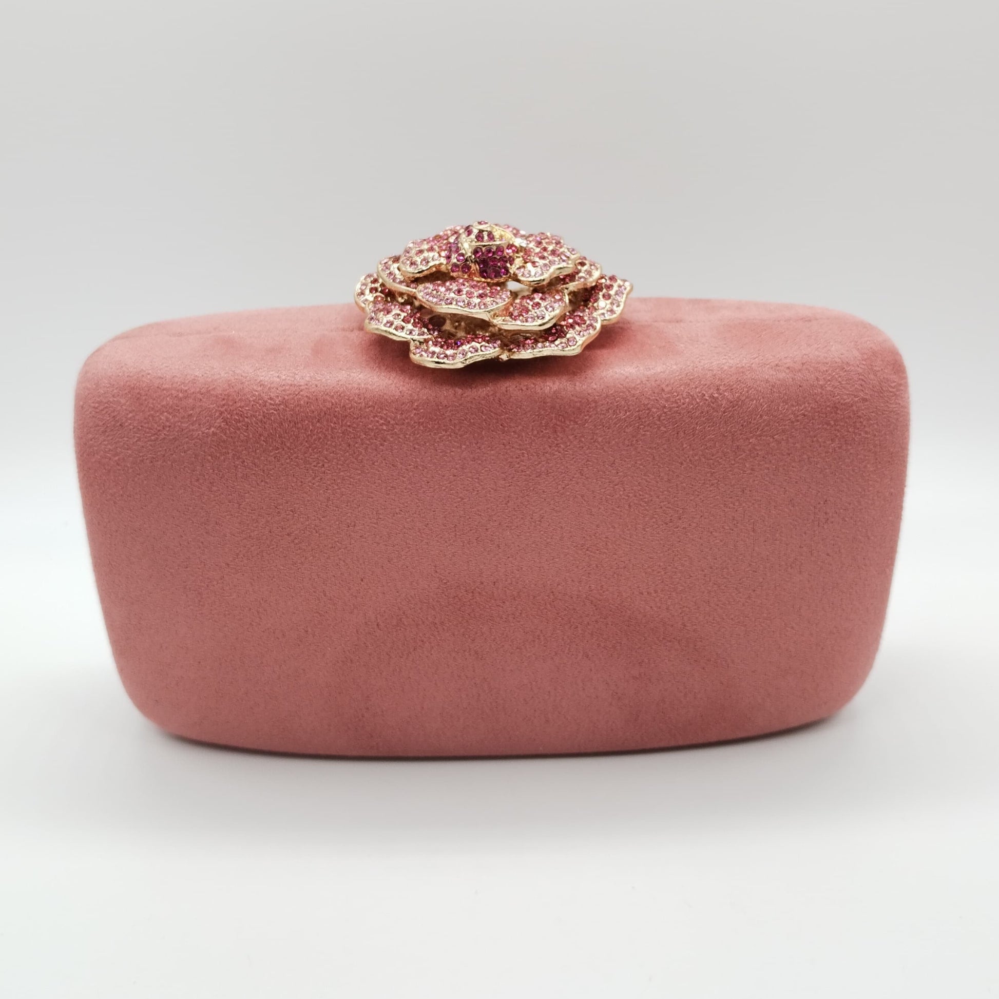 Borsetta da cerimonia rigida in velluto color rosa, chiusura fiore con strass in tinta e tracolla interna e removibile