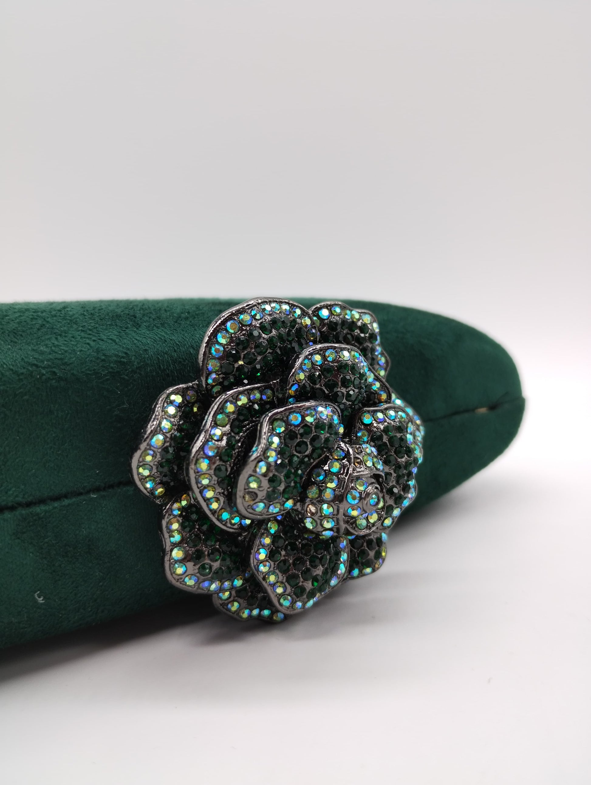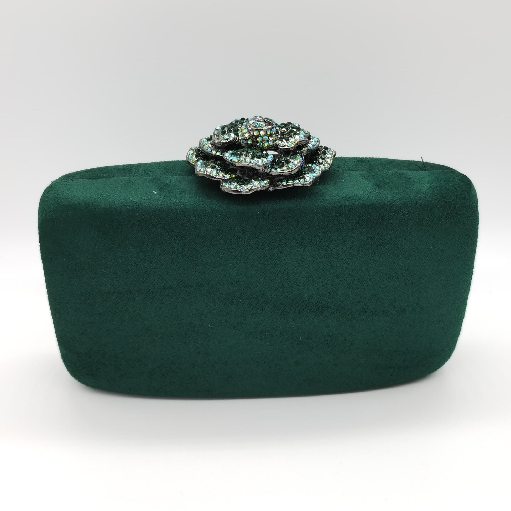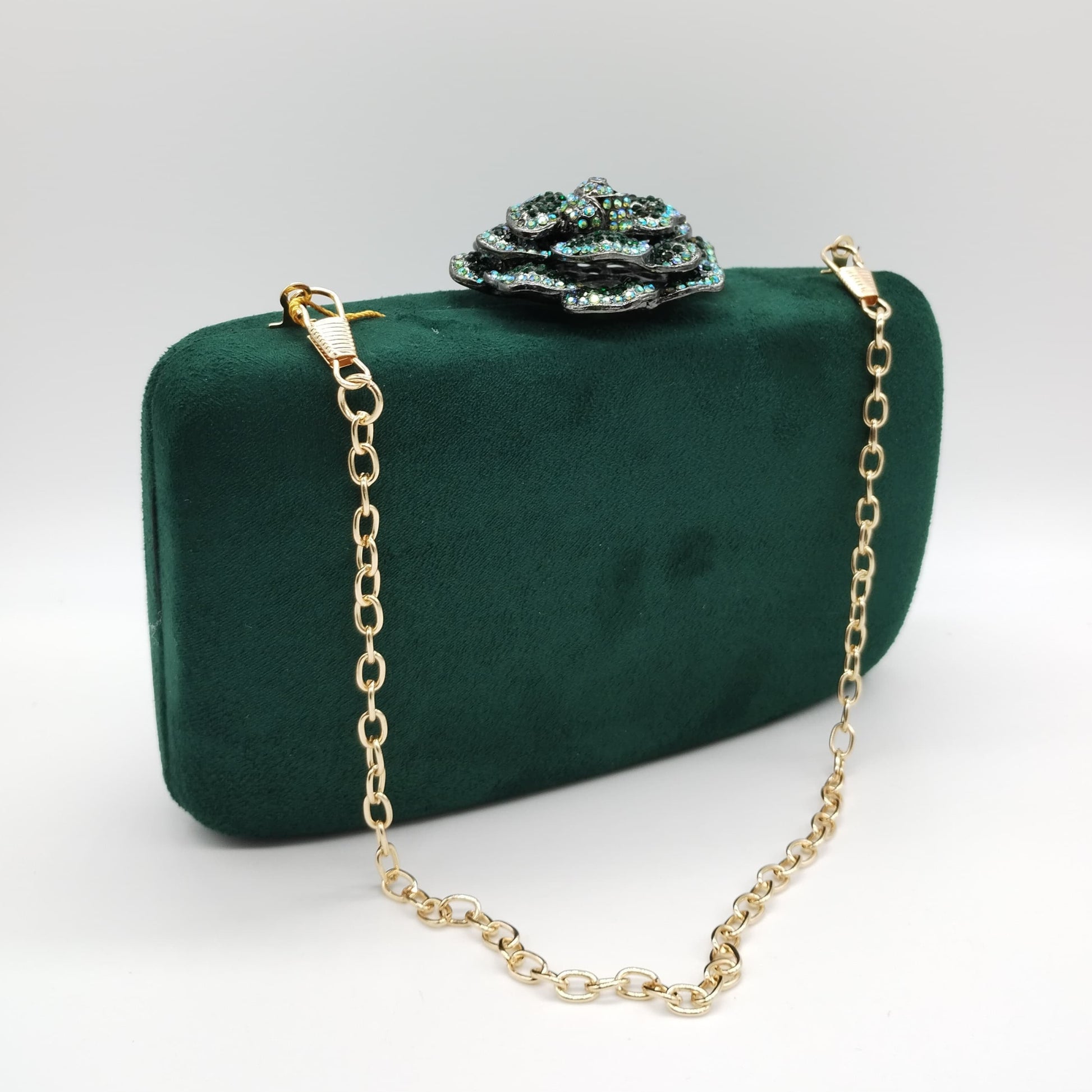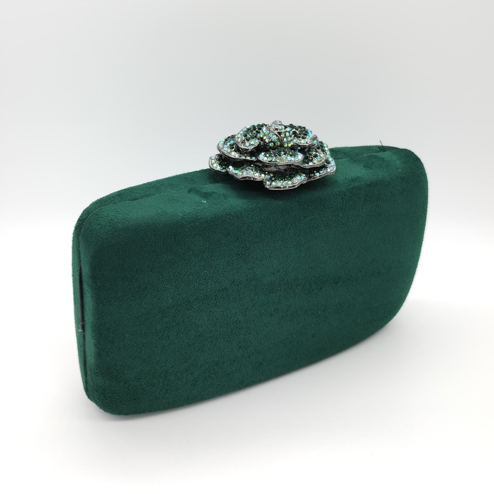 Borsetta da cerimonia rigida in velluto color verde, chiusura fiore con strass in tinta e tracolla interna e removibile