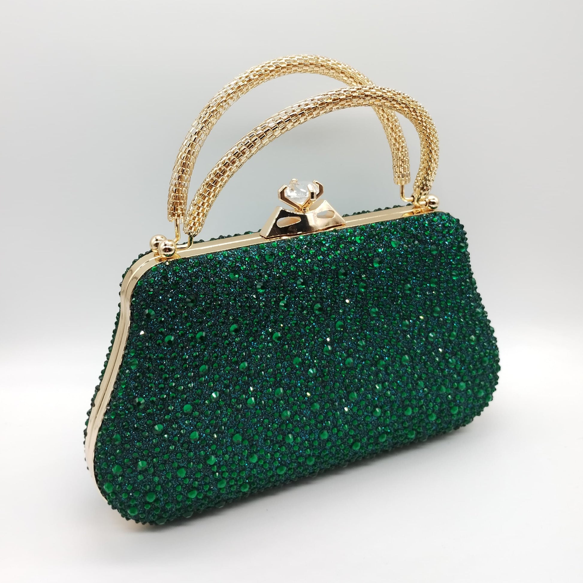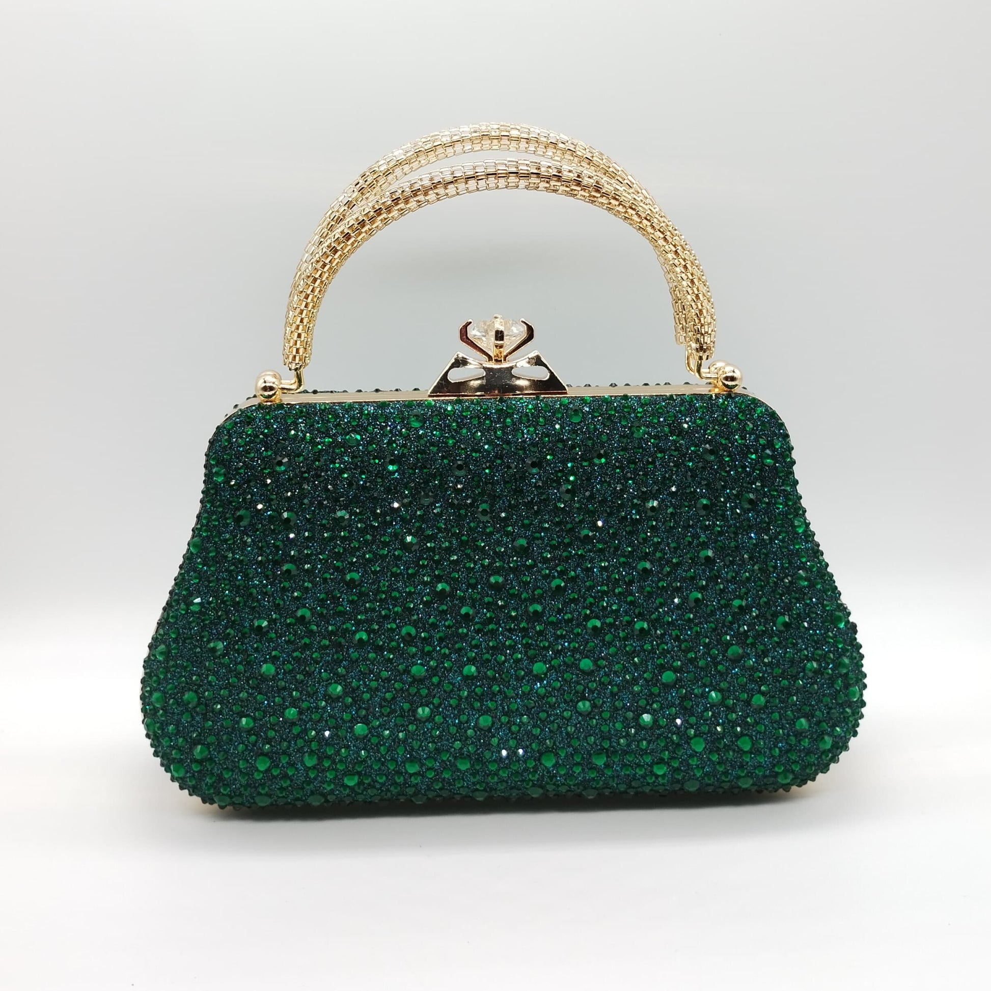 Borsetta da cerimonia rigida in tessuto brillante color verde, strass in tinta e manichetto esterno con strass. Tracolla interna e removibile