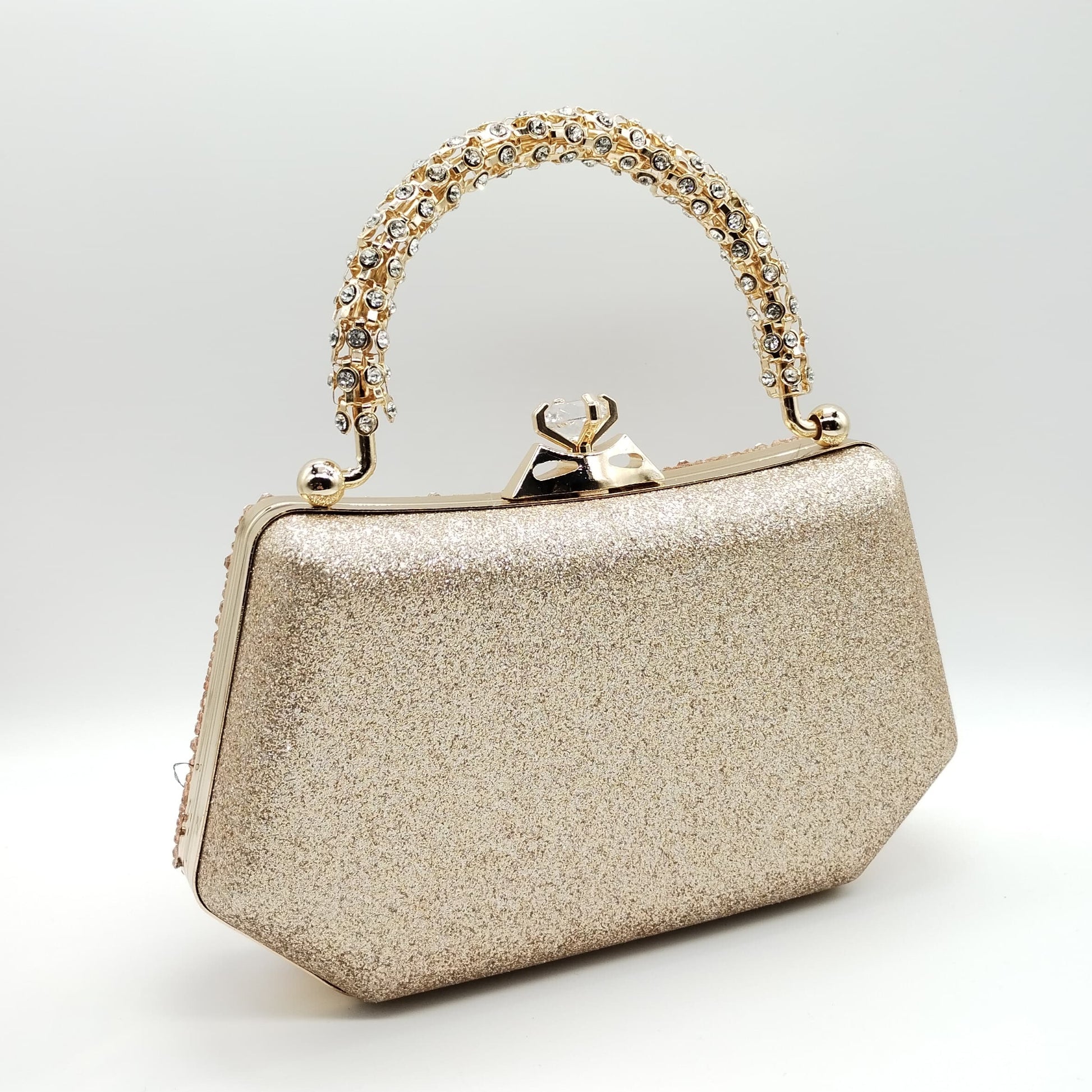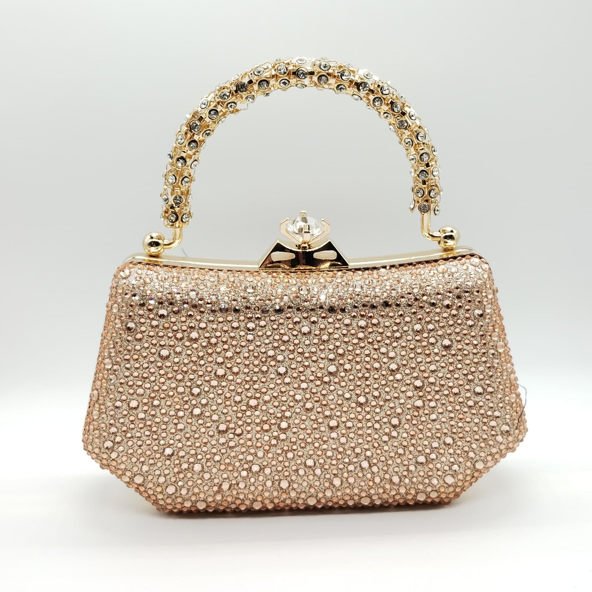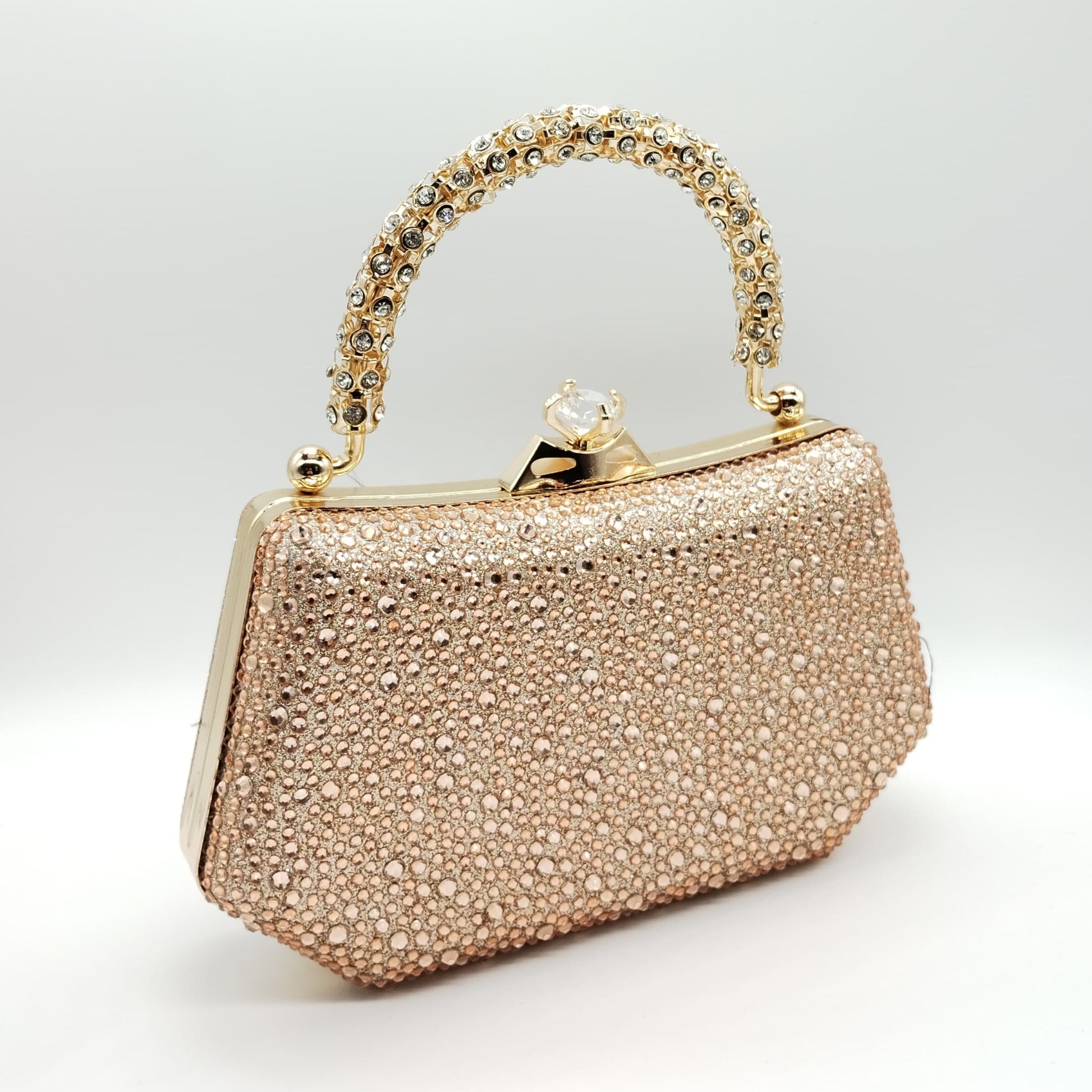 Borsetta da cerimonia rigida in tessuto brillante color rosa cipria, strass in tinta e manichetto esterno con strass. Tracolla interna e removibile