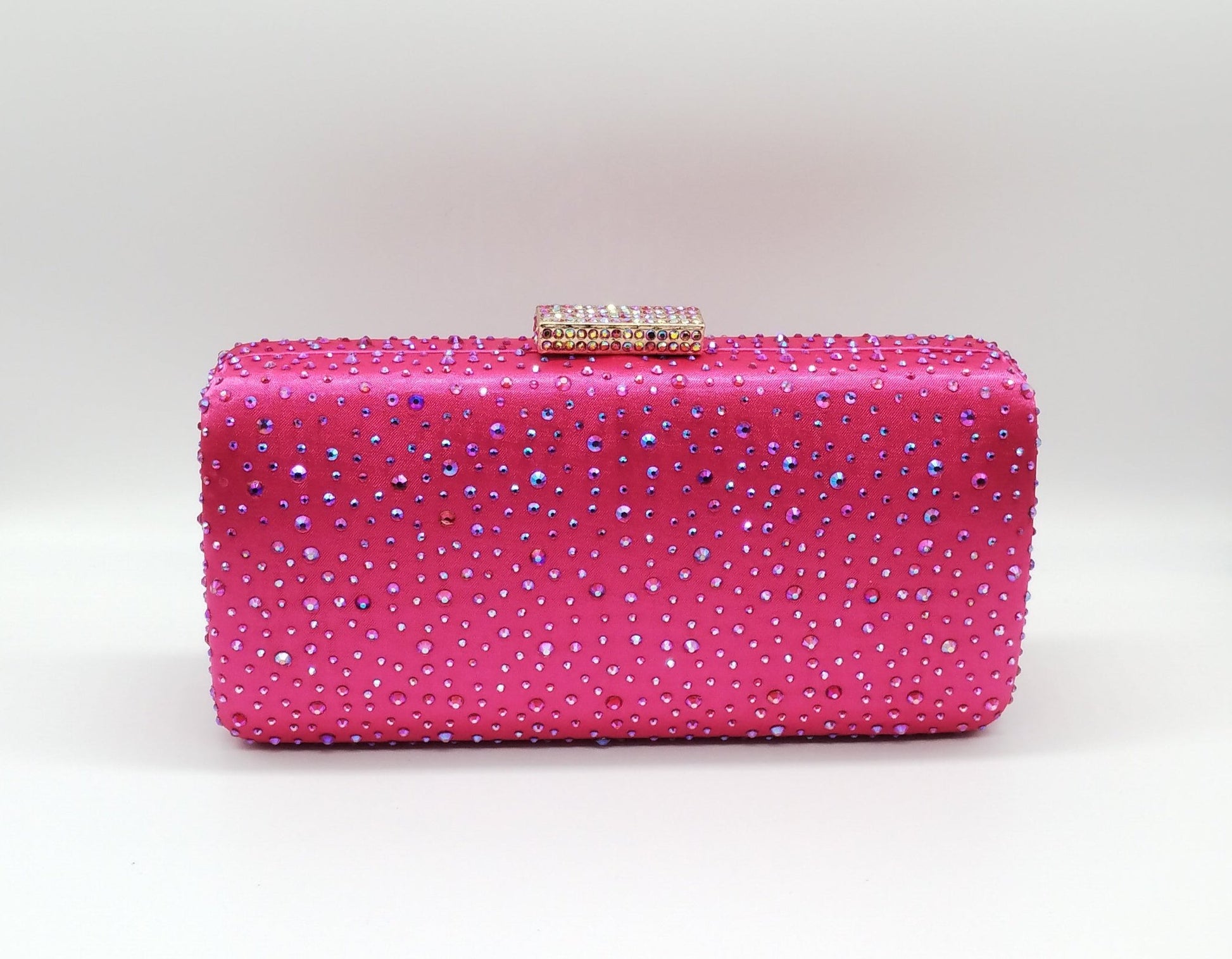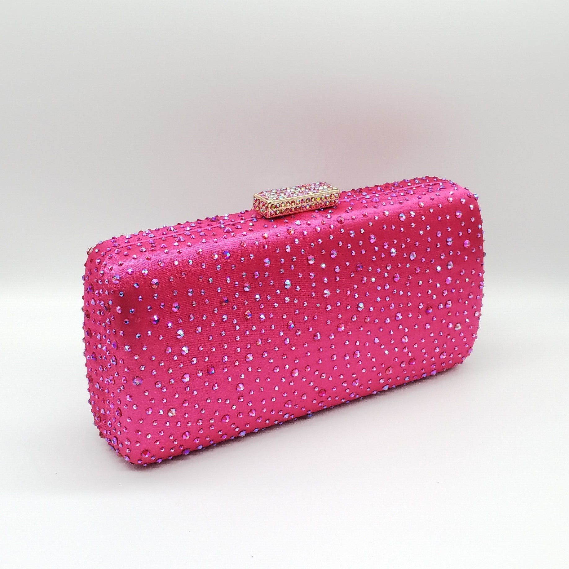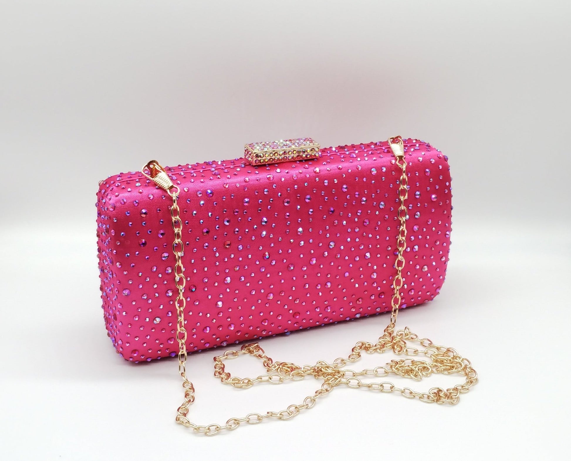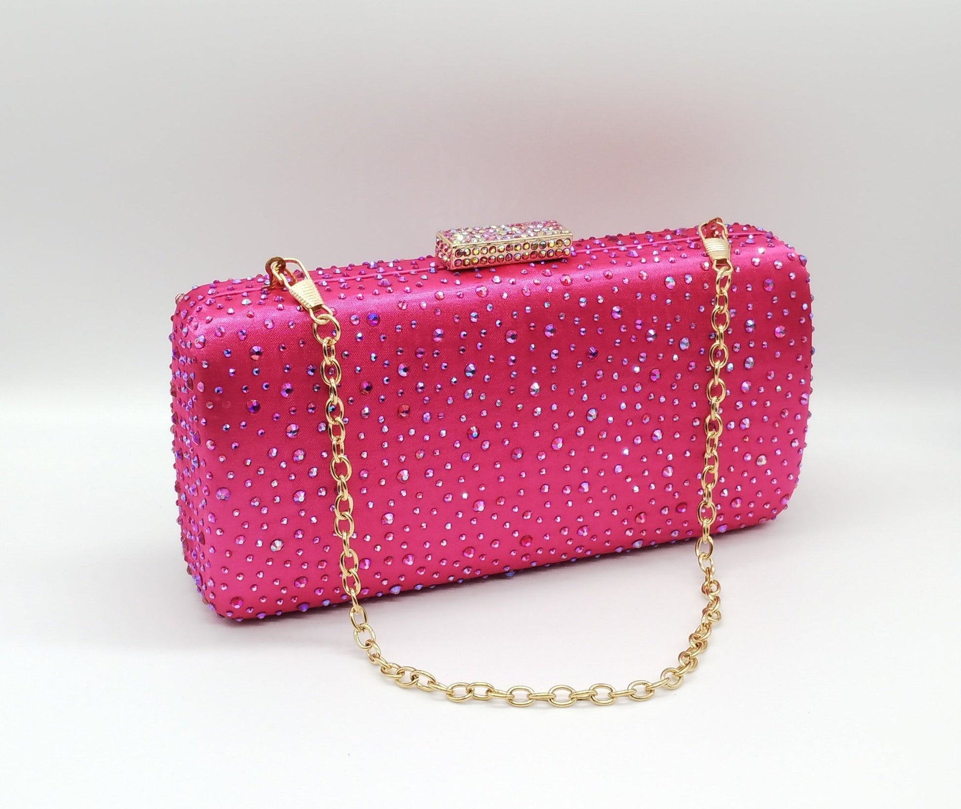 Borsetta da cerimonia in tessuto raso e strass color fucsia, tracolla interna removibile.