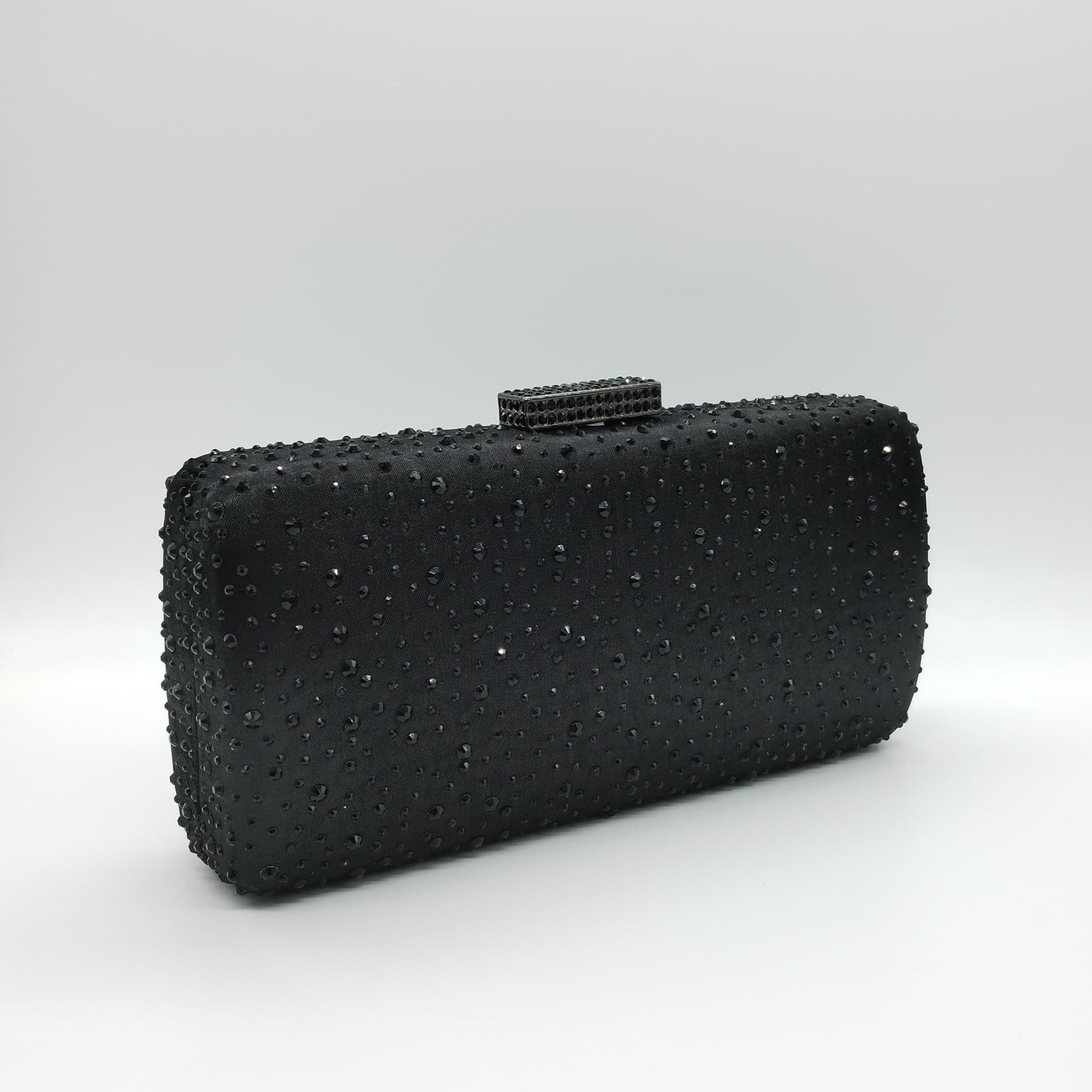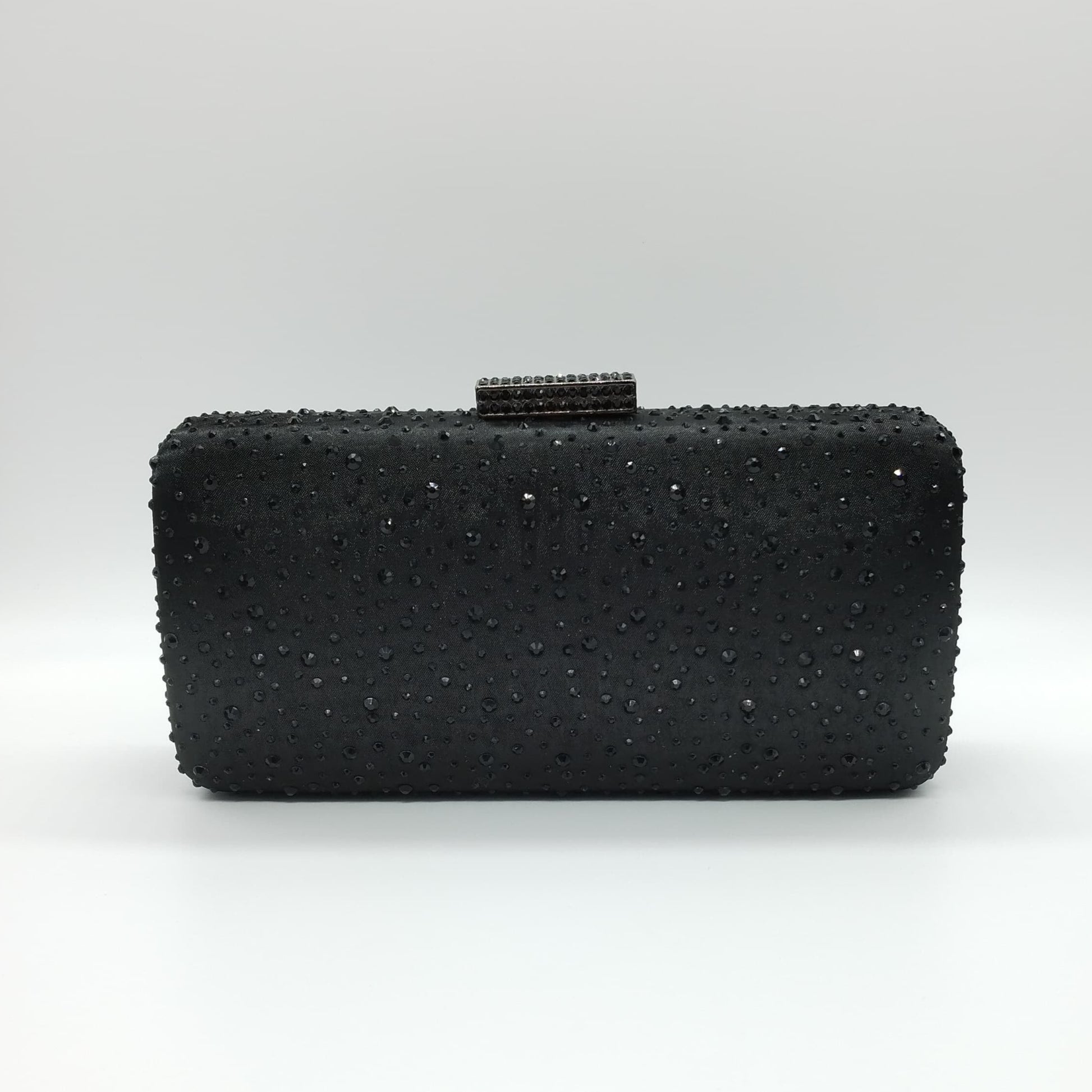 Borsetta da cerimonia in tessuto raso e strass color nero, tracolla interna removibile.