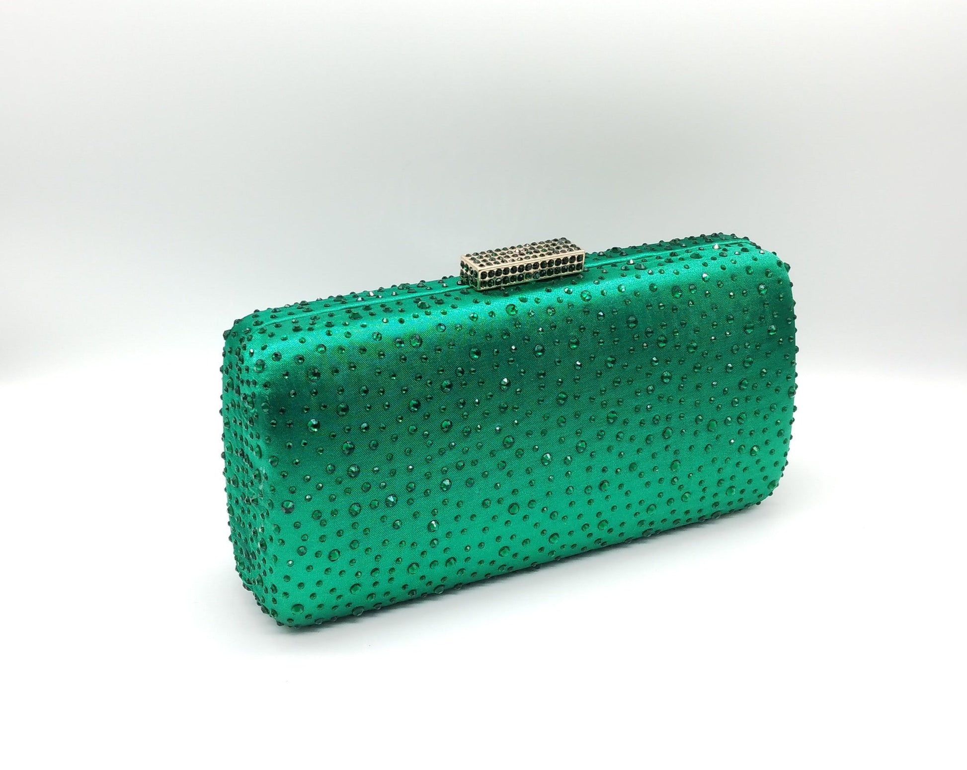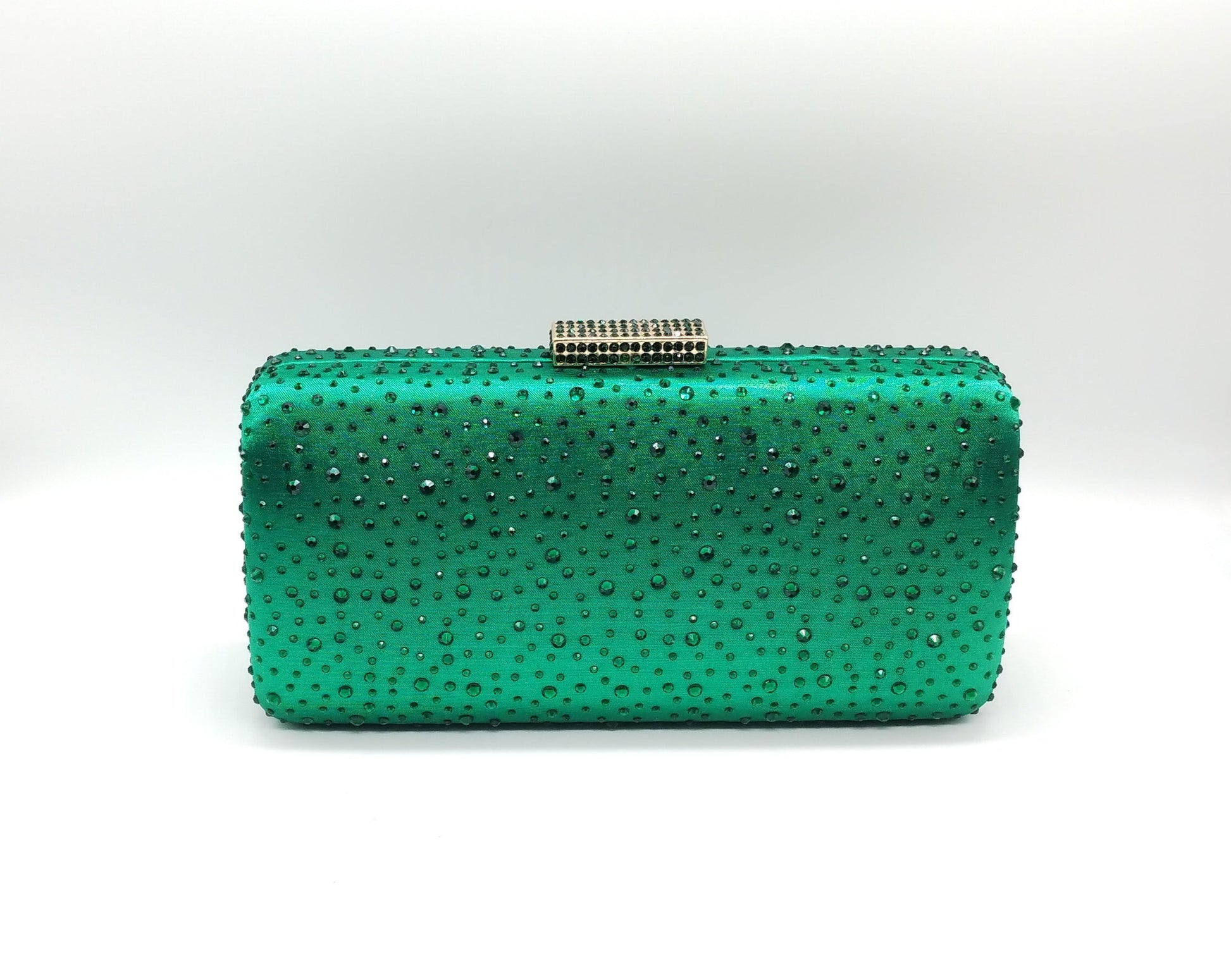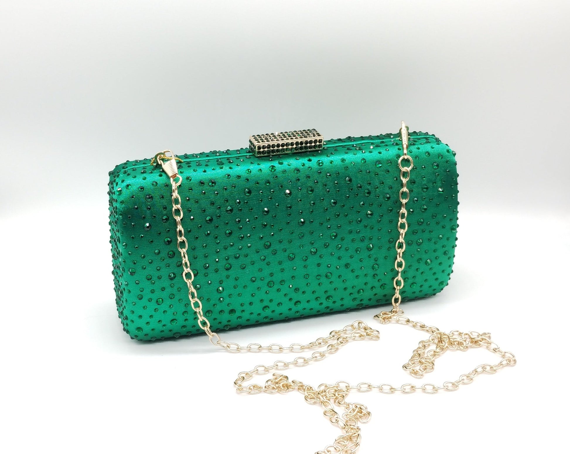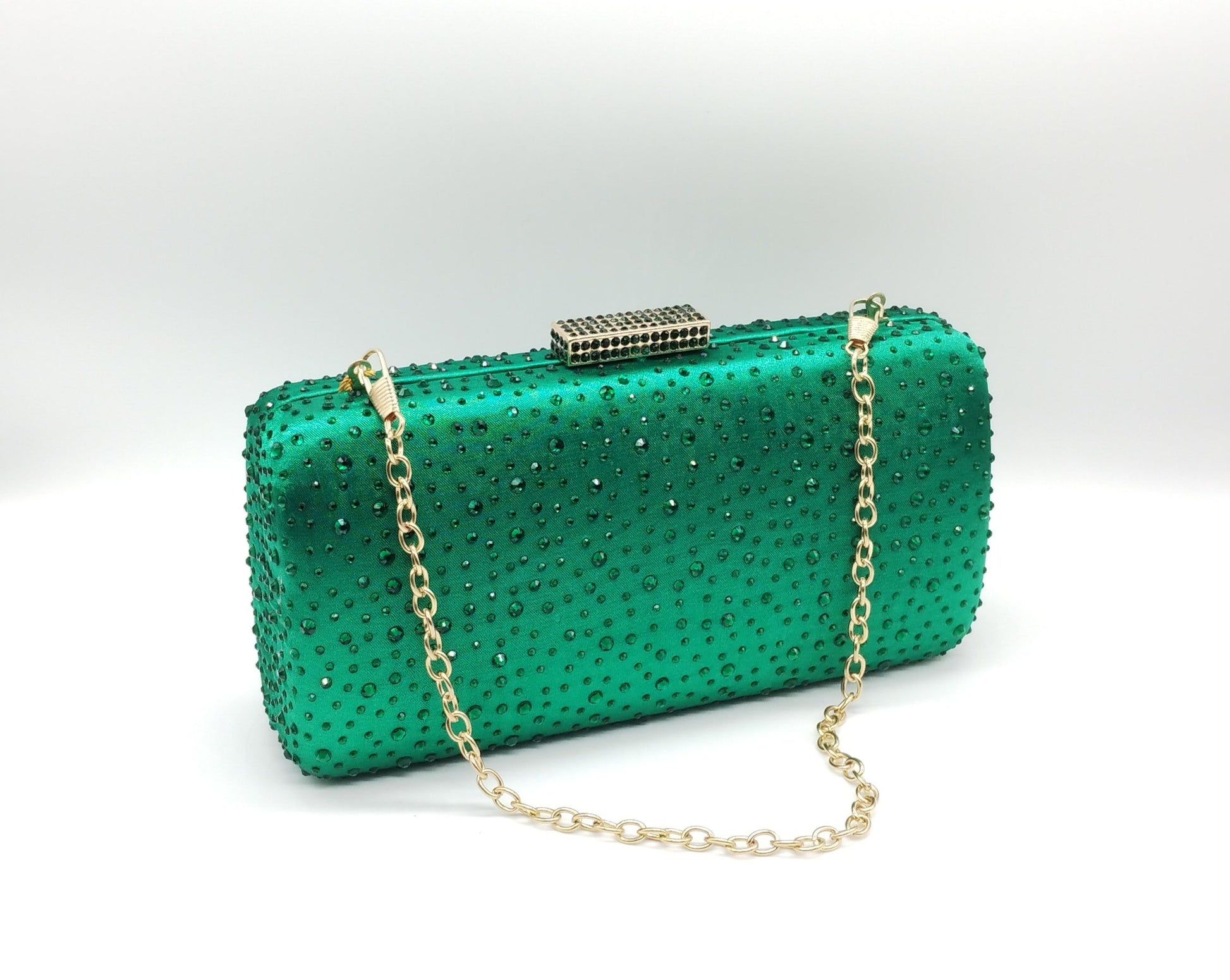 Borsetta da cerimonia in tessuto raso e strass color verde con tracolla interna removibile.