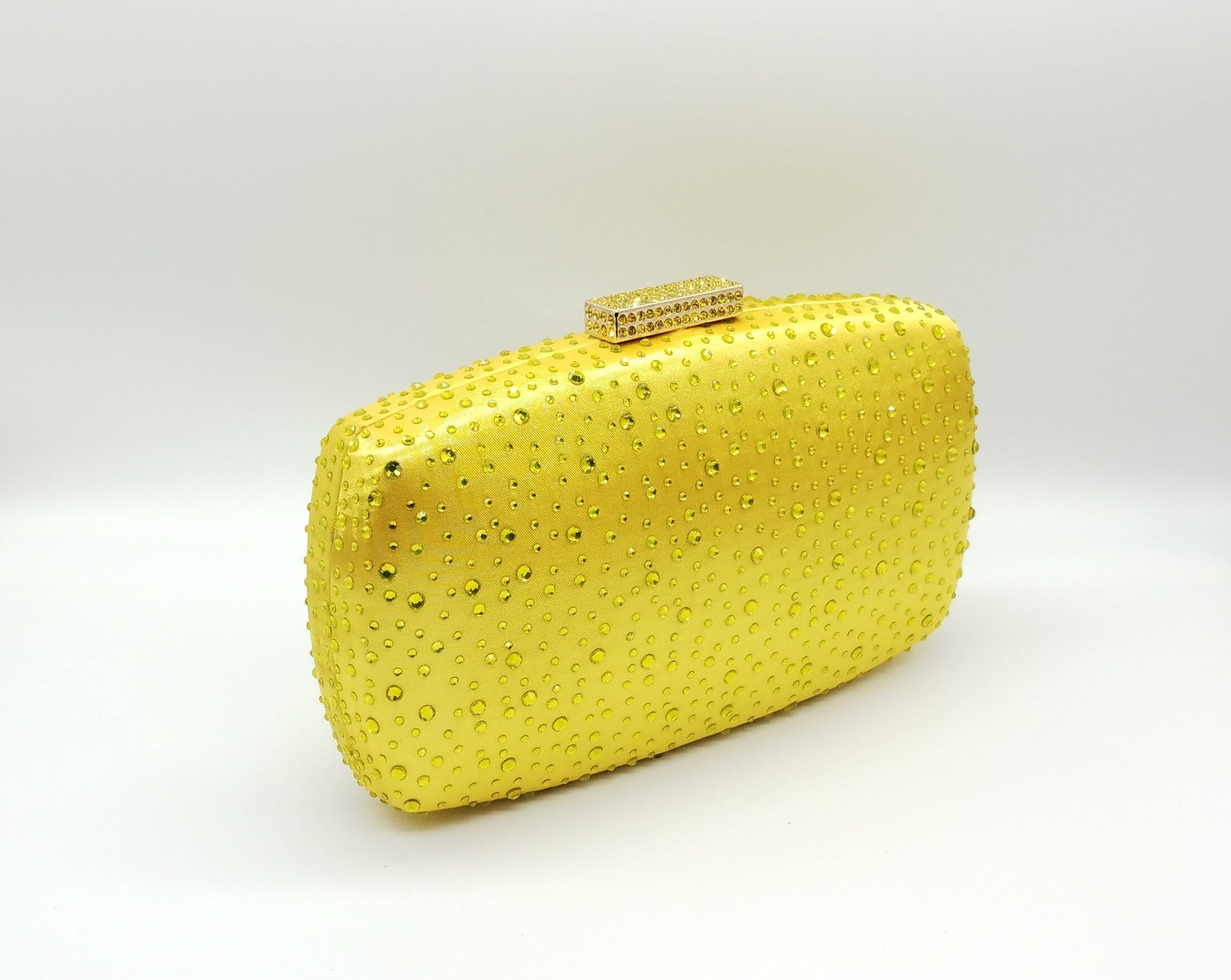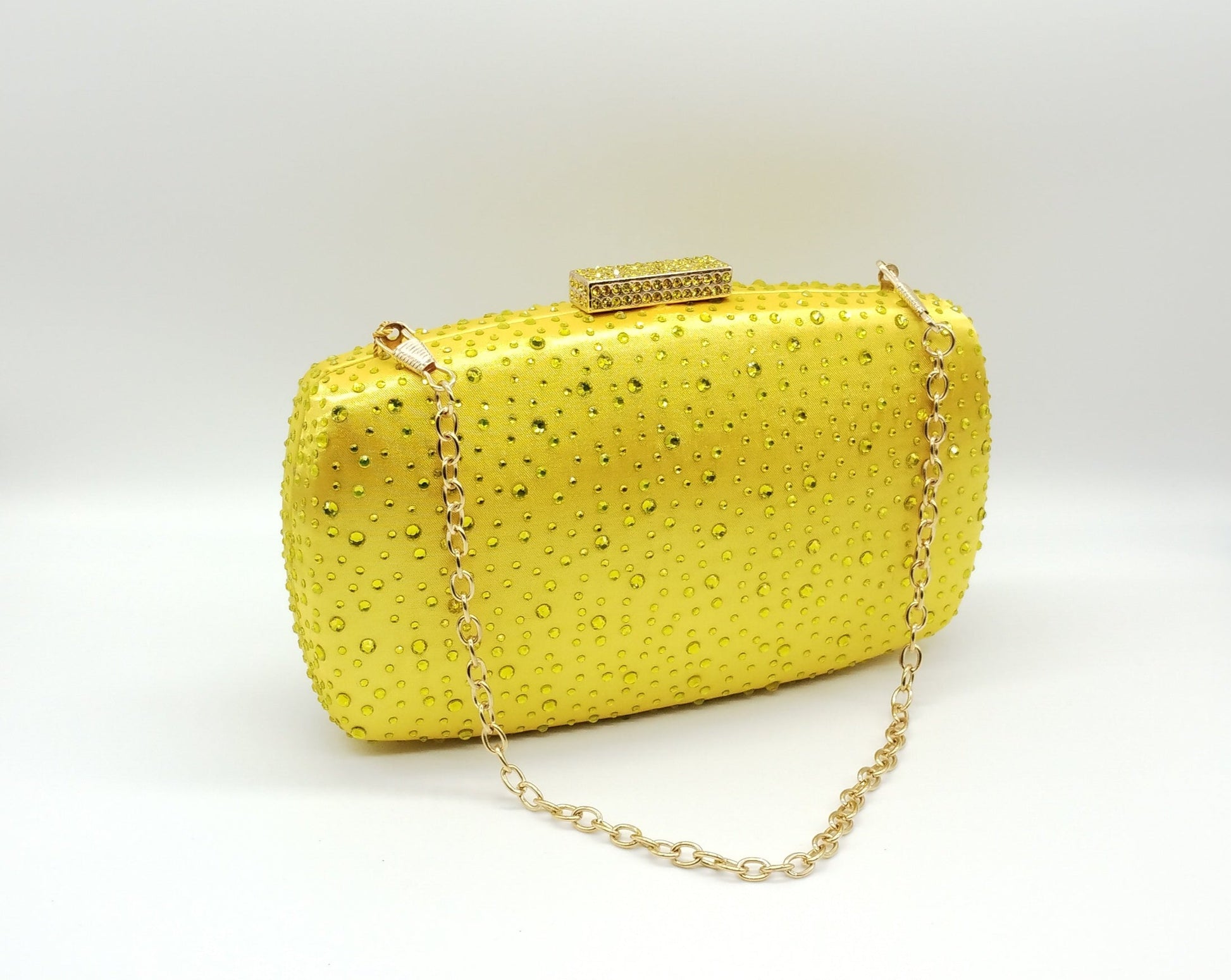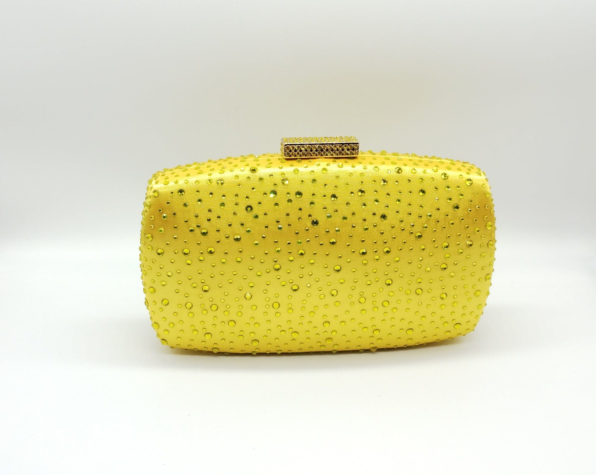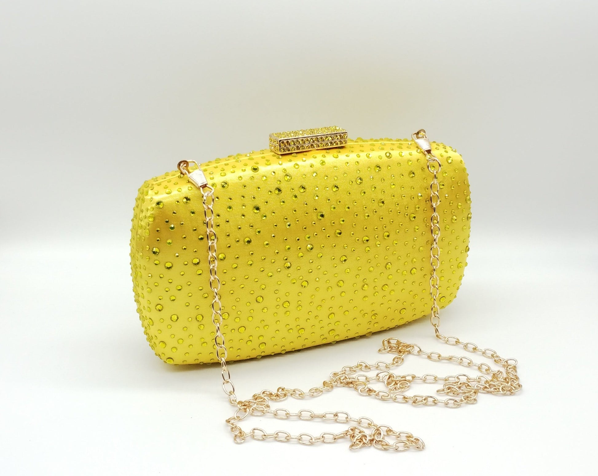 Borsetta da cerimonia in tessuto raso e strass color giallo, tracolla interna removibile.