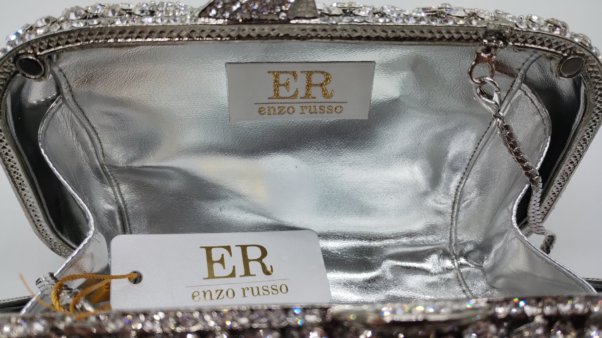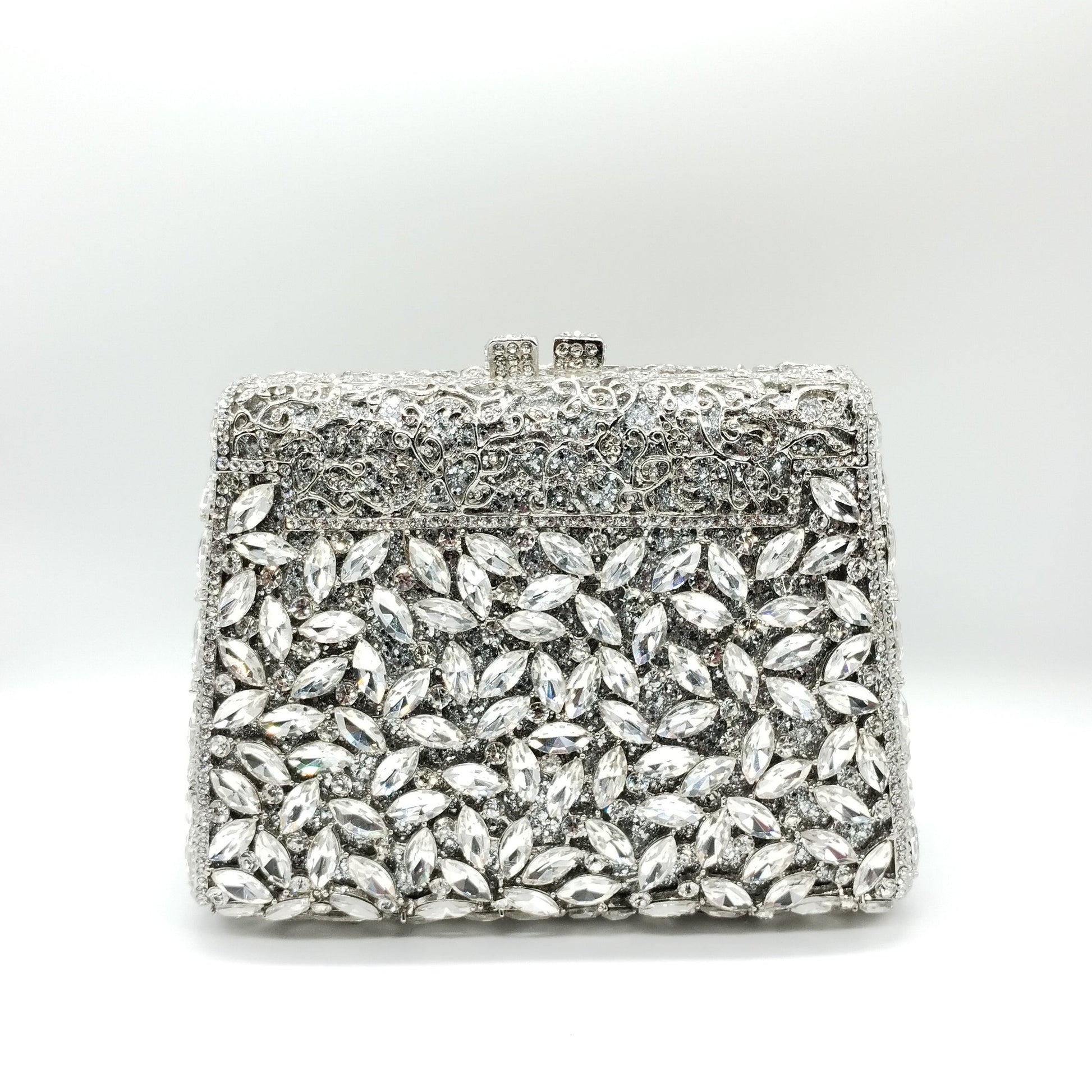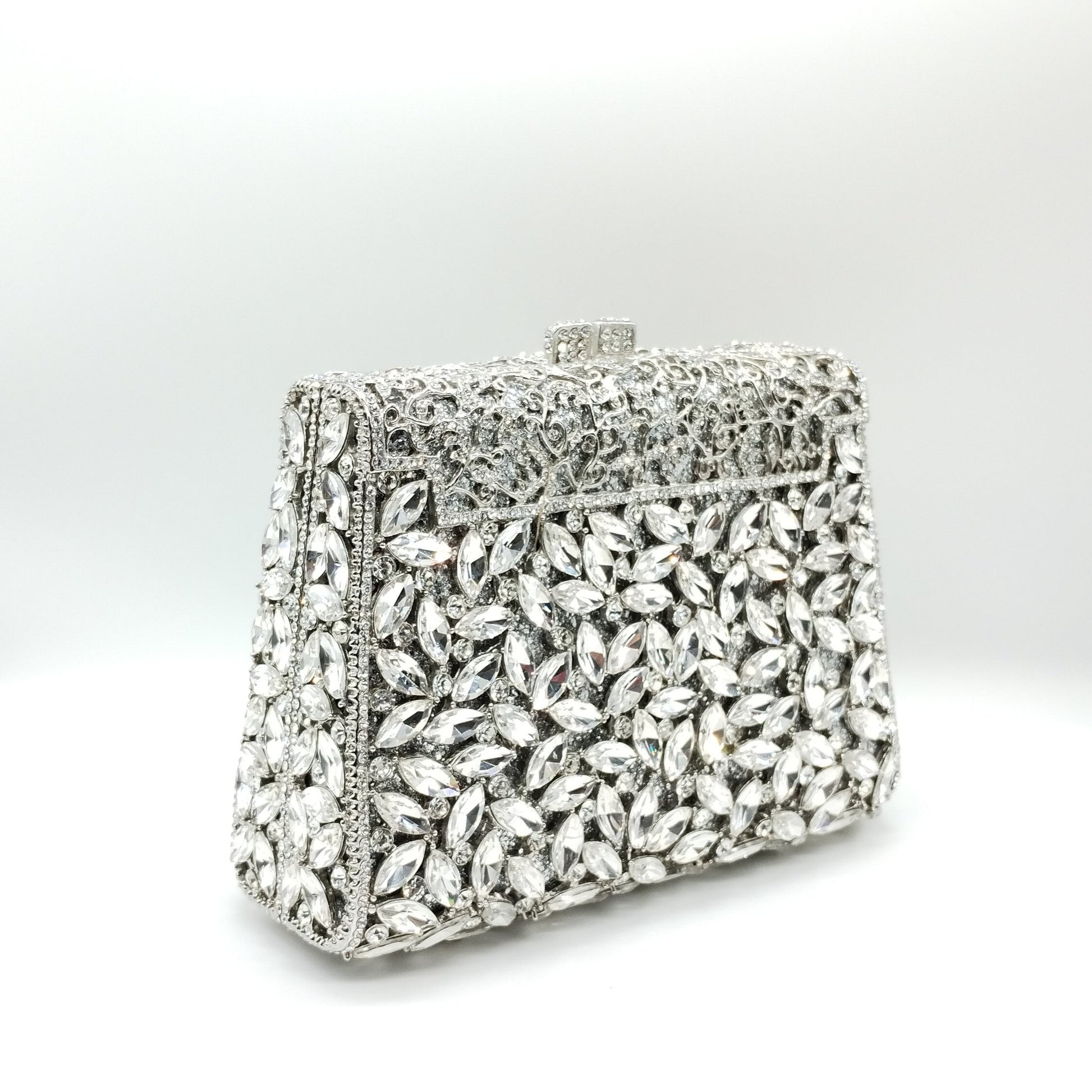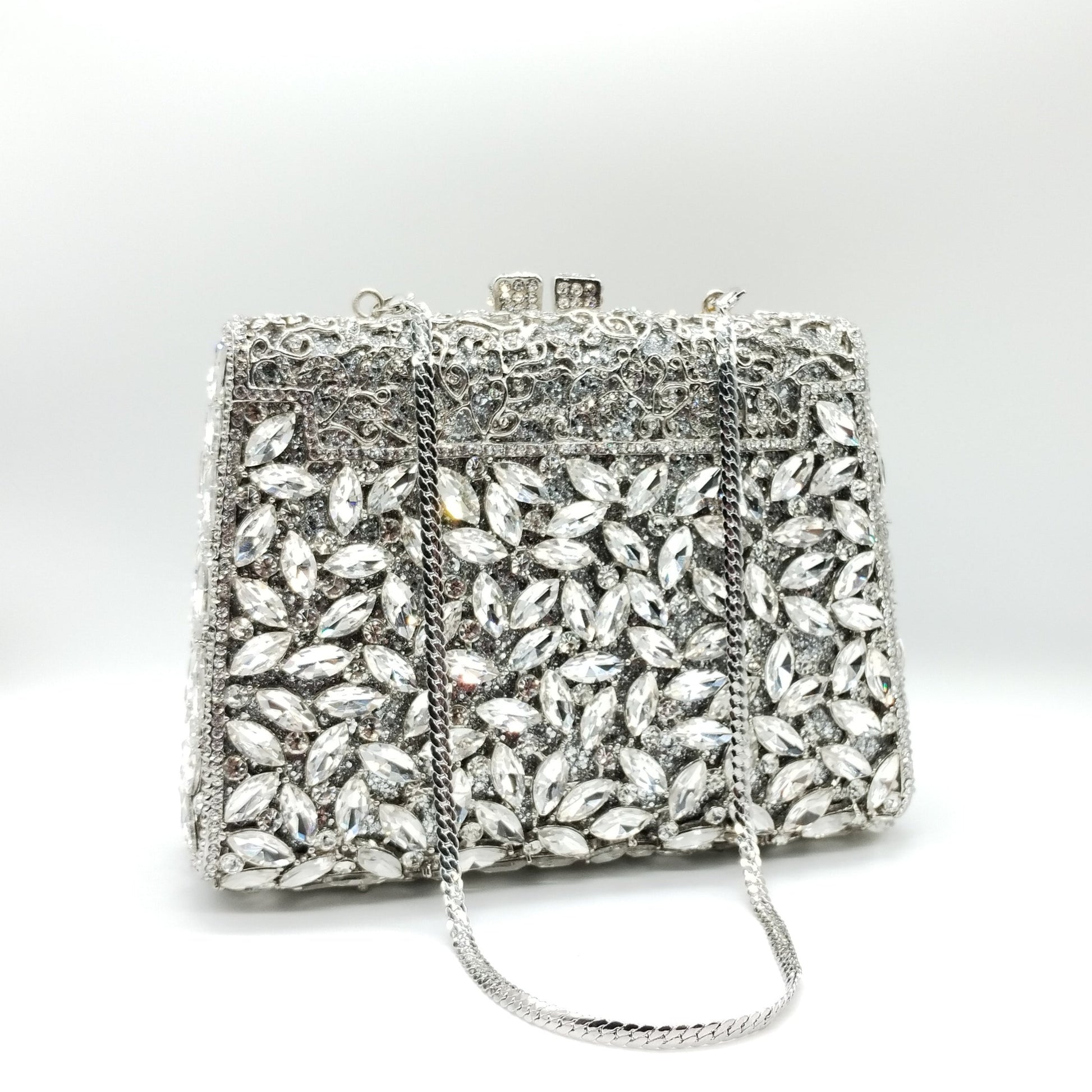 Borsetta gioiello argento con cristalli color crystal e tracolla interna removibile.