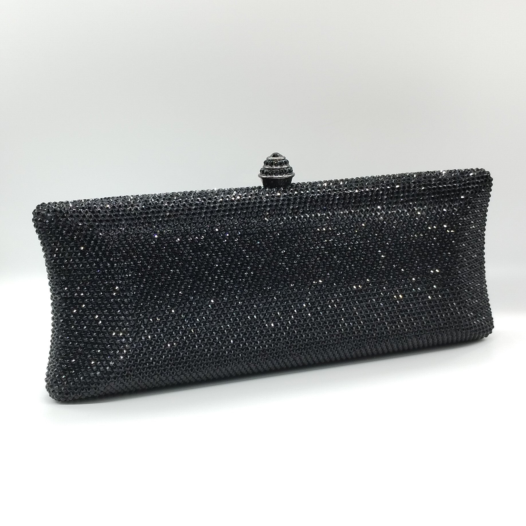 Borsetta da cerimonia rigida con strass color nero e tracolla interna removibile.