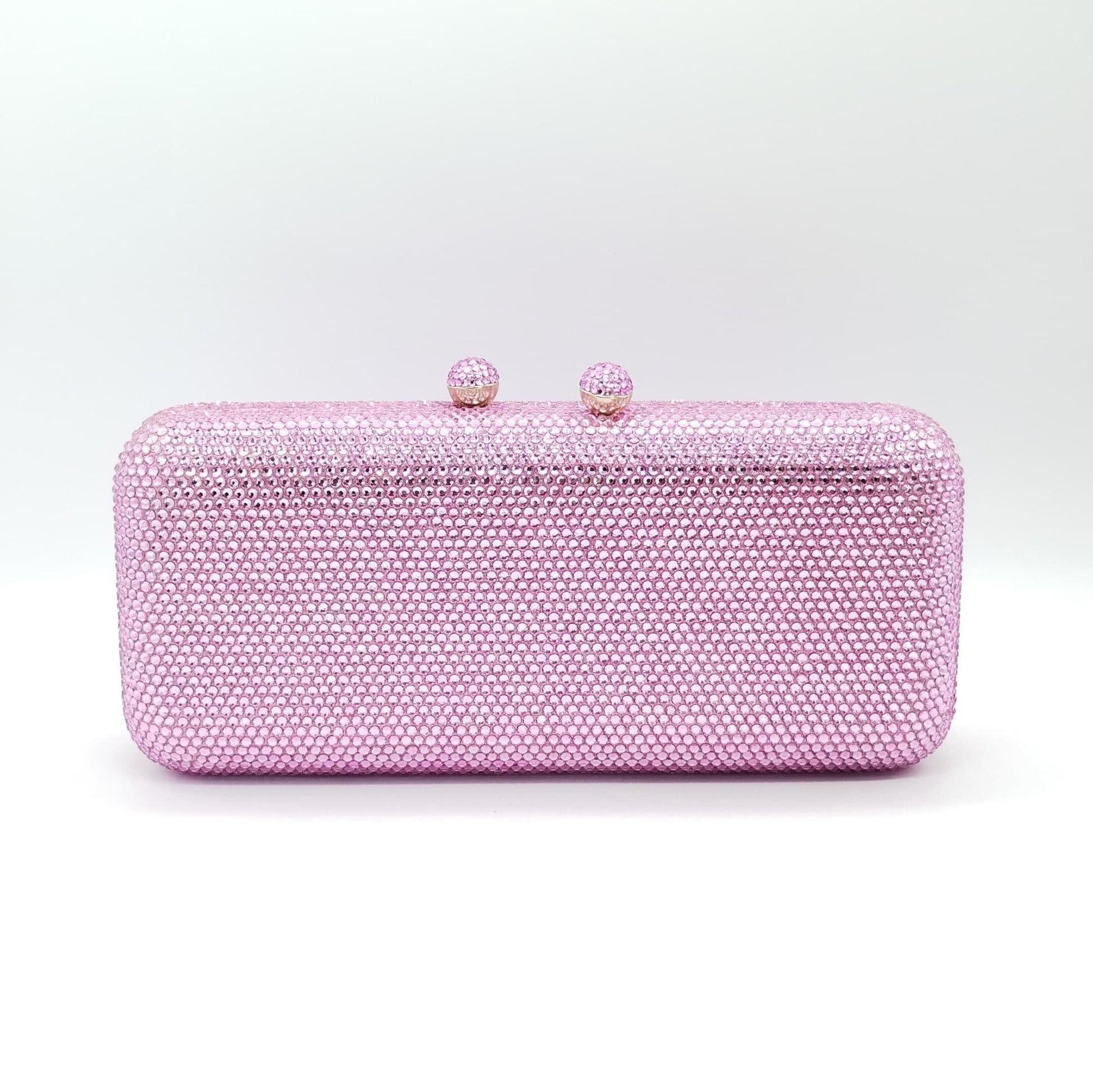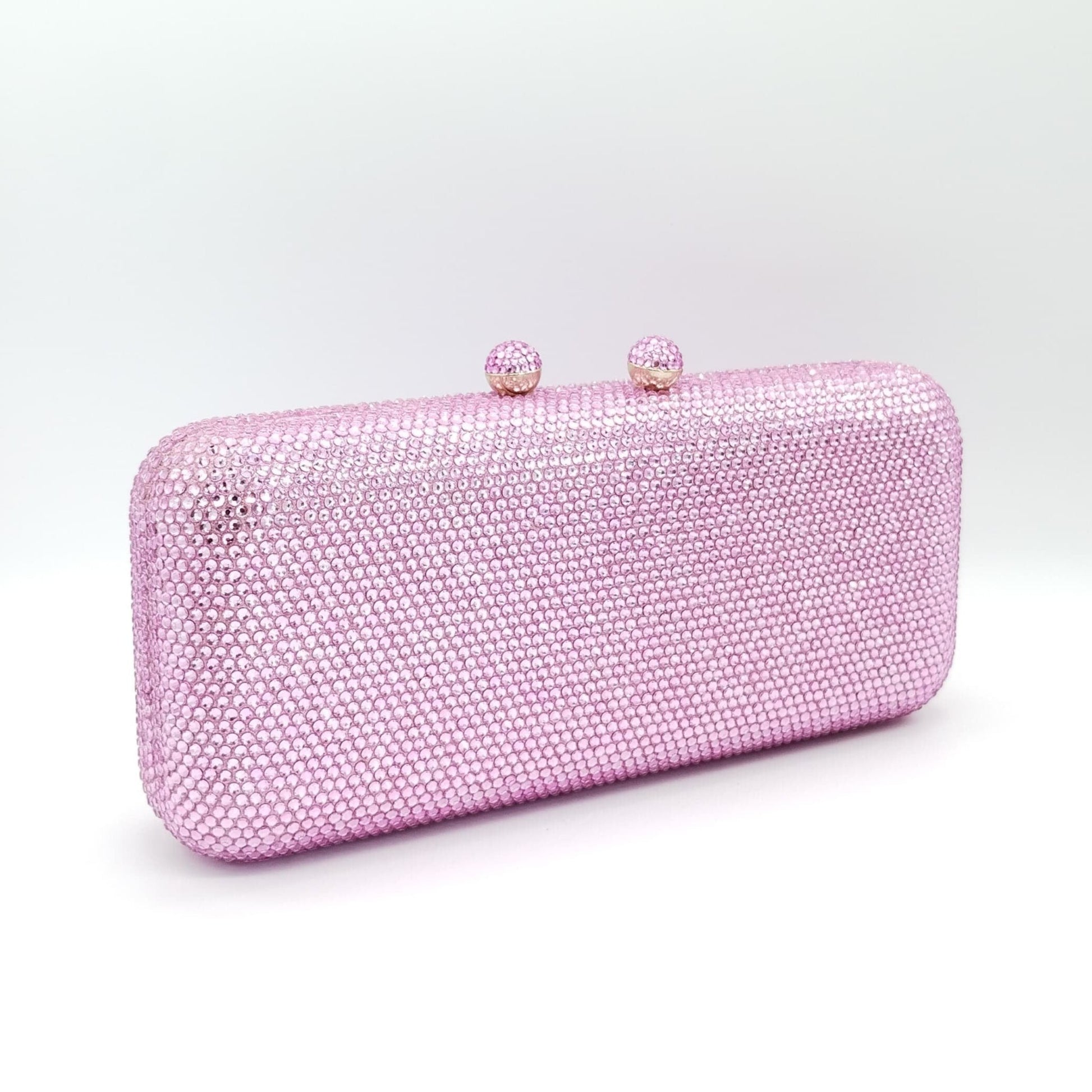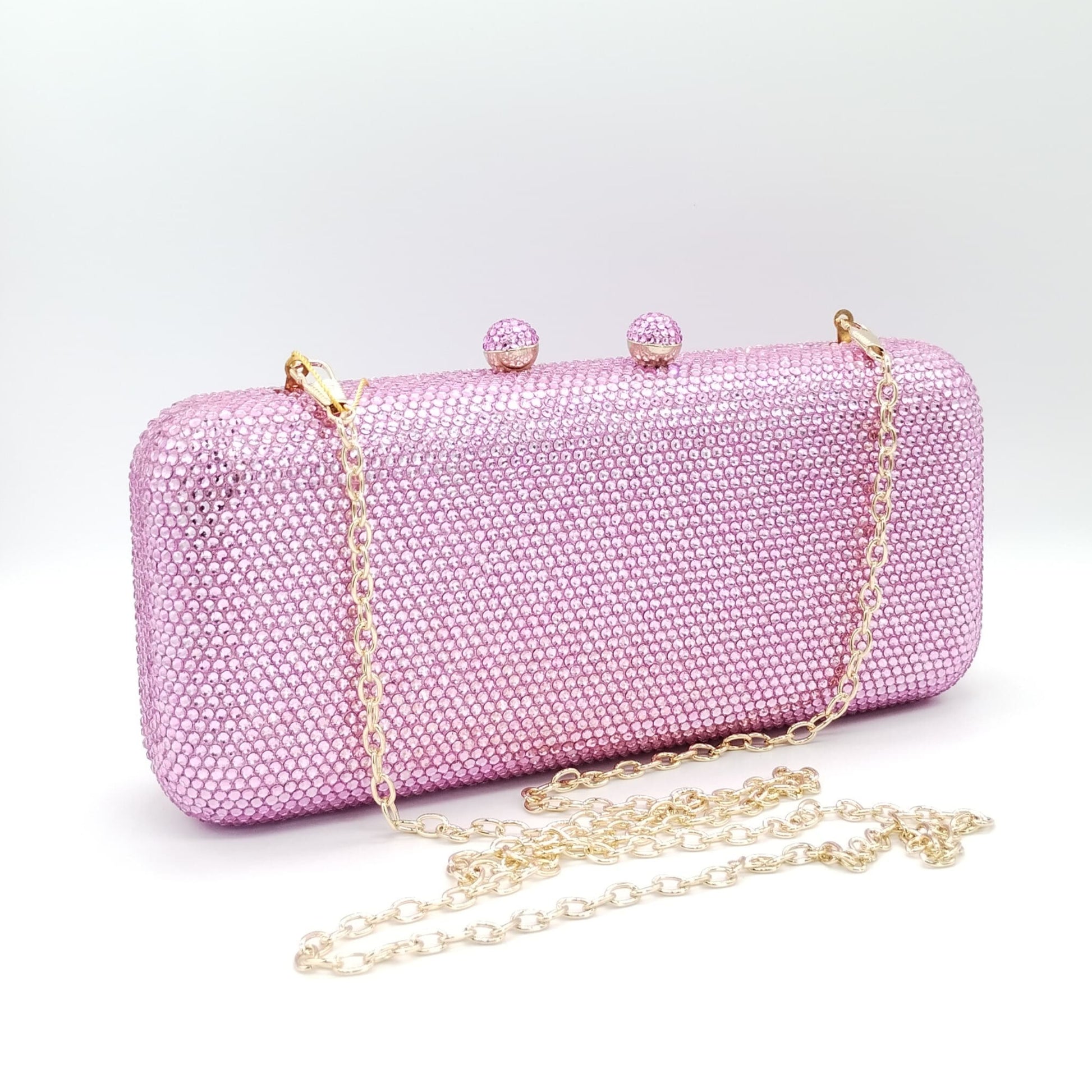Borsetta da cerimonia rigida in strass color rosa e tracolla interna removibile.
