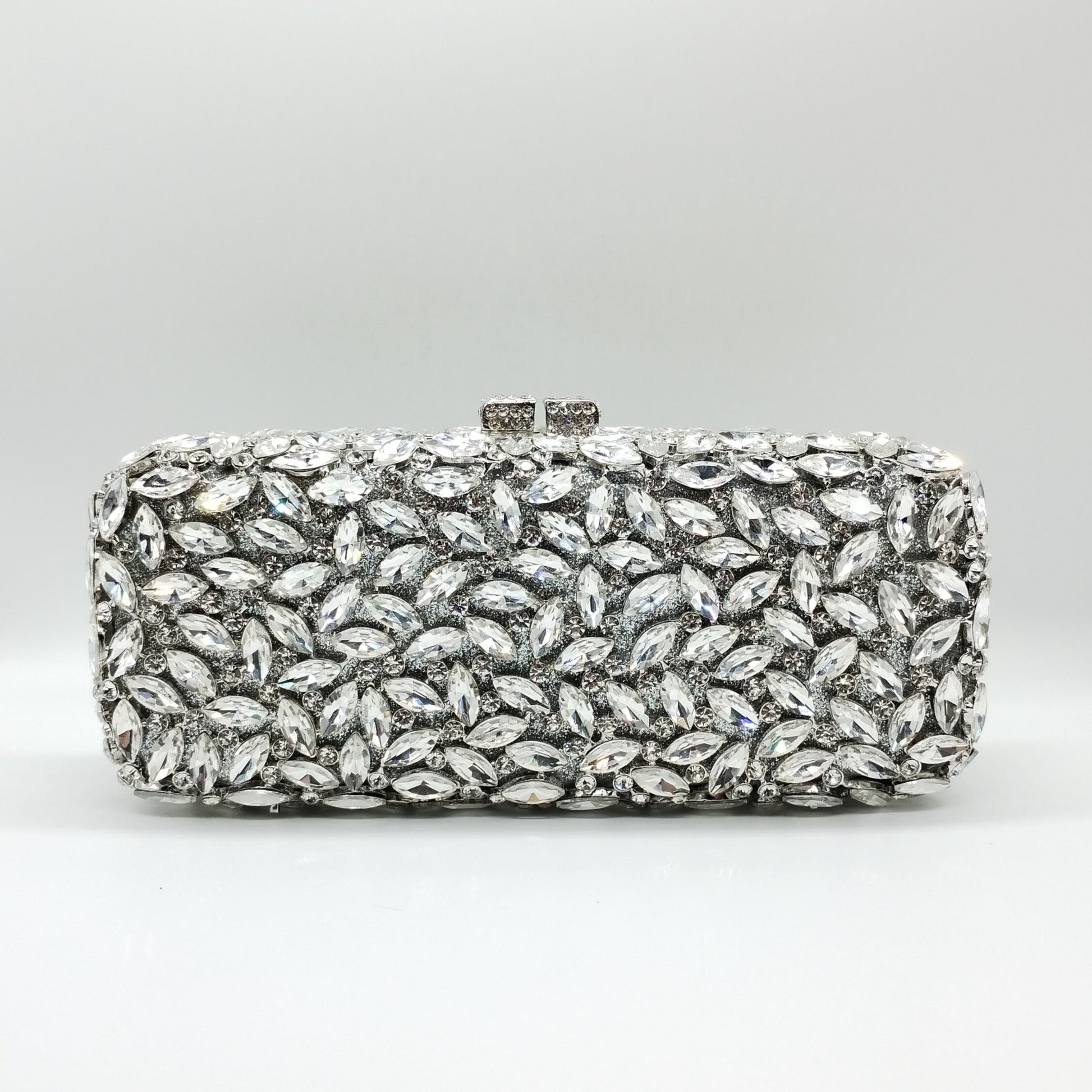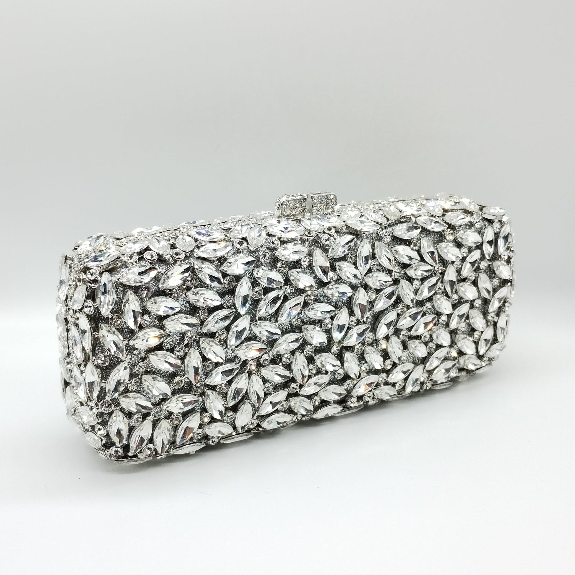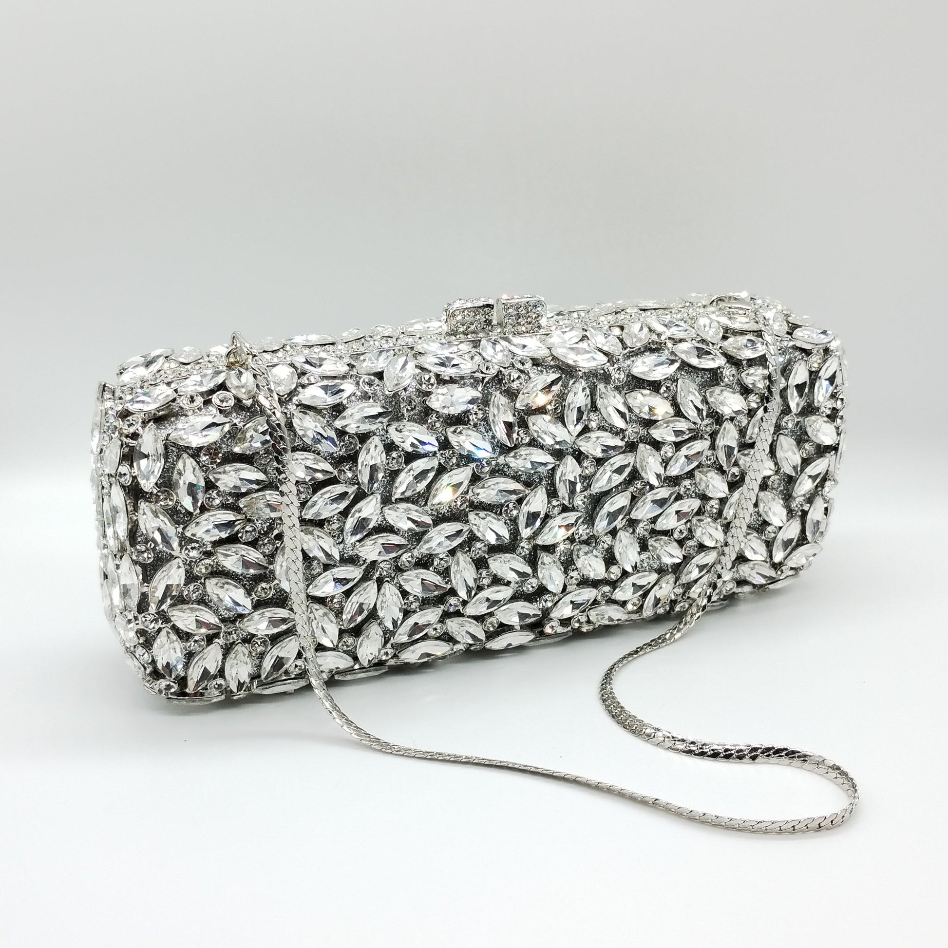 Borsetta gioiello argento con cristalli color crystal e tracolla interna removibile.