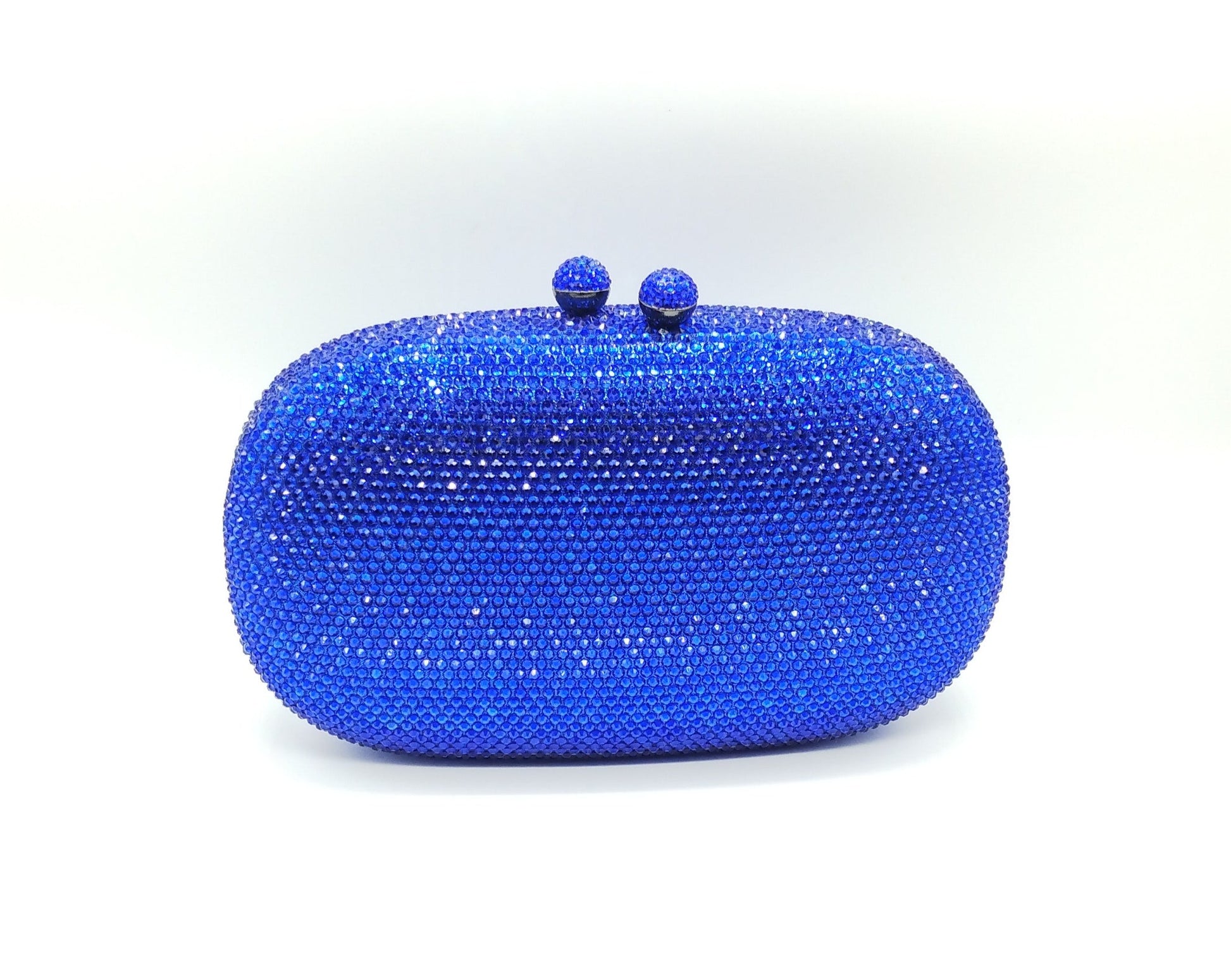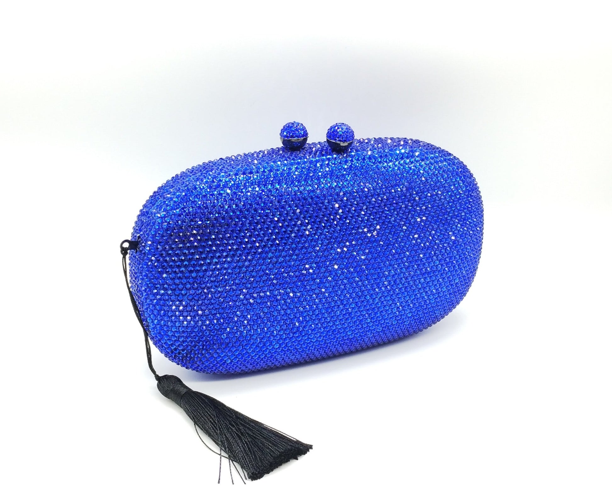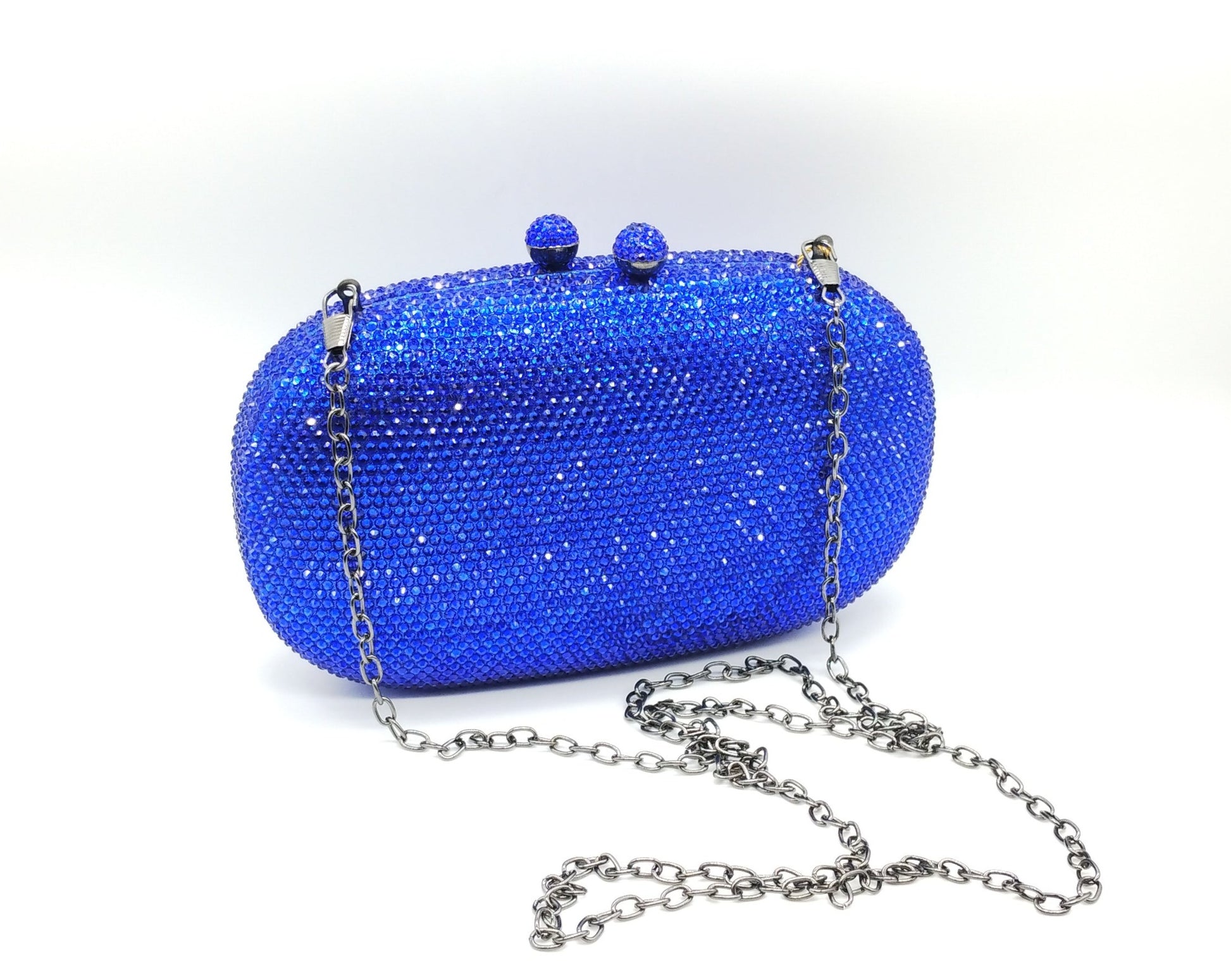 Borsetta da cerimonia rigida in strass color bluette con tracolla interna removibile.