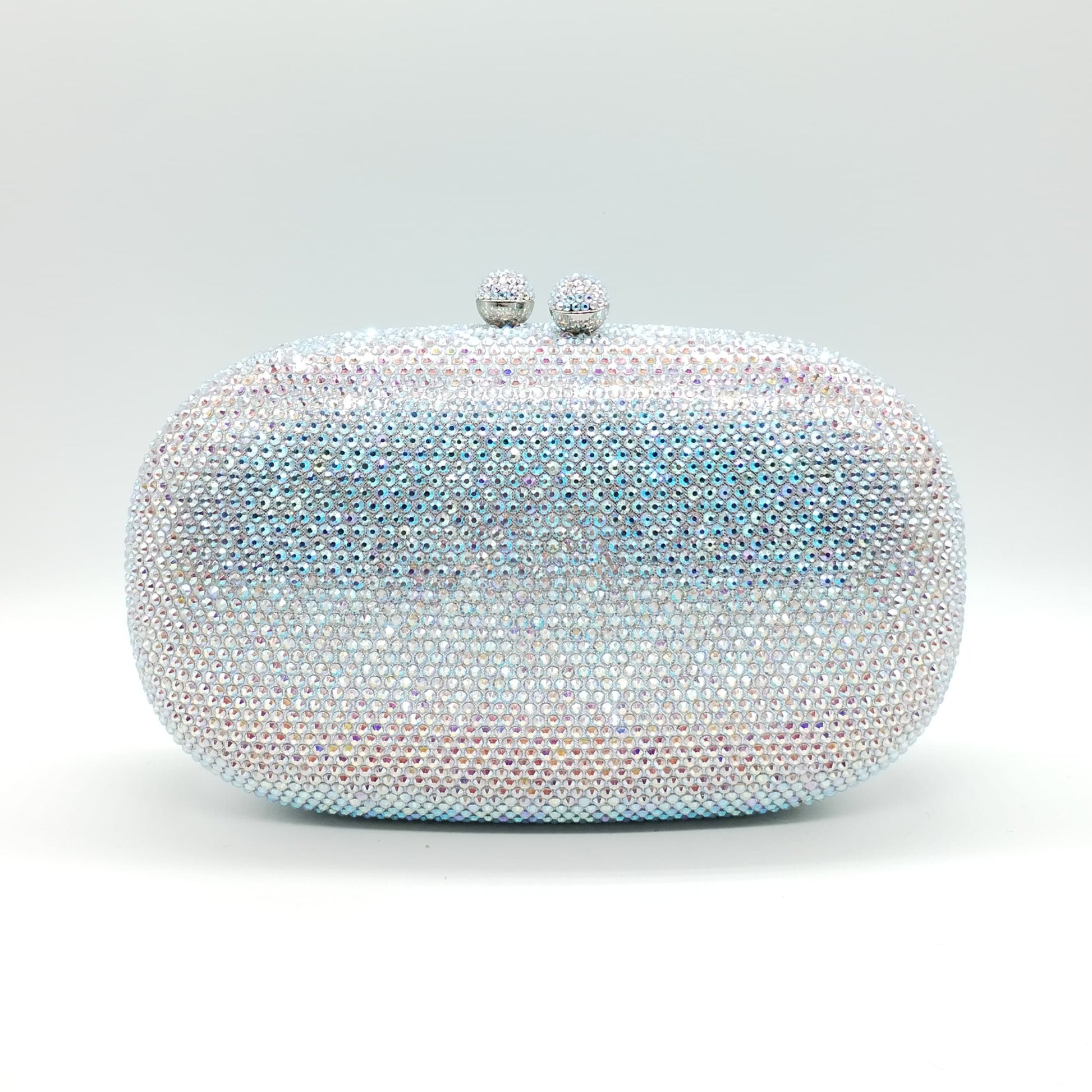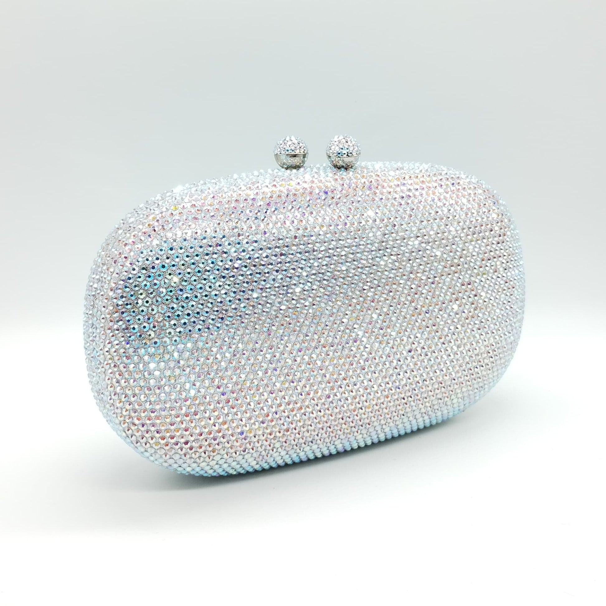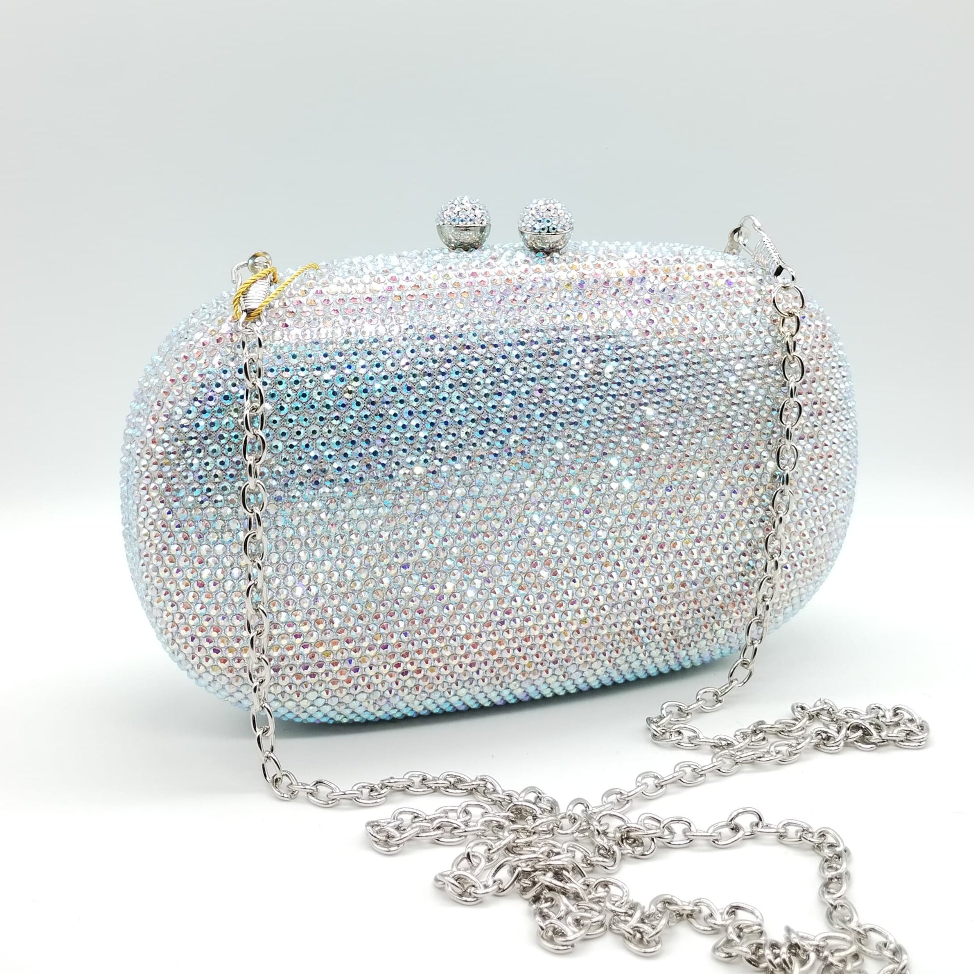 Borsetta da cerimonia rigida in strass color argento/boreale con tracolla interna removibile.