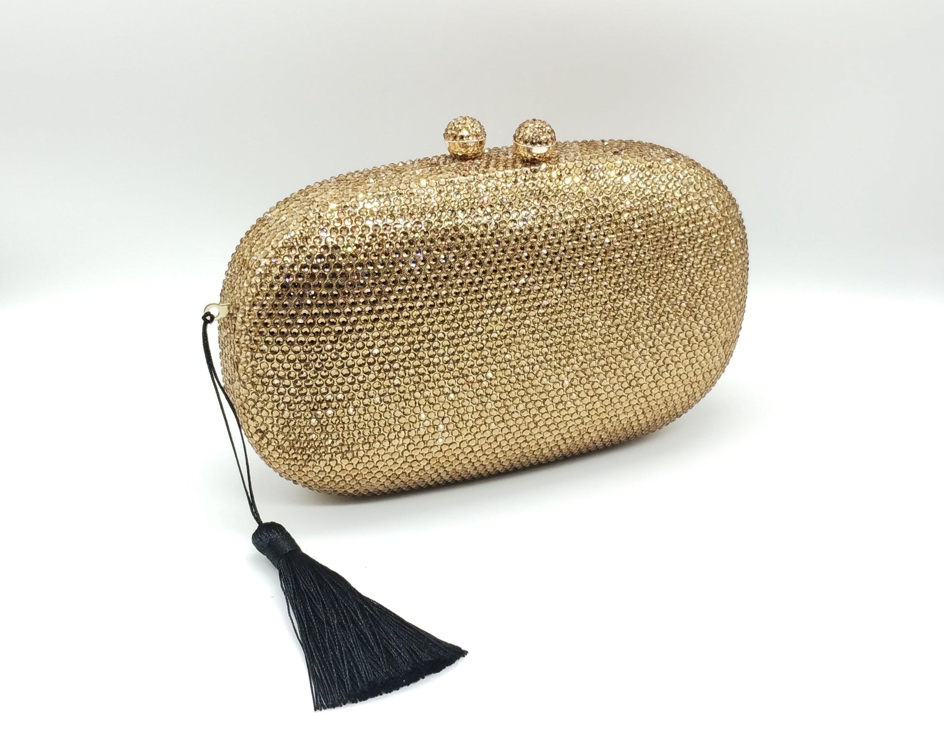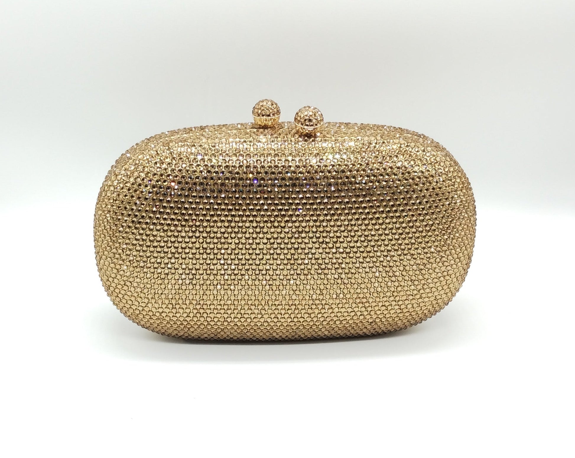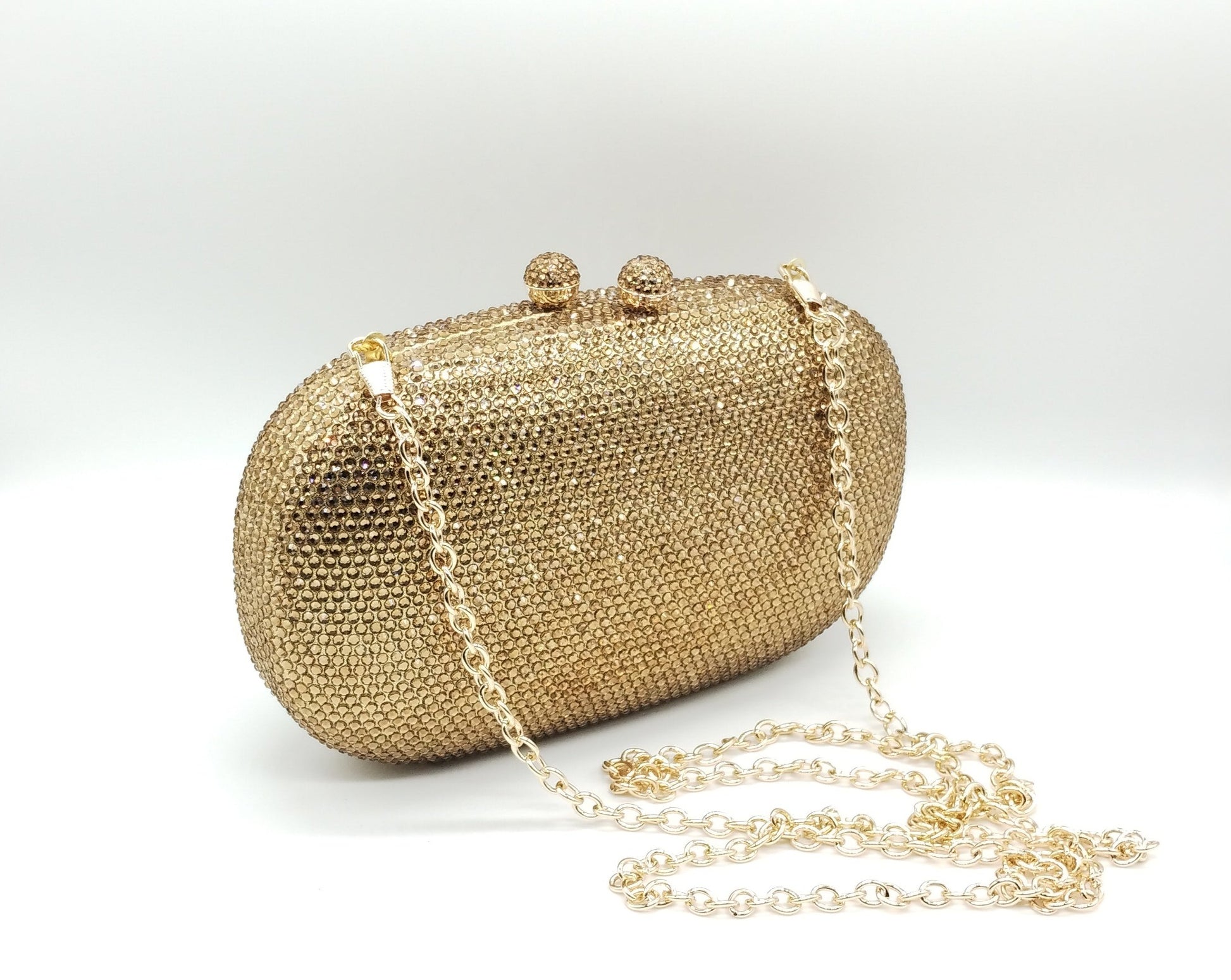 Borsetta da cerimonia rigida con strass color oro e tracolla interna removibile.