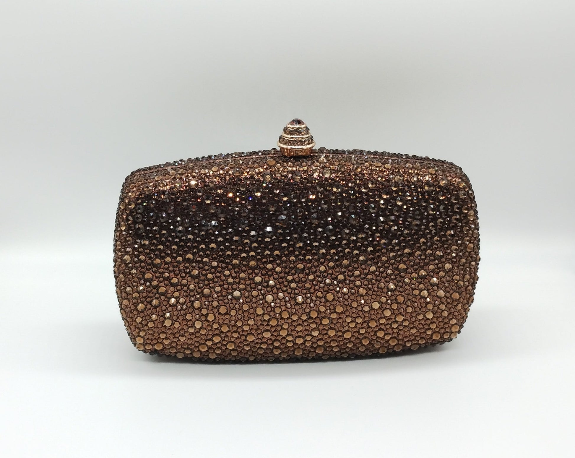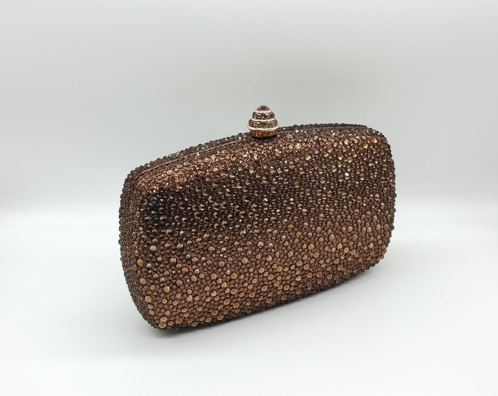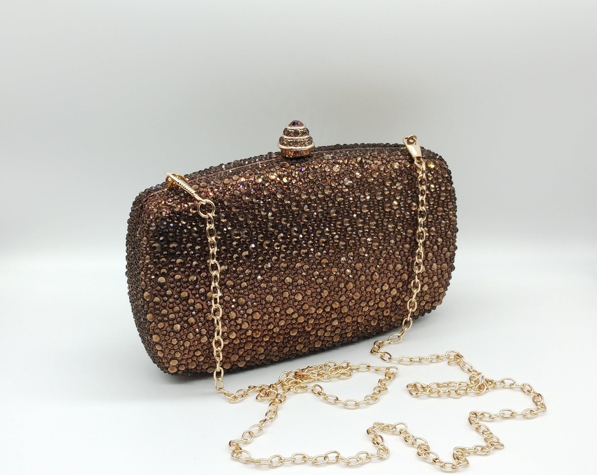 Borsetta da cerimonia rigida con strass color bronzo e tracolla interna removibile.