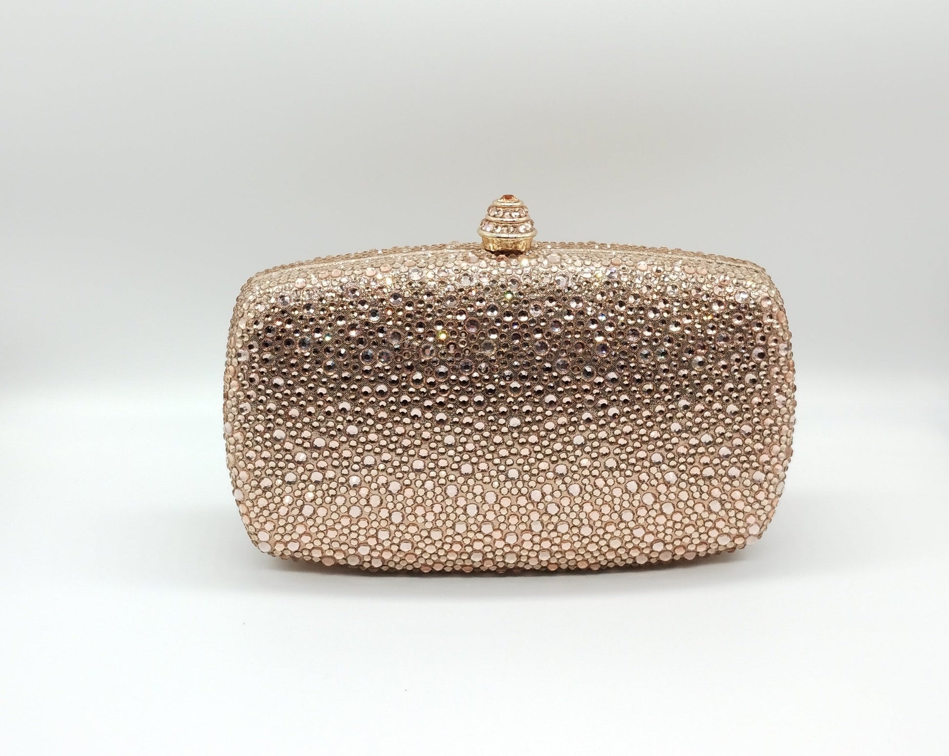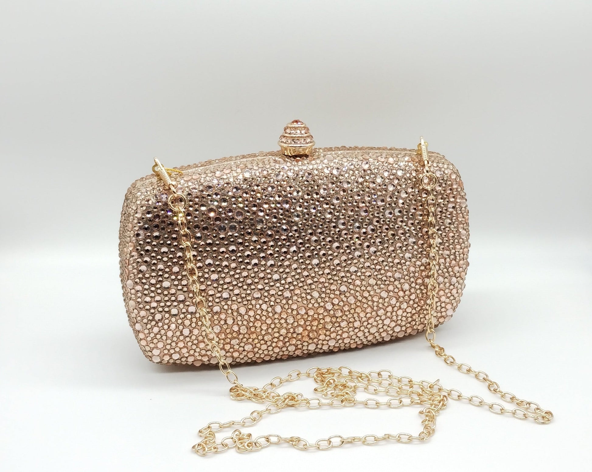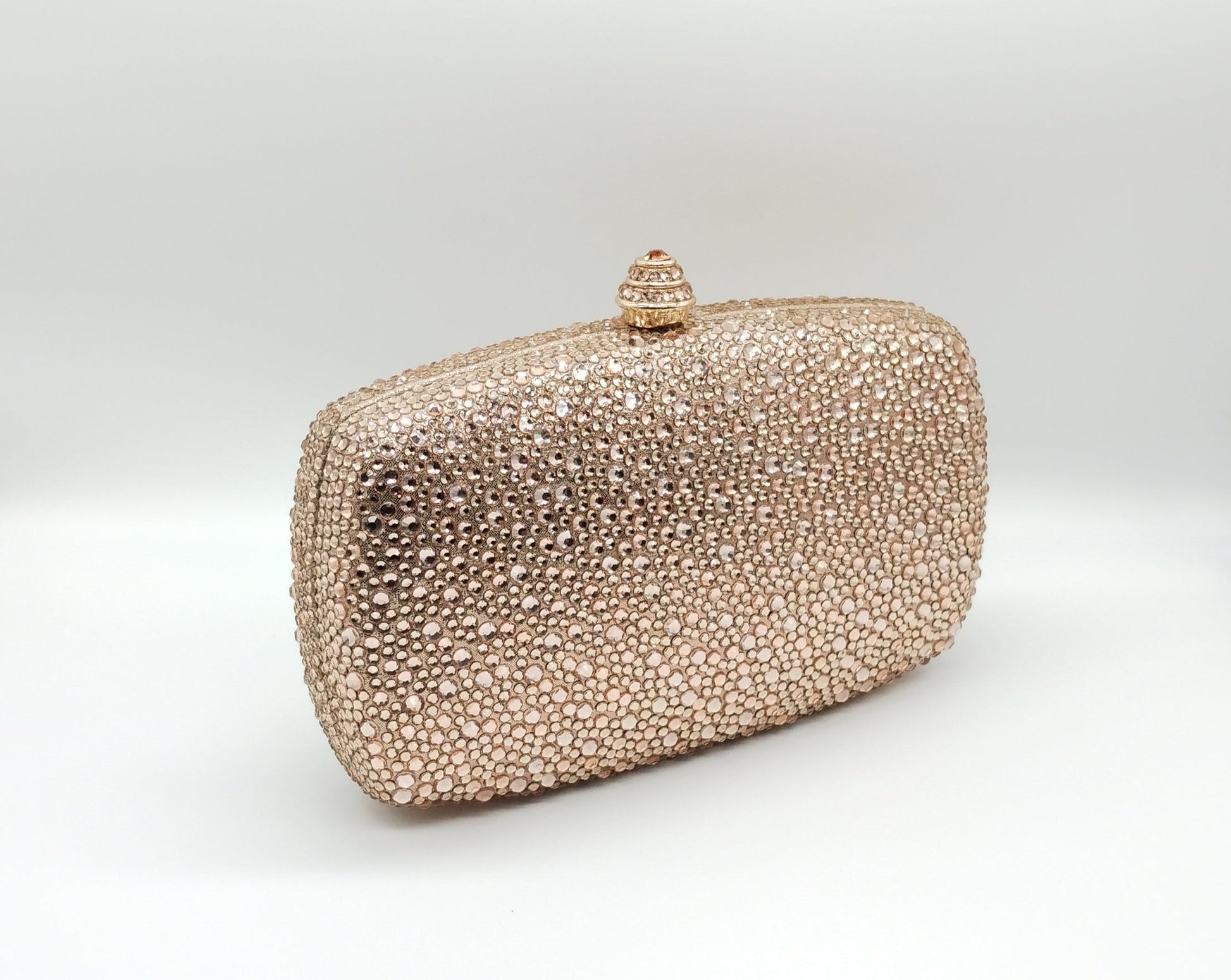 Borsetta da cerimonia rigida con strass color cipria e tracolla interna removibile.