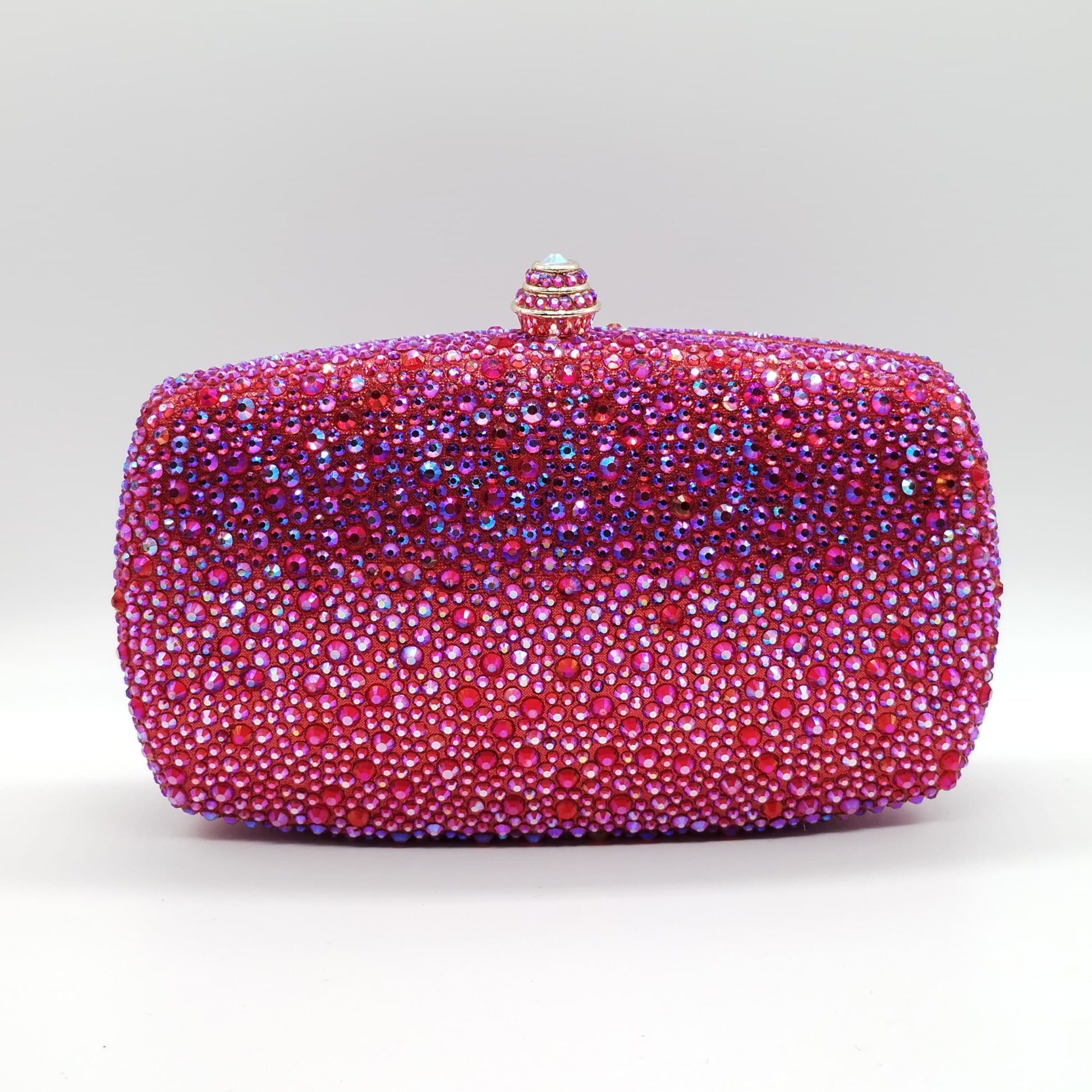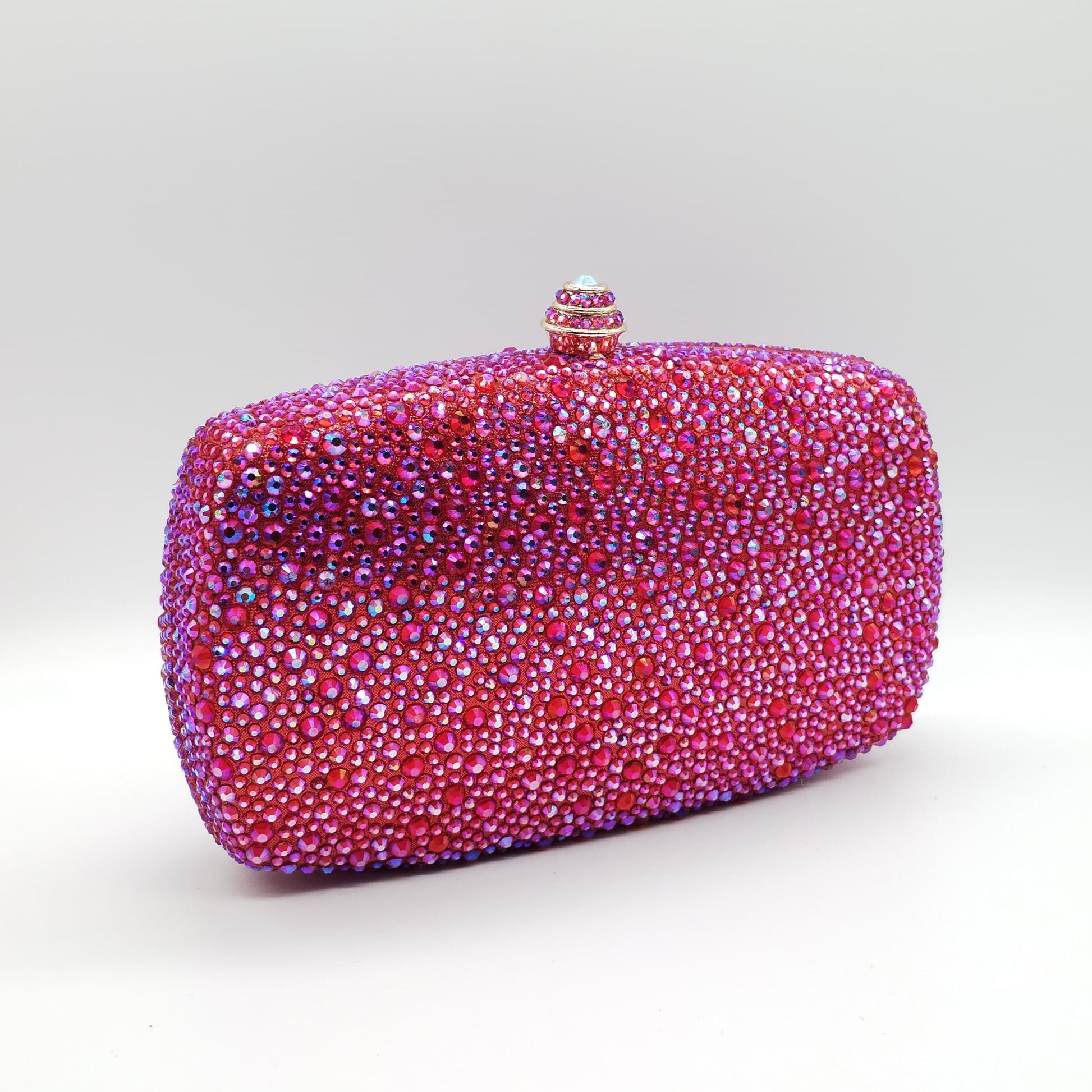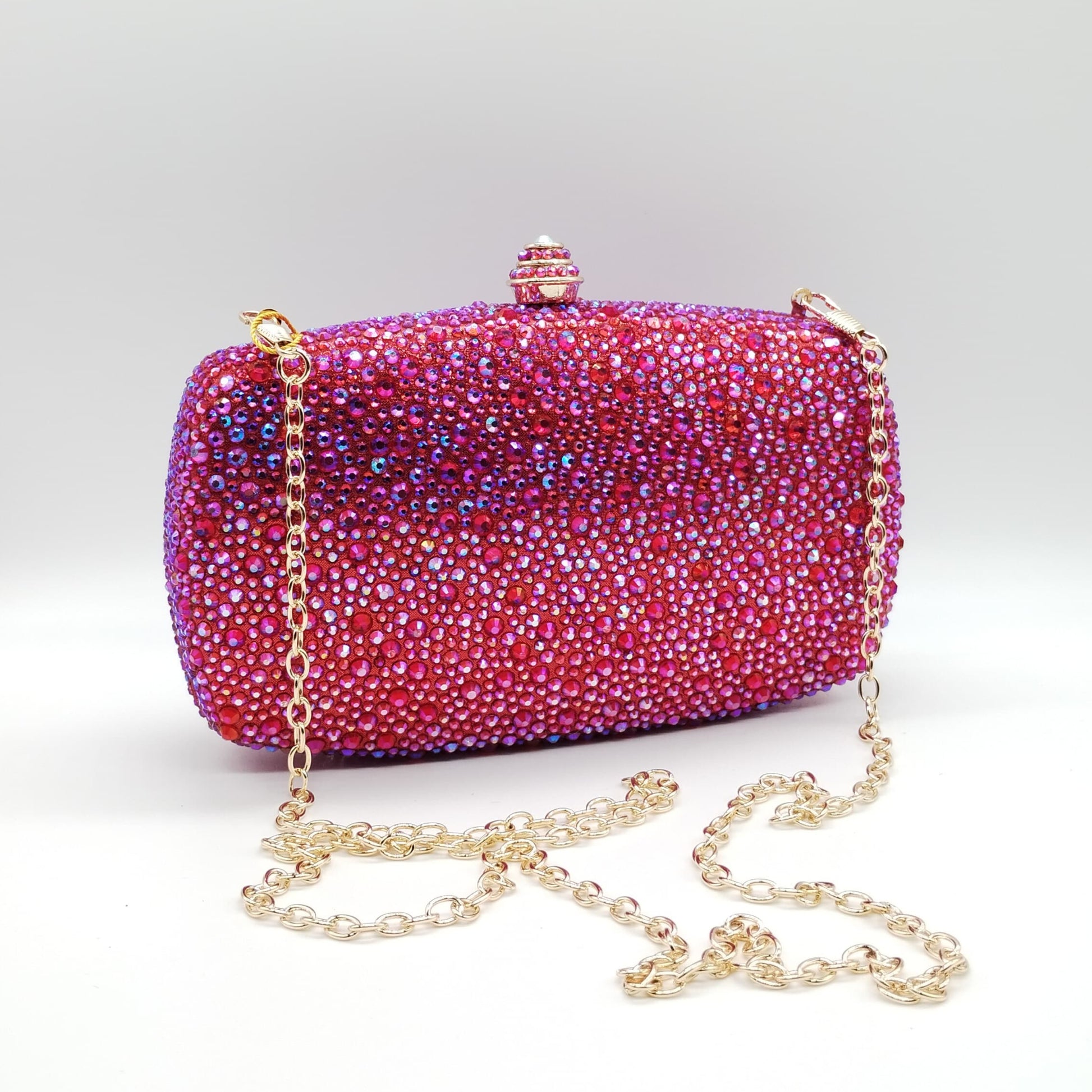 Borsetta da cerimonia rigida con strass color fucsia e tracolla interna removibile.