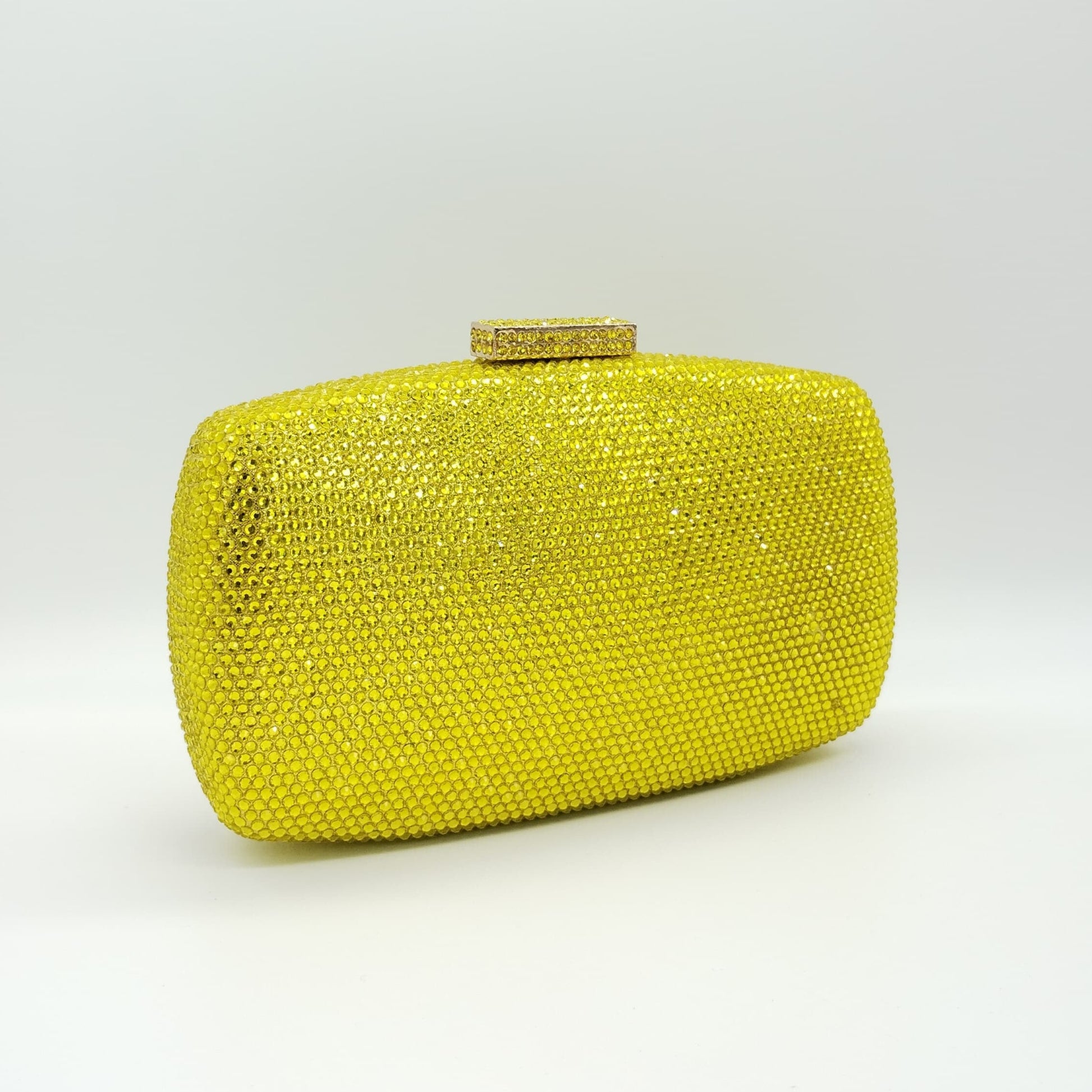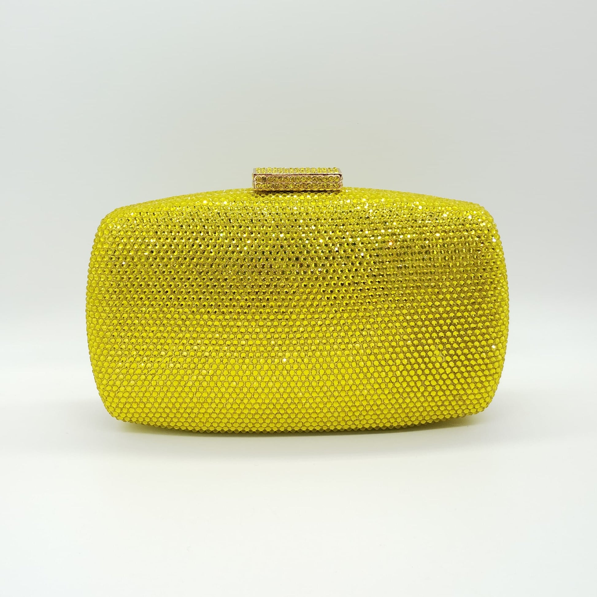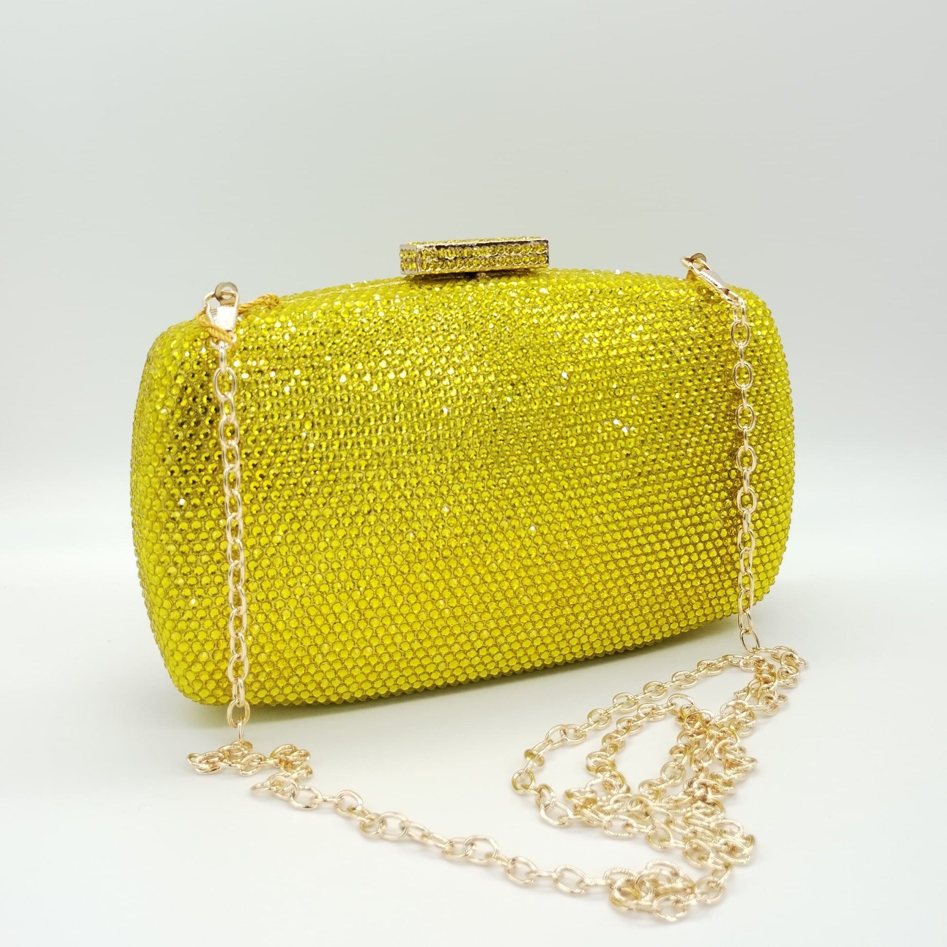 Borsetta da cerimonia rigida con strass color giallo e tracolla interna removibile.