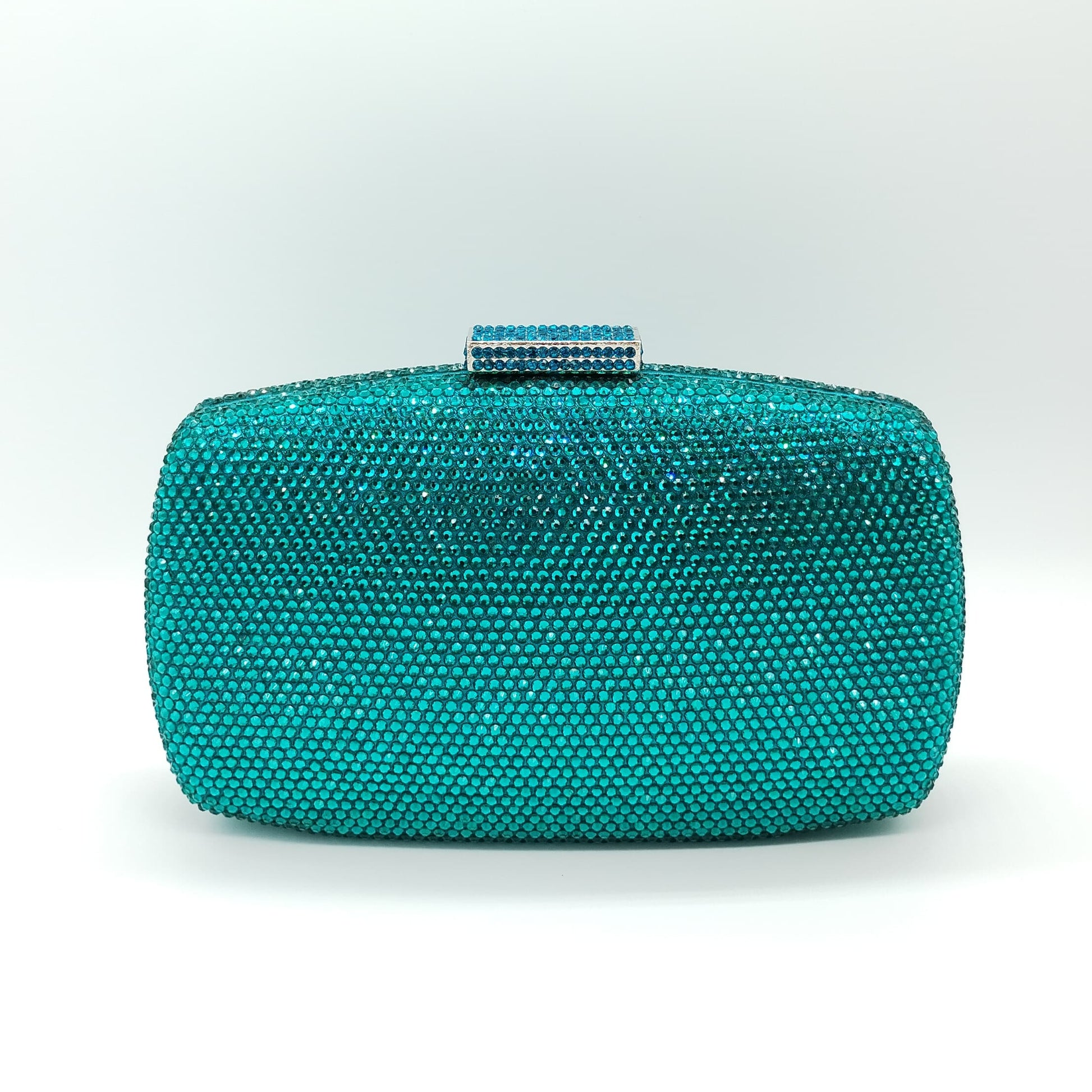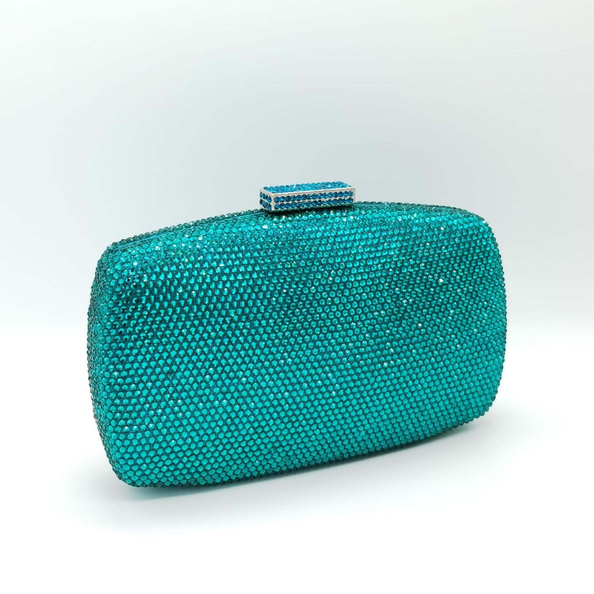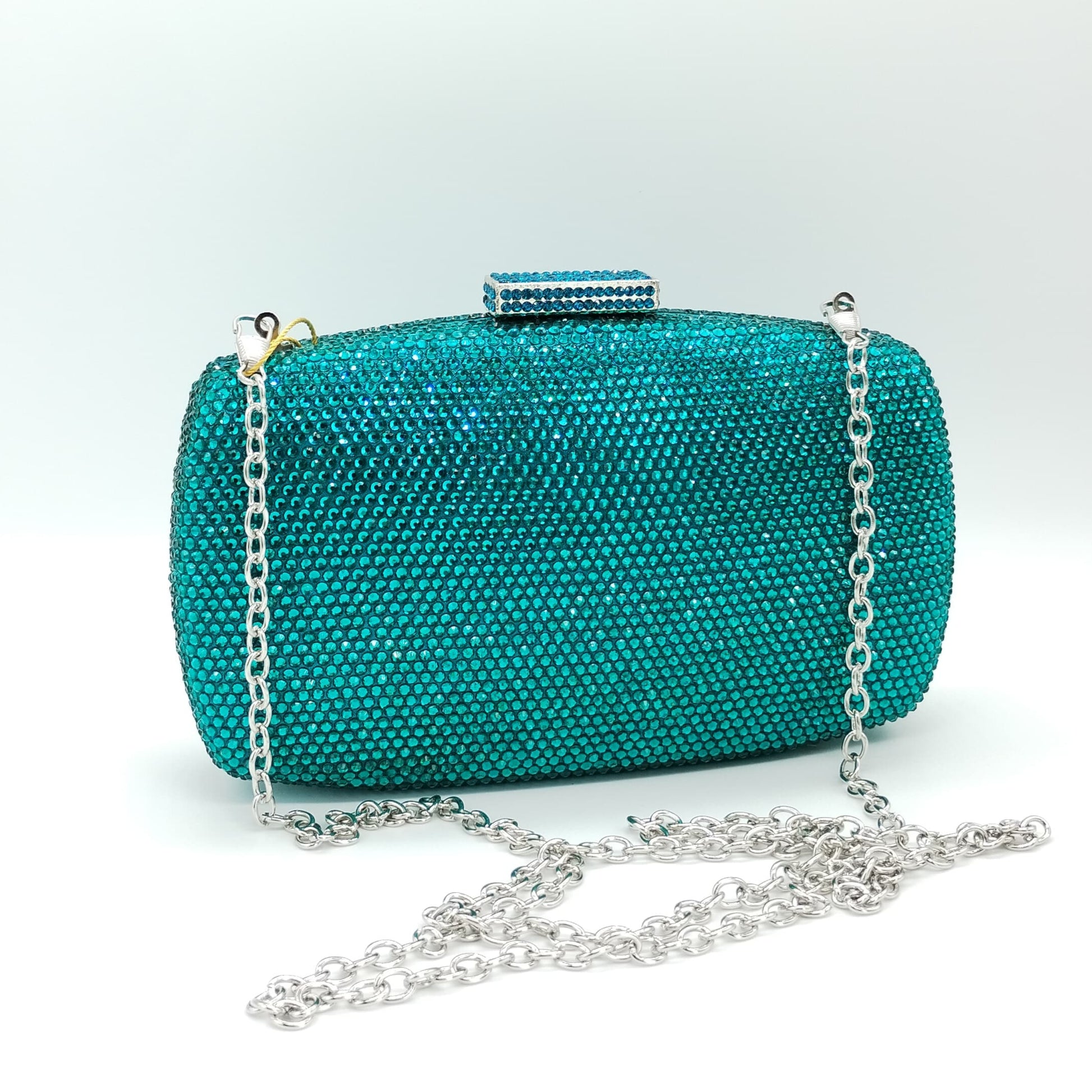 Borsetta da cerimonia rigida con strass color verde petrolio e tracolla interna removibile.
