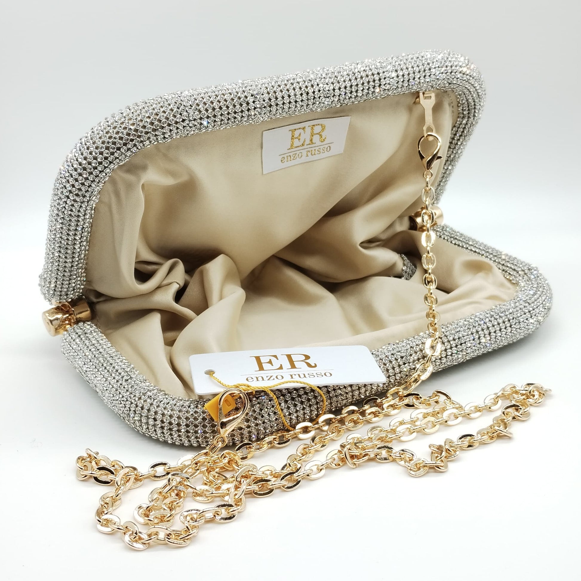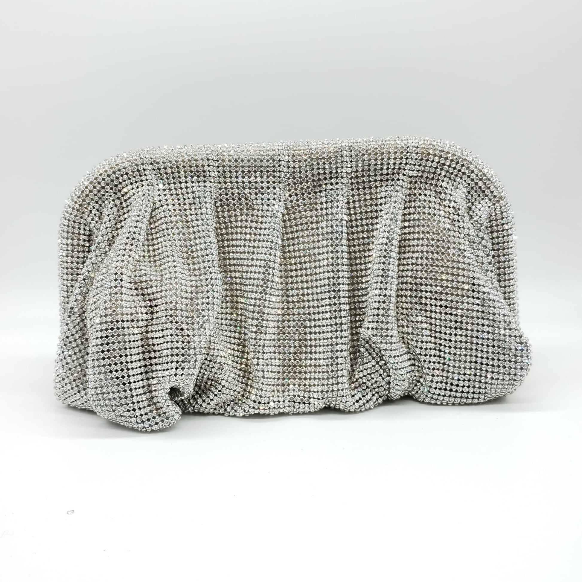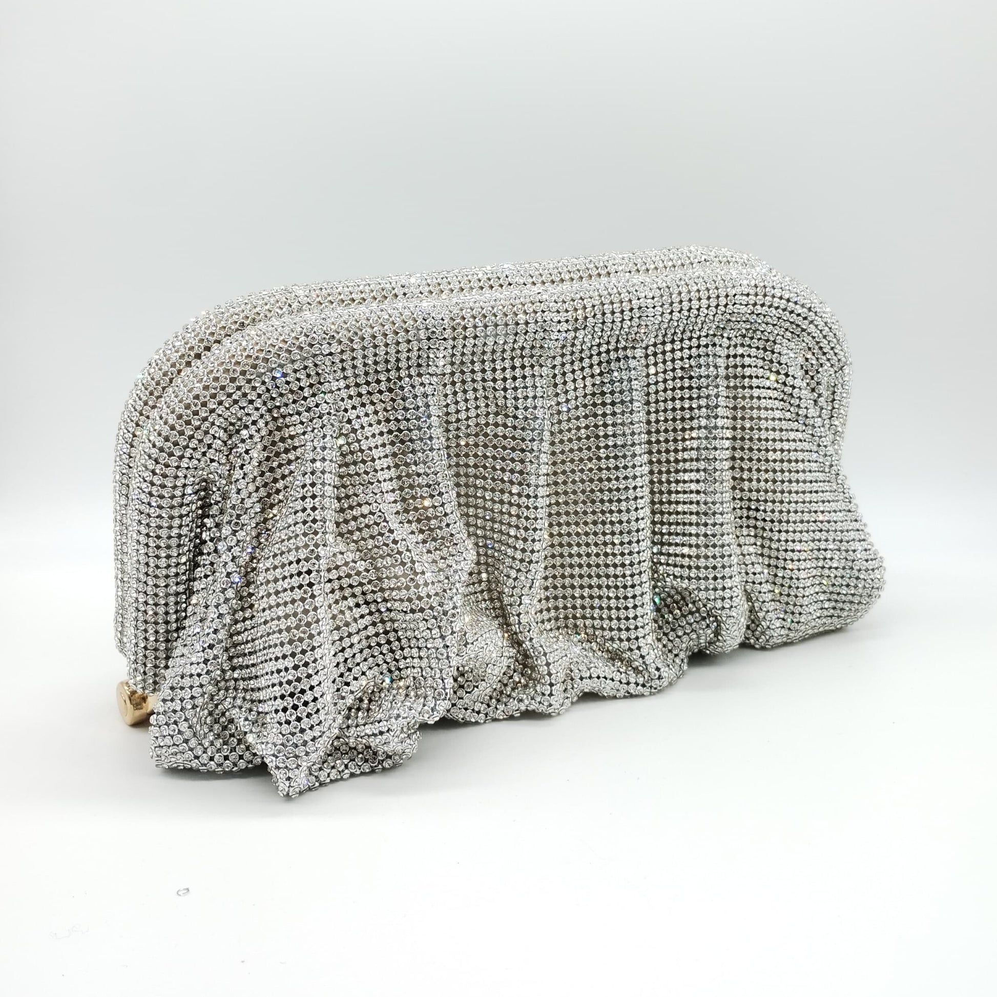 Borsetta da cerimonia morbida in tessuto e strass color argento con tracolla interna removibile