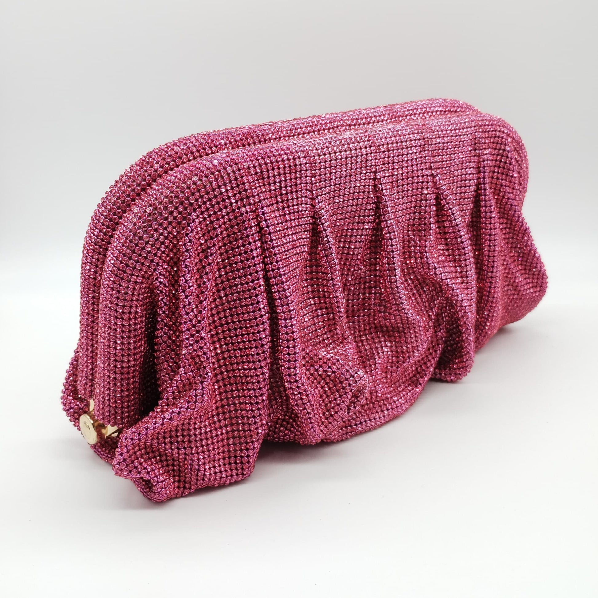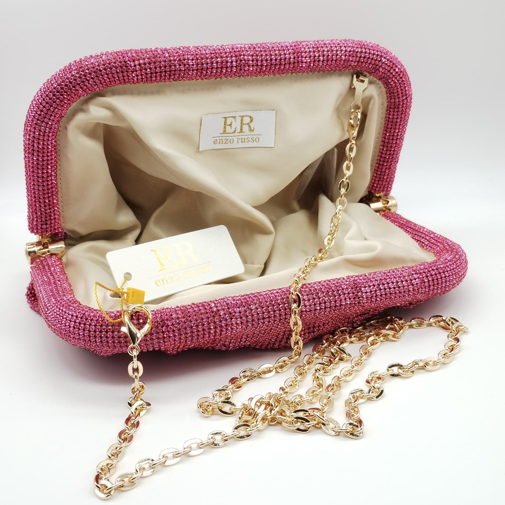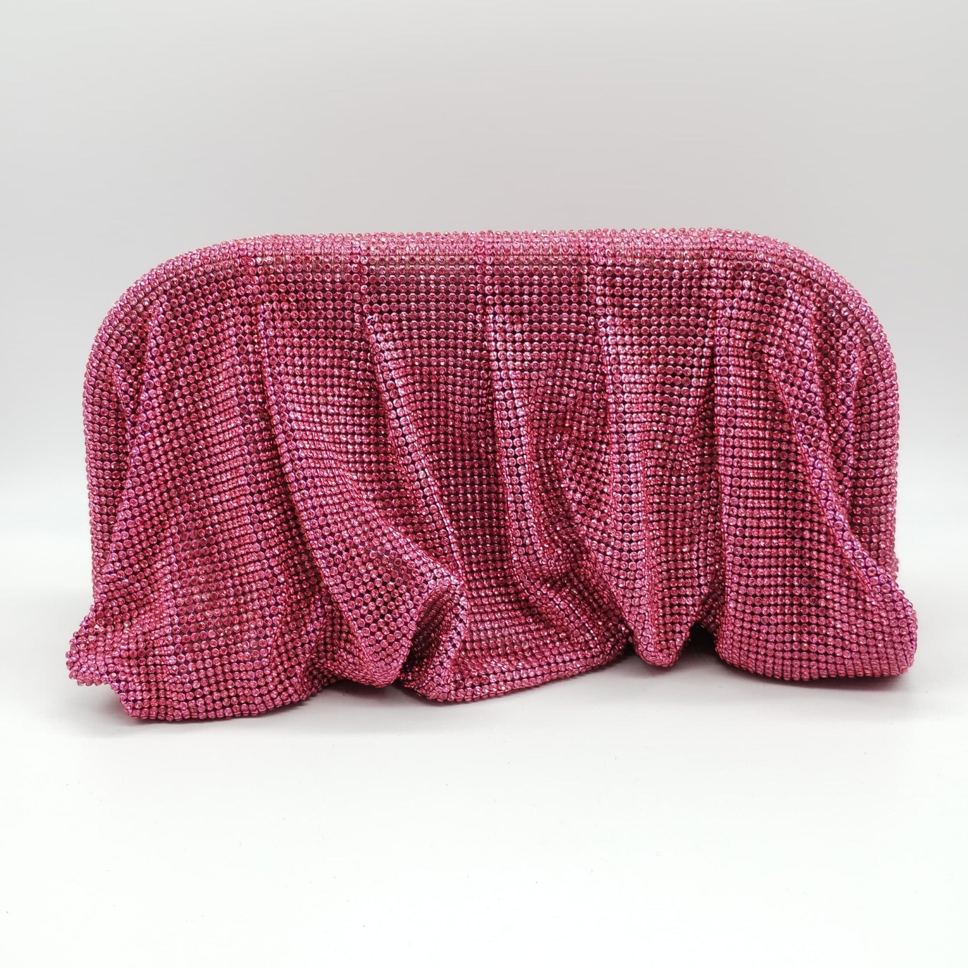 Borsetta da cerimonia morbida in tessuto e strass color fucsia con tracolla interna removibile