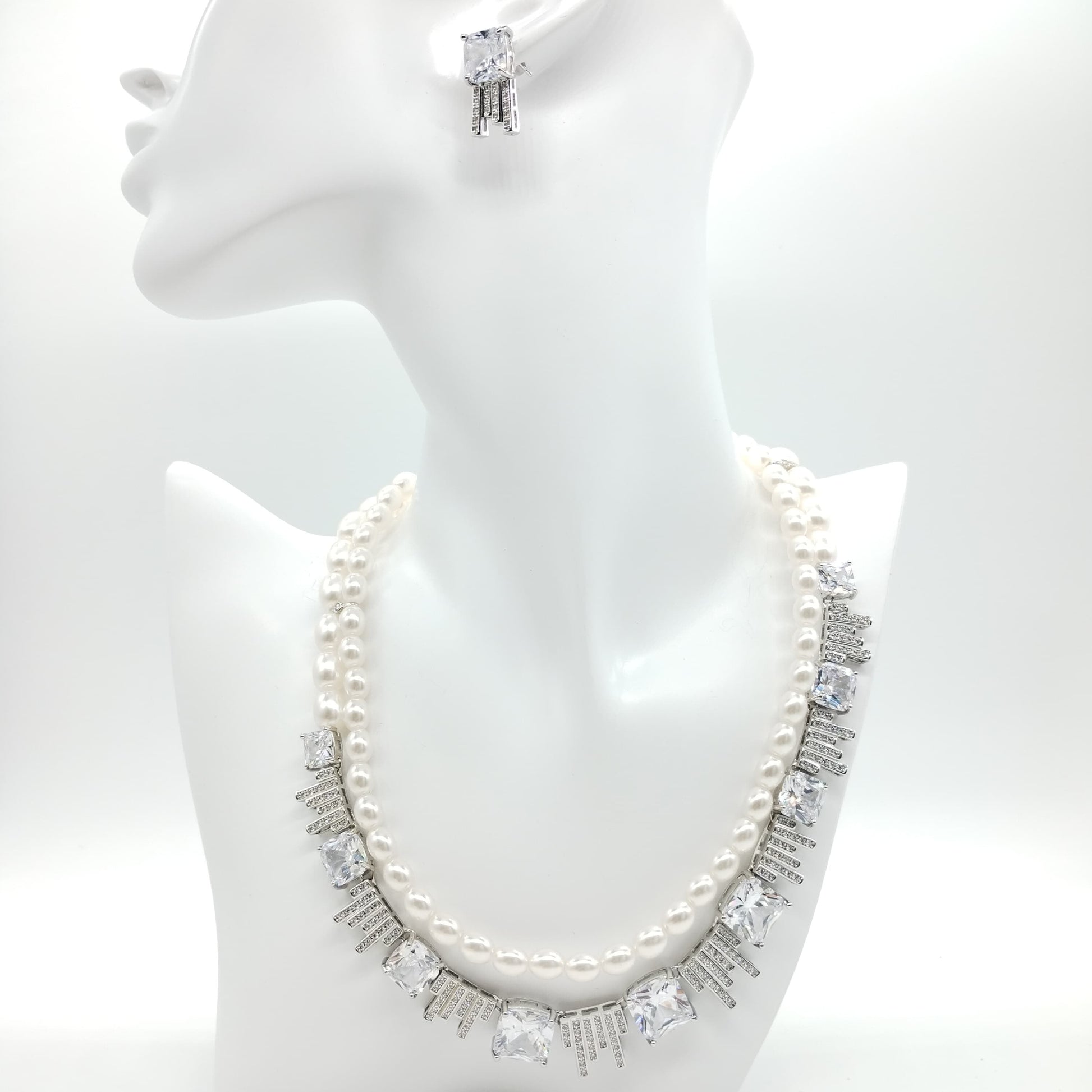 Parure di zirconi color crystal con perle composta da collana e orecchini con rodiatura in argento