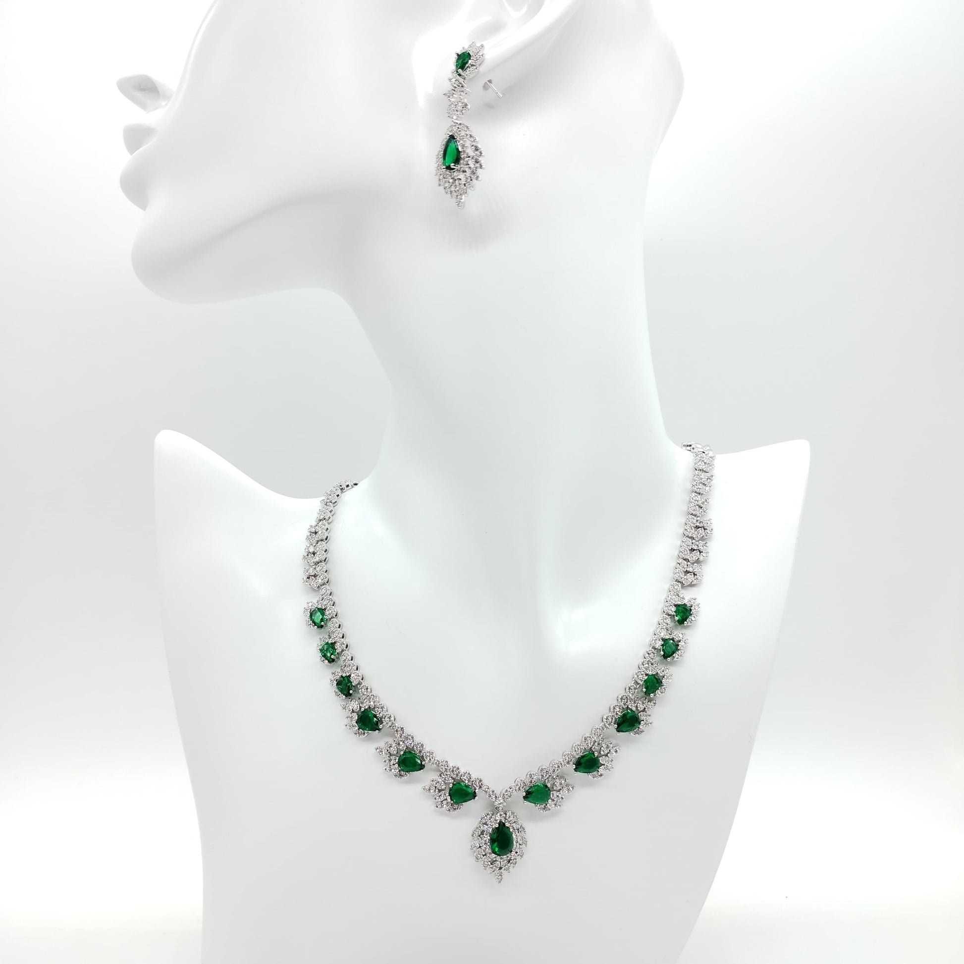 Parure di zirconi color crystal e verde composta da collana e orecchini con rodiatura in argento