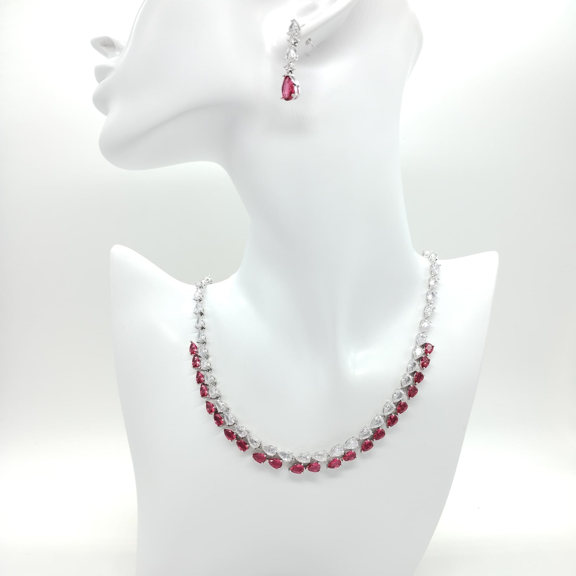Parure di zirconi color crystal e rosso composta da collana e orecchini con rodiatura in argento