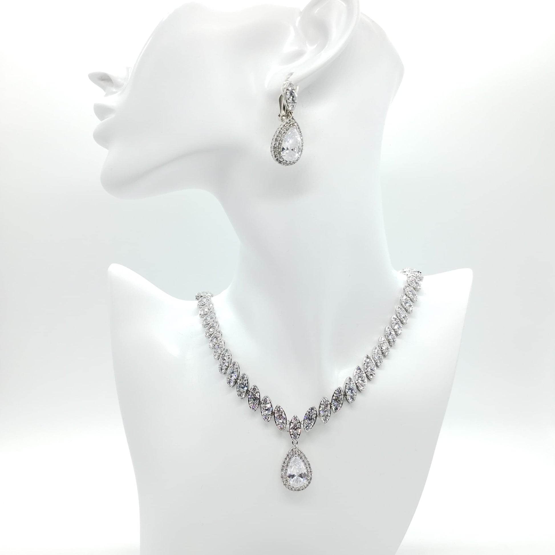 Parure di zirconi color crystal composta da collana e orecchini clip con rodiatura in argento
