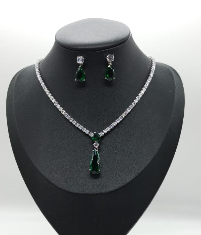 Parure di zirconi color crystal e verde composta da collana e orecchini con rodiatura in argento