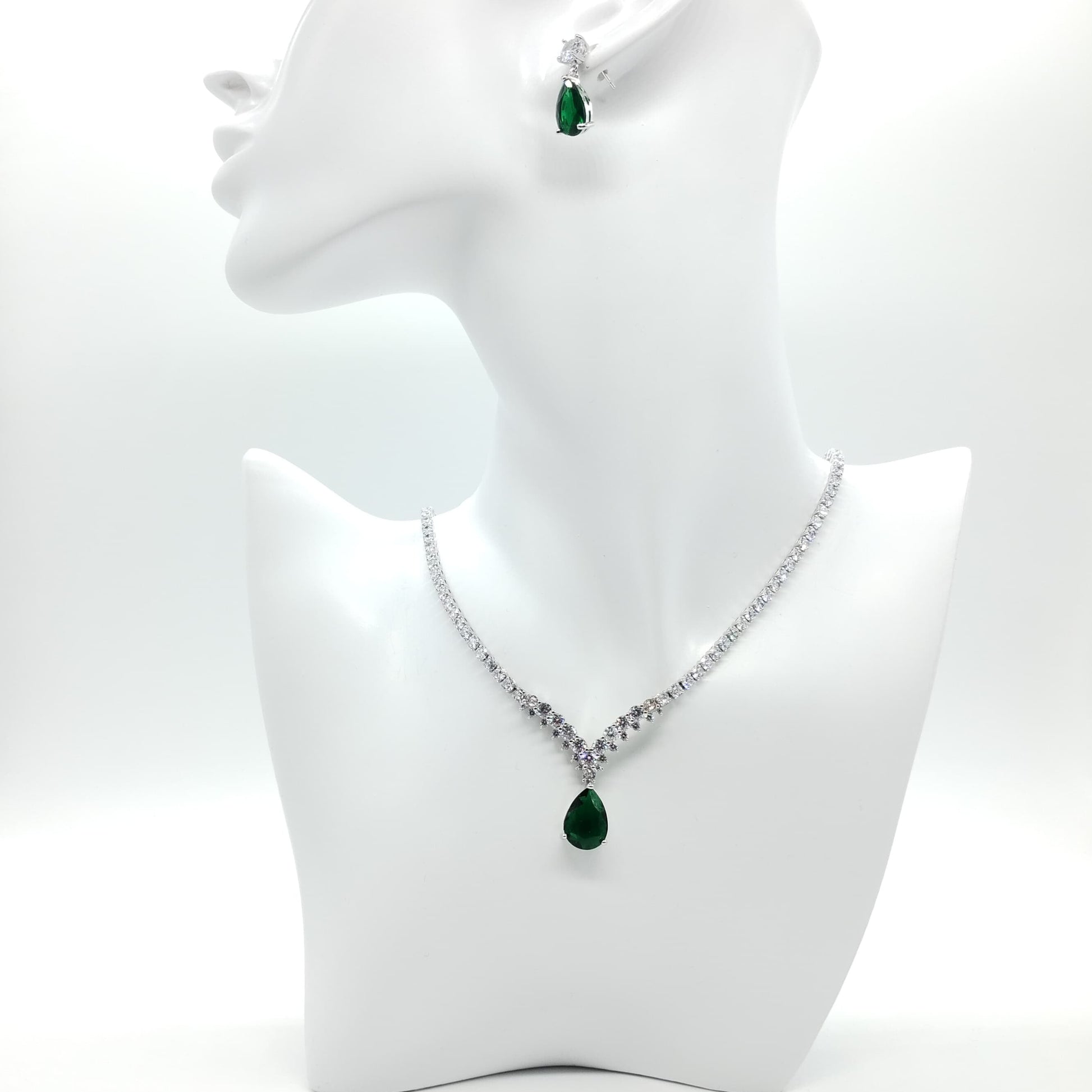 Parure di zirconi color crystal e verdi composta da collana e orecchini con rodiatura in argento