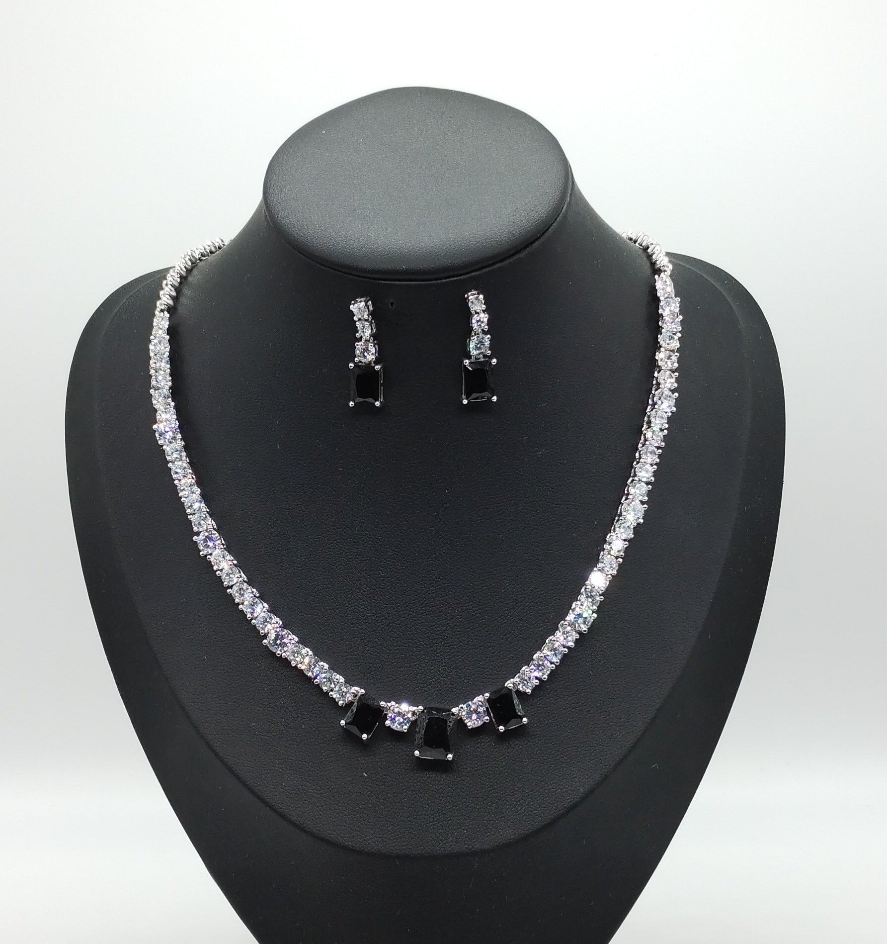 Parure di zirconi color crystal e neri composta da collana e orecchini con rodiatura in argento