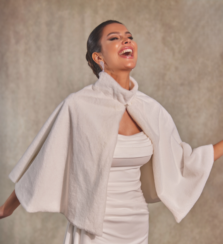 Mantella da sposa in pelliccia color bianco con chiusura strass